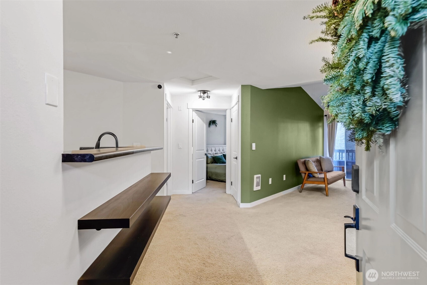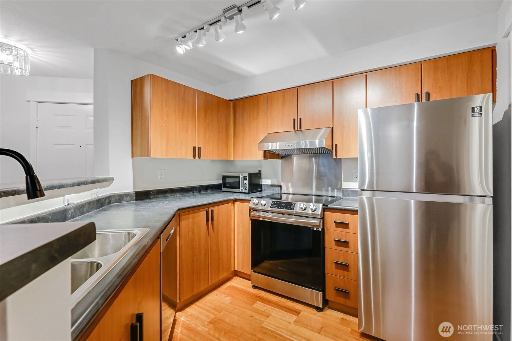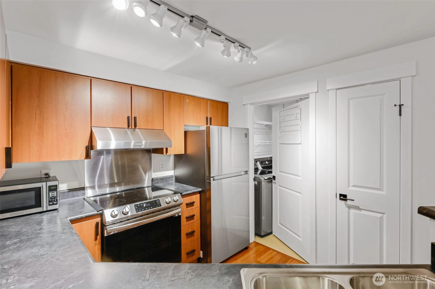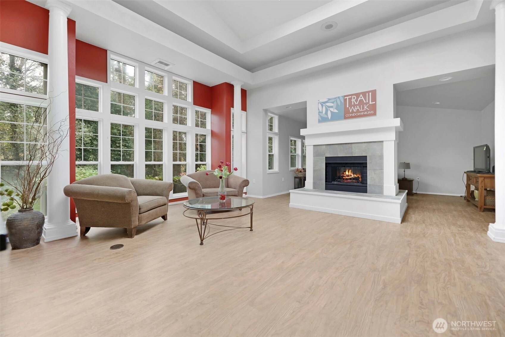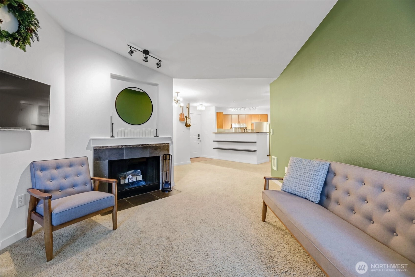 Discover comfort and convenience in this top-floor corner condo at Trail Walk! Vaulted ceilings and a cozy wood-burning fireplace create a warm, inviting living space, while the private deck offers a peaceful retreat. The updated kitchen features modern appliances, stylish finishes. The spacious bedroom fits a king bed, includes a walk-in closet, and provides direct deck access. Enjoy in-unit laundry, ample storage, and secure garage parking w/Elevator. Smart-home features add ease to everyday living. Just steps from parks, shopping, dining, and the Burke-Gilman Trail, plus access to a clubhouse with pool, year-round hot tub, and fitness center. A move-in ready home in a prime location—don’t miss this opportunity!