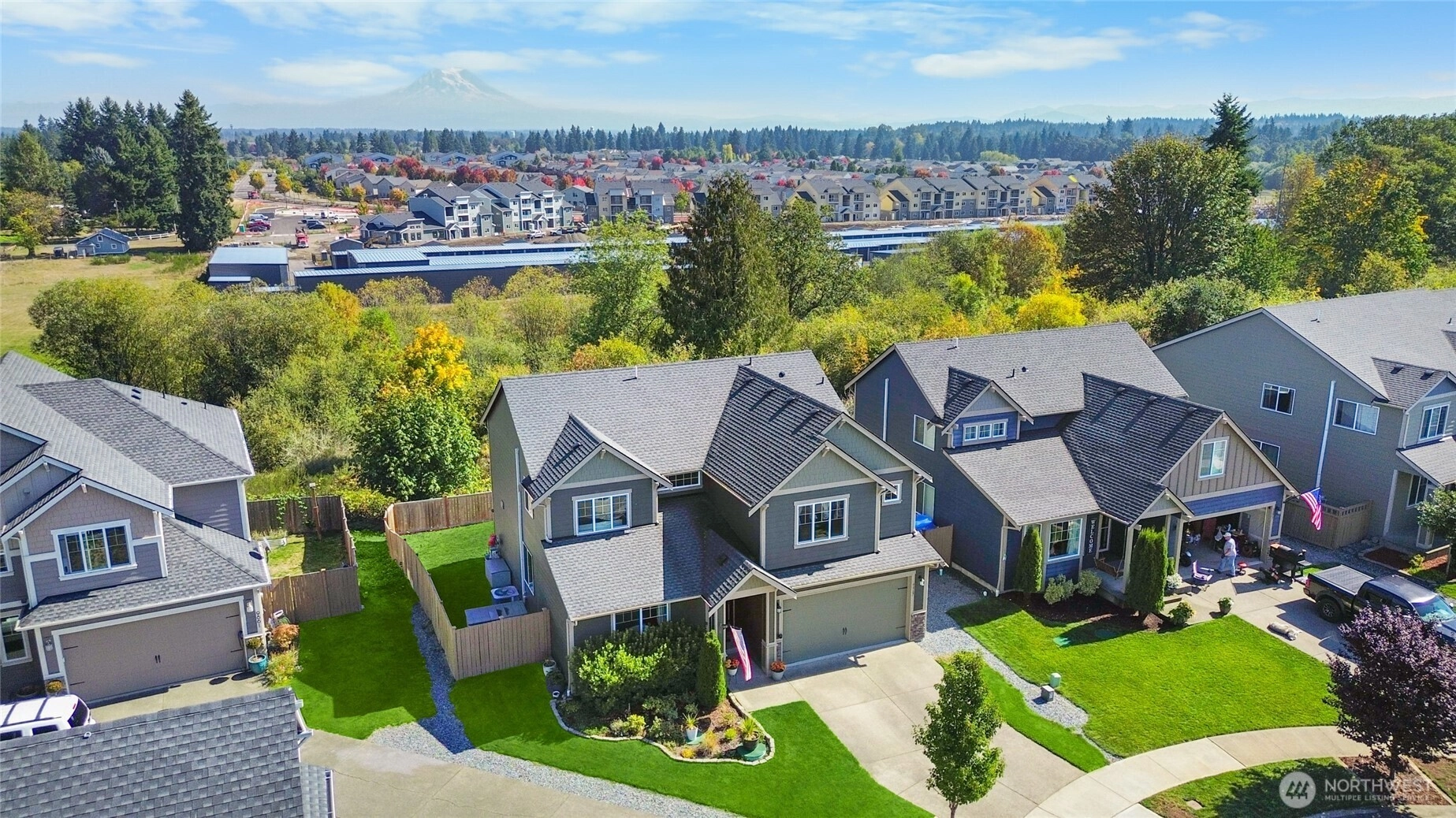 This stunning newer construction 4-bedroom home sits on a private, fully fenced, corner lot which backs up to a greenbelt with unobstructed views of Mount Rainier. Step inside to soaring ceilings & new luxury vinyl plank flooring that flows through the main level. The gourmet kitchen w/quartz countertops, a pantry & coffee nook seamlessly connects to a spacious living area w/cozy gas fireplace, a formal dining room, and an additional flex living space Upstairs, a loft, primary suite w/vaulted ceiling & a luxury 5-piece bath w/soaker tub & walk-in shower, 3 more bedrooms, a 2nd full bath & a huge recreation room w/potential for 5th bedroom. AC & Wired for EV. Walk to the park, close to shops, restaurants & schools. Easy access to JBLM.