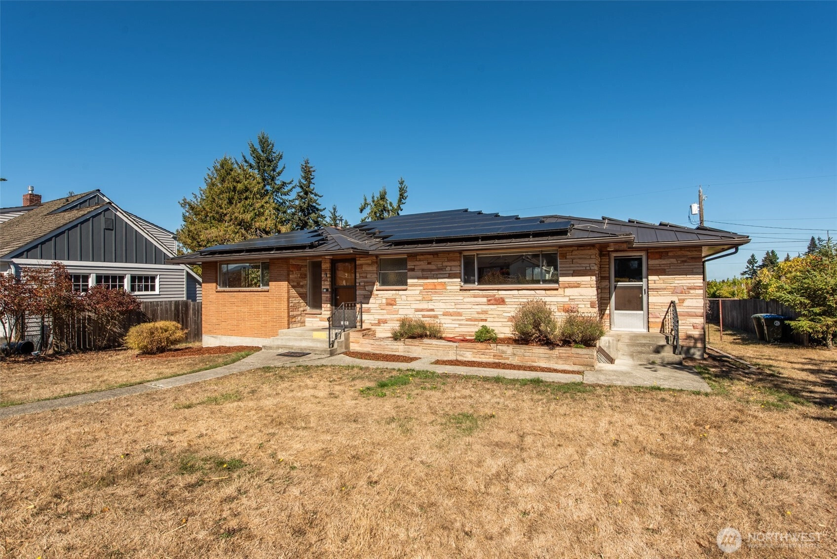 Beautiful home on oversized lot with mountain views. Built in 1955, this one-story home with a daylight basement has a Midcentury Modern feel. Spacious 2,248 square feet of bright living space. Main level includes 2 bedrooms + 1 full bathroom, large living room, dining room and kitchen with eating space. Lower level offers a second living room, office that could be used as a 3rd bedroom, 3/4 bathroom, sauna & soaking tub. Each level equipped with a ductless heat pump and wood stove. One car attached garage has tons of extra space for hobbies & storage, includes x3 220 outlets. Metal roof with solar panels offers longevity and a reduced utility bill. Private backyard has a patio, storage house and off-street parking. Great central location!