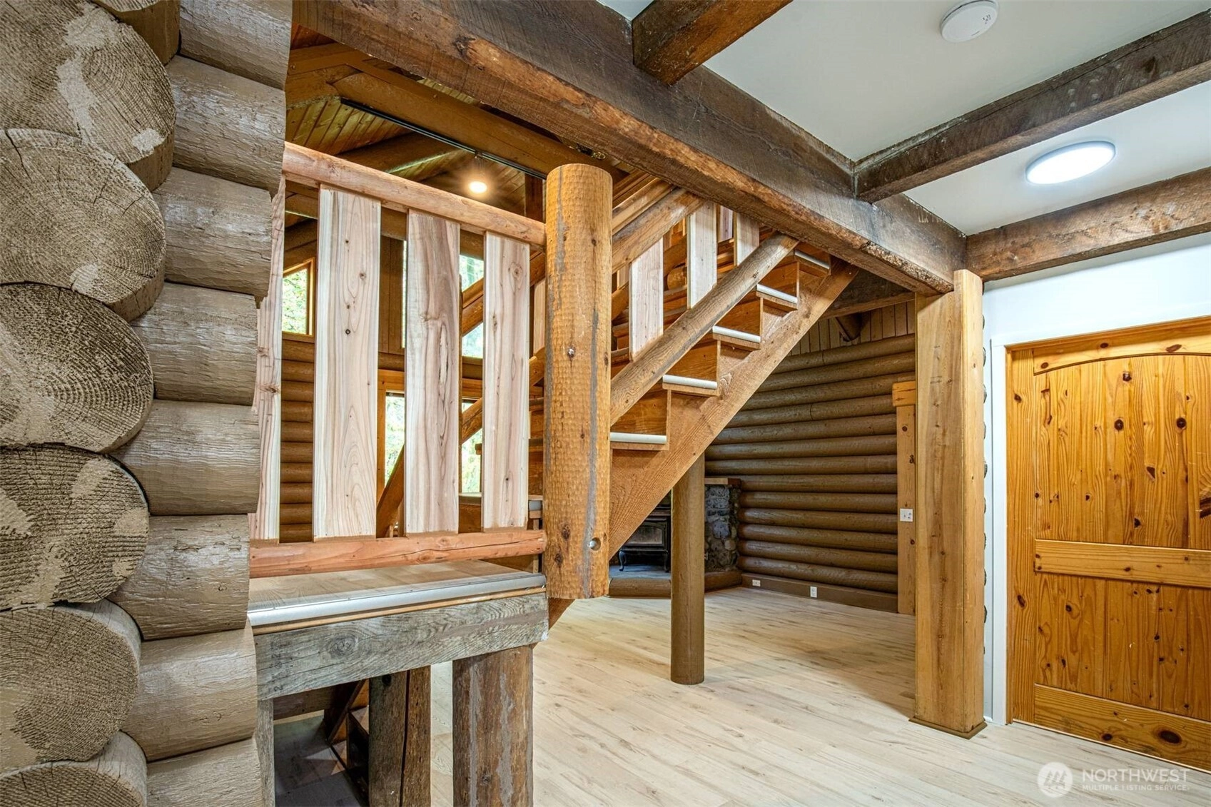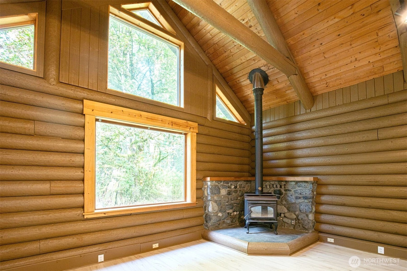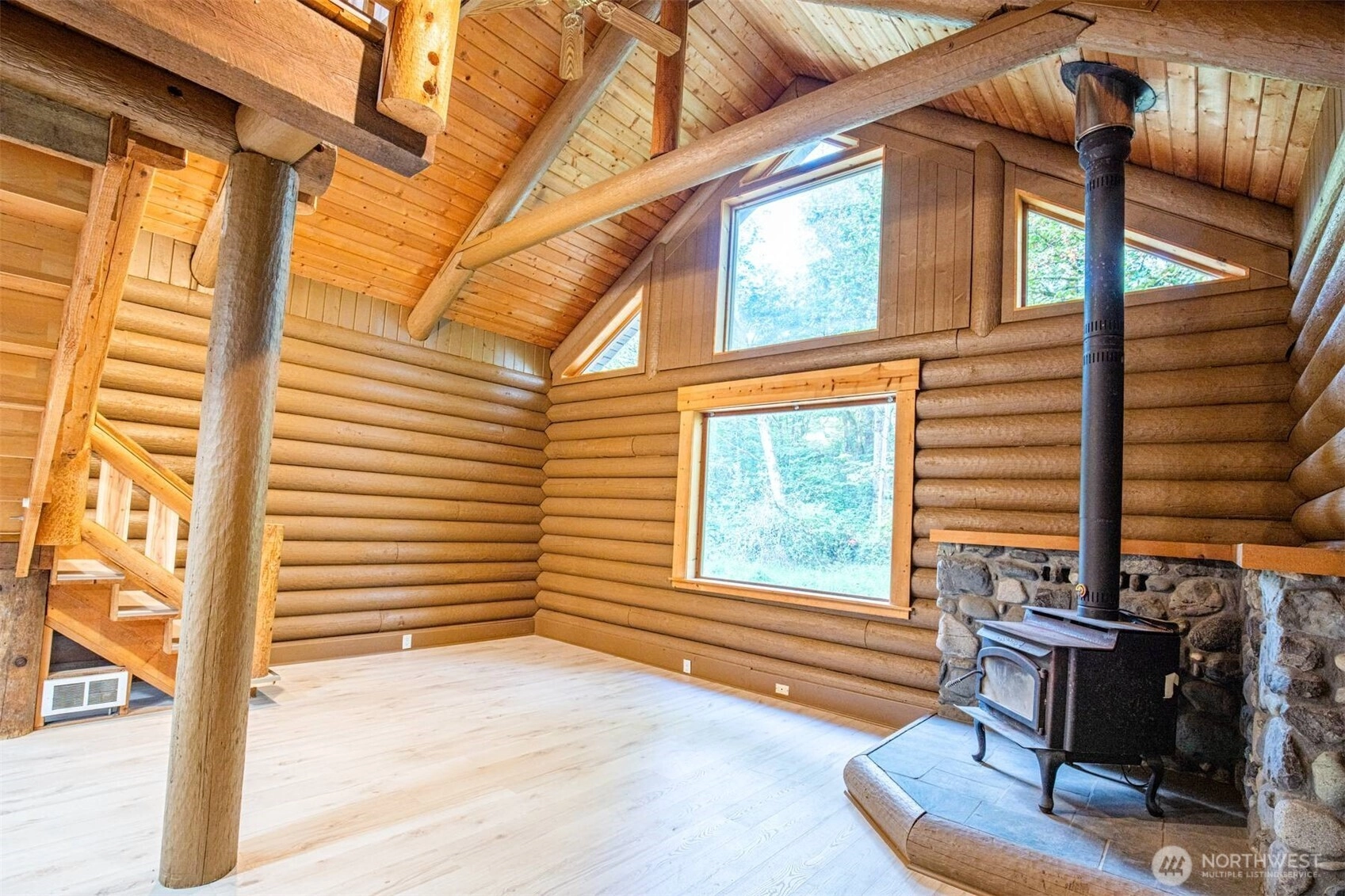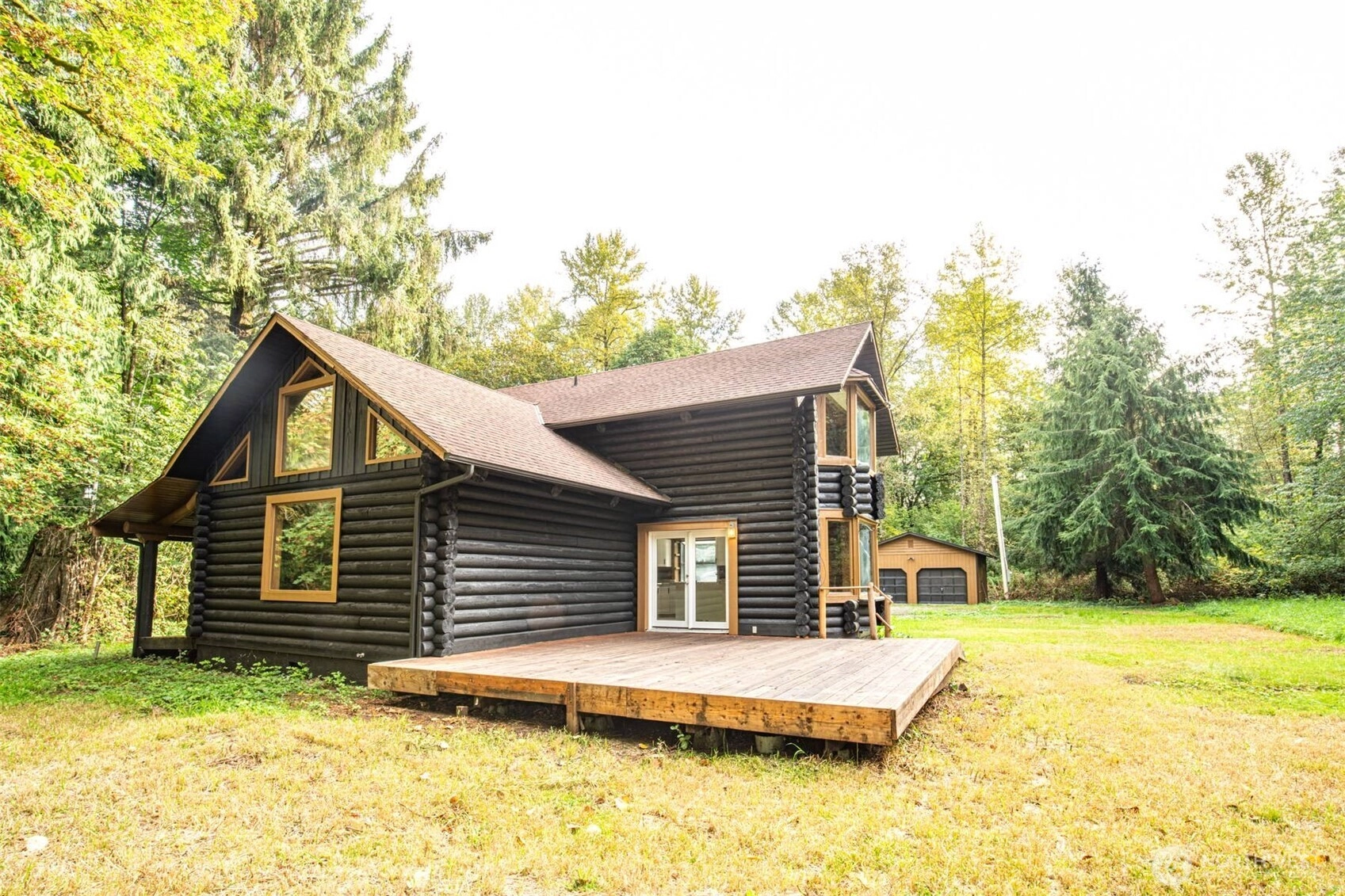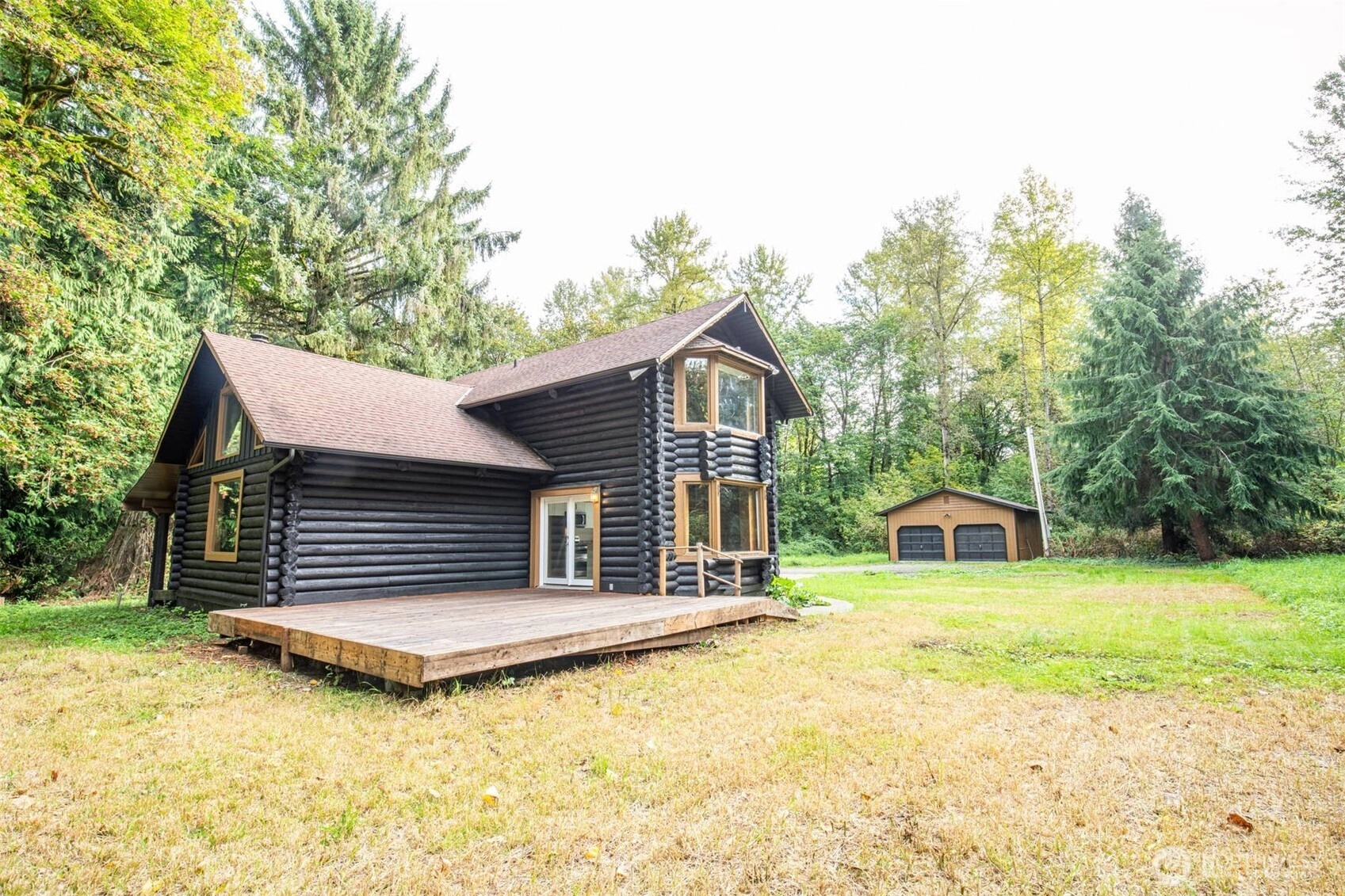 Discover this move-in ready 2-bed, 2-bath log cabin on 3.8 private acres, a dream for outdoor enthusiasts! Surrounded by nature, it features a detached two-car garage with space for all your gear. Inside, enjoy an updated kitchen with granite countertops, a large island, and durable LVP flooring. The living room offers a warm fireplace and abundant natural light. Step out from the dining room onto a private deck, perfect for relaxing or entertaining. The main level includes a walk-in shower and spacious utility room for convenience. Upstairs, two bedrooms offer peaceful, wooded views. A perfect blend of comfort and nature, ready for your next adventure.