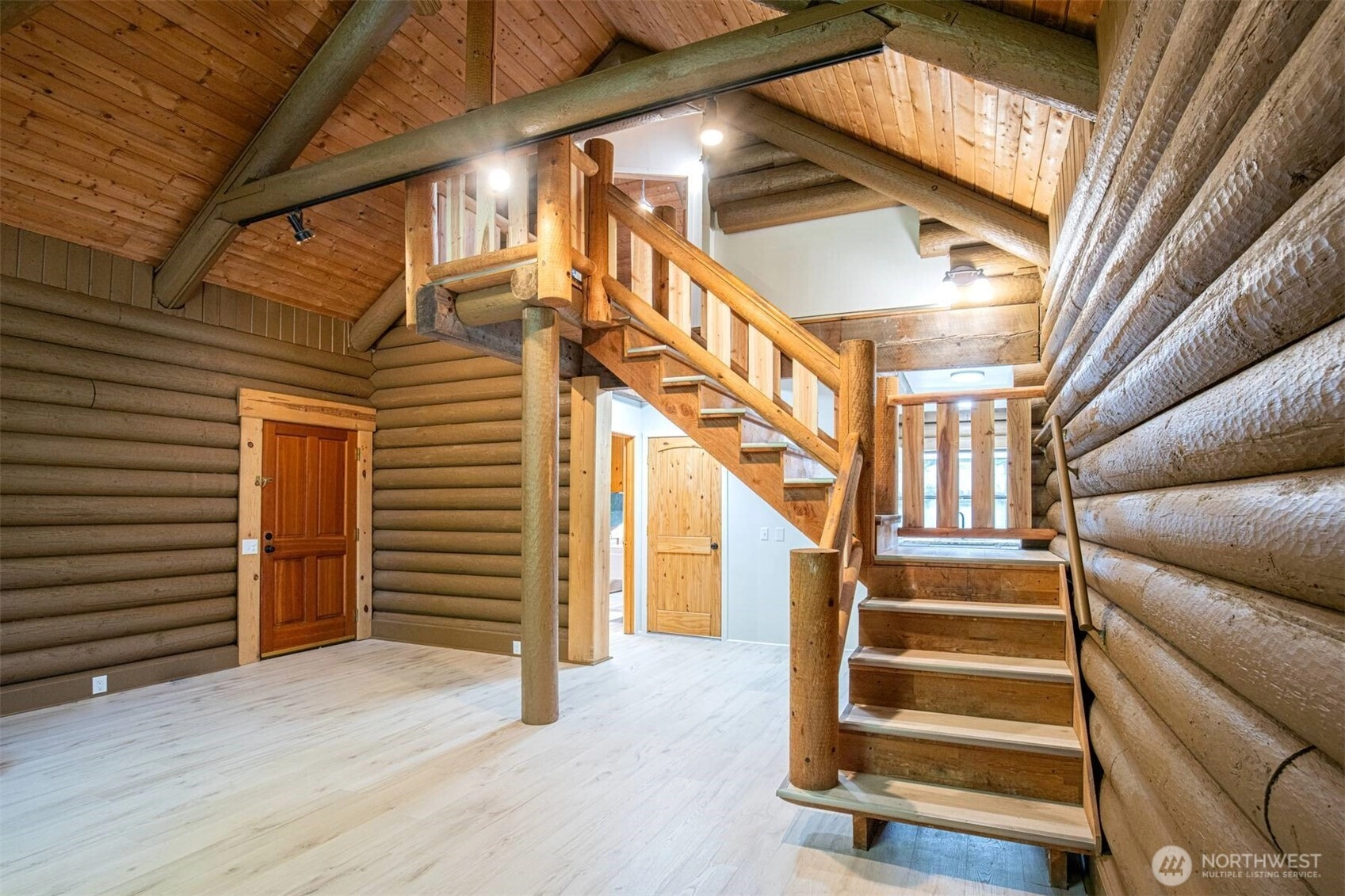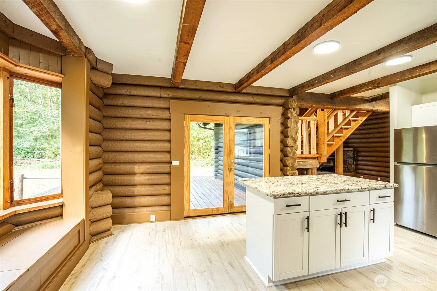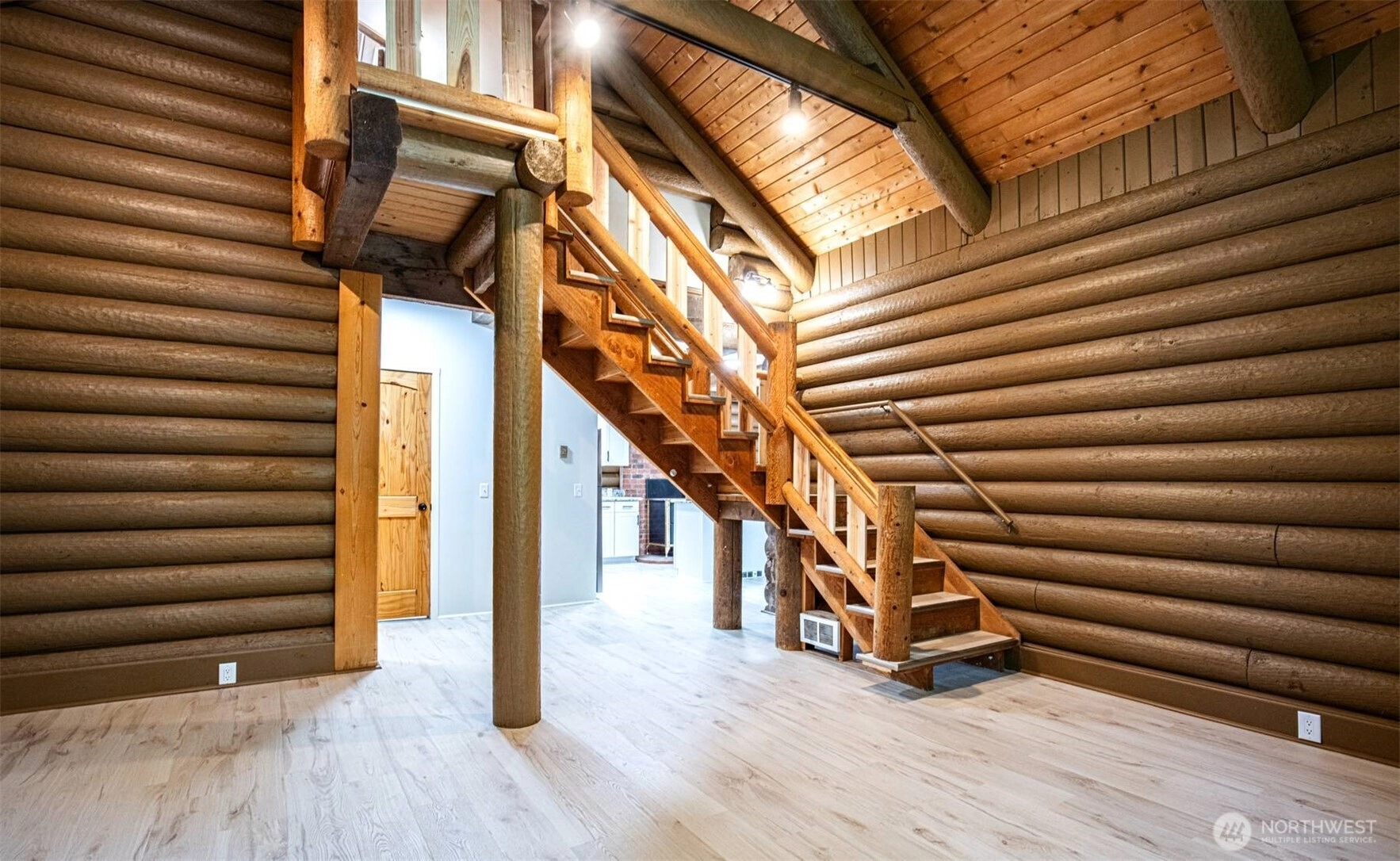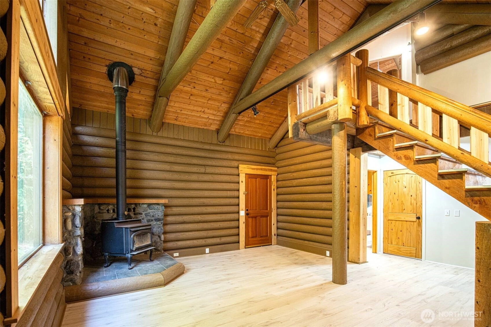 Discover this move-in ready 2-bed, 2-bath log cabin on 3.8 private acres, a dream for outdoor enthusiasts! Surrounded by nature, it features a detached two-car garage with space for all your gear. Inside, enjoy an updated kitchen with granite countertops, a large island, and durable LVP flooring. The living room offers a warm fireplace and abundant natural light. Step out from the dining room onto a private deck, perfect for relaxing or entertaining. The main level includes a walk-in shower and spacious utility room for convenience. Upstairs, two bedrooms offer peaceful, wooded views. A perfect blend of comfort and nature, ready for your next adventure.