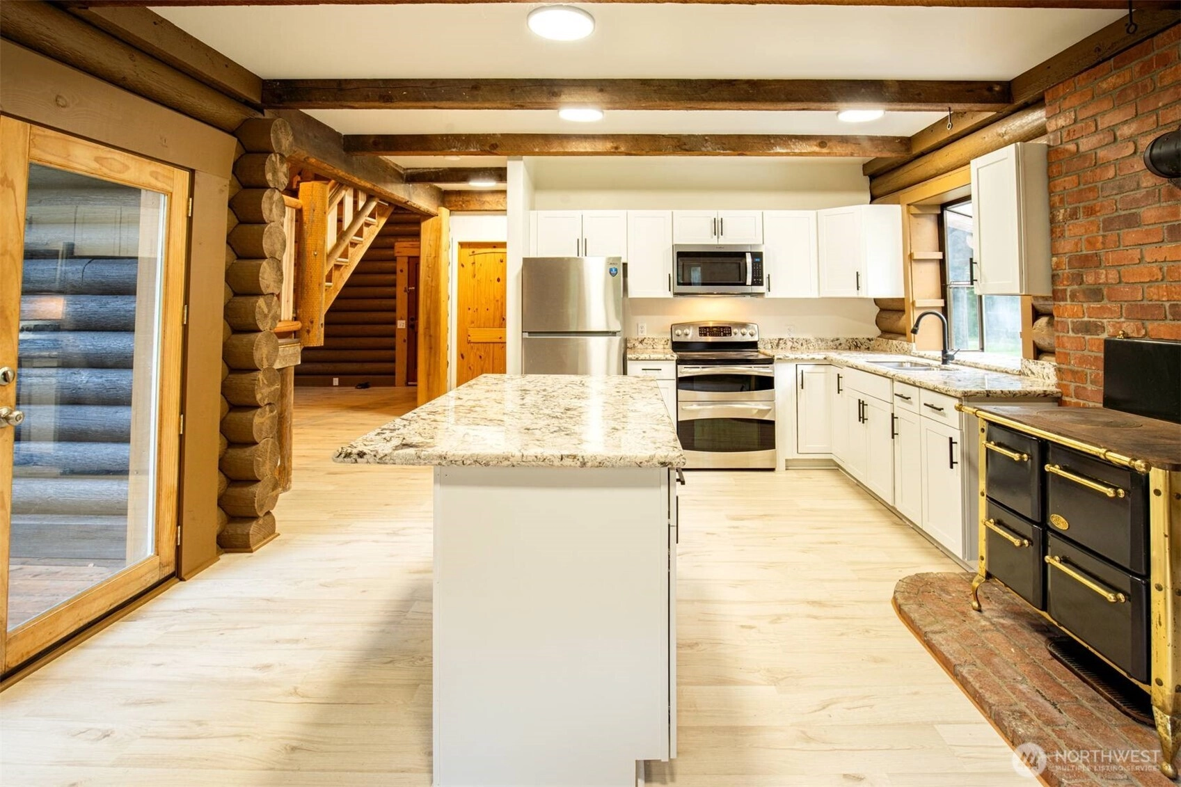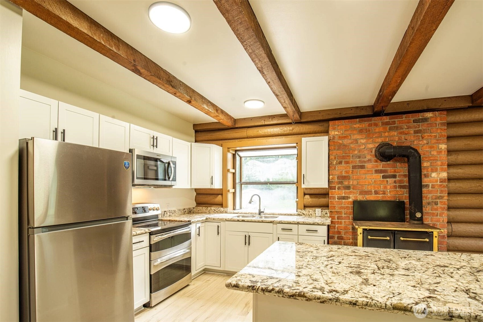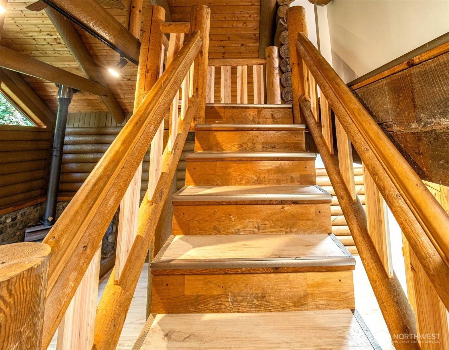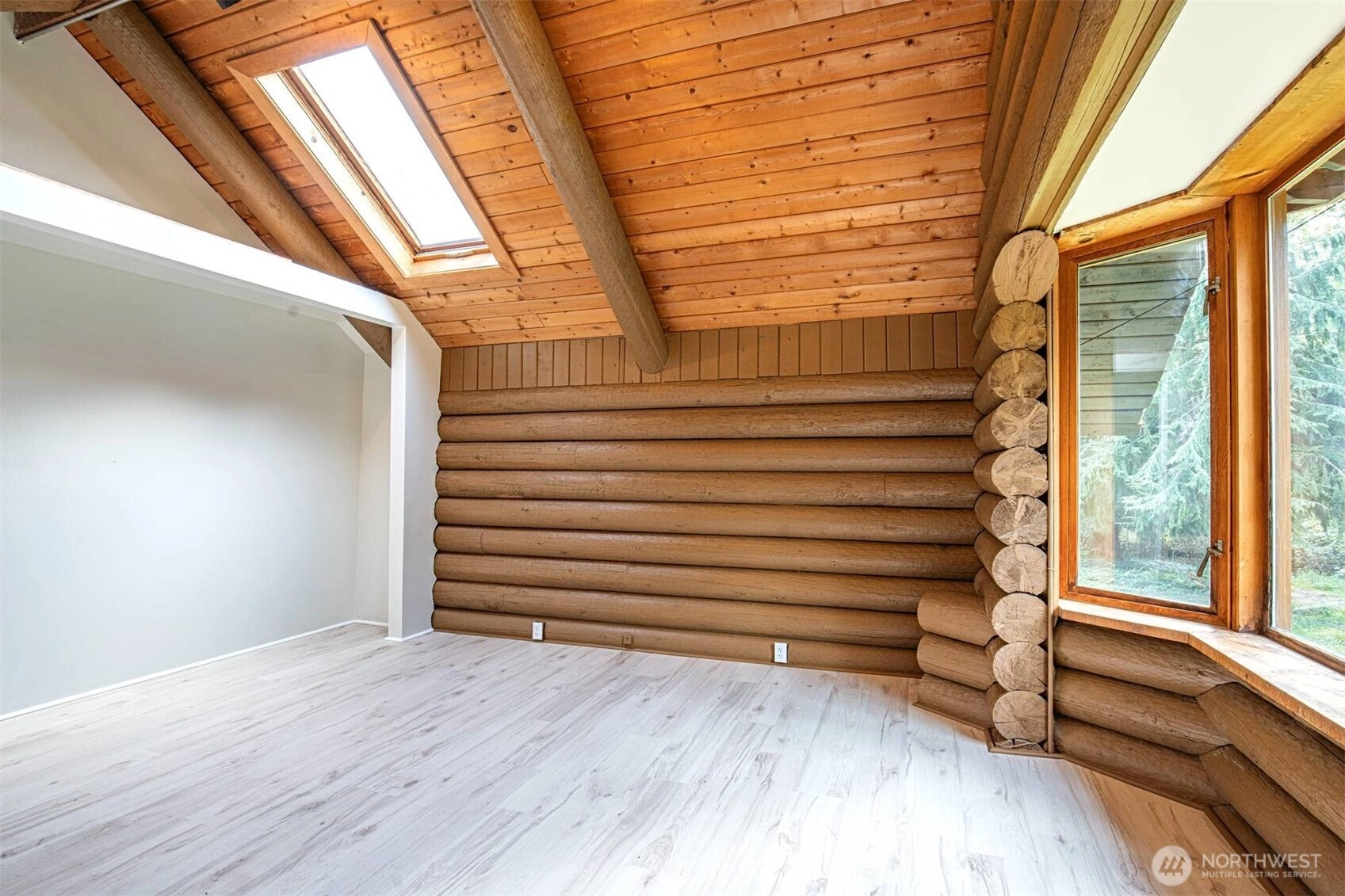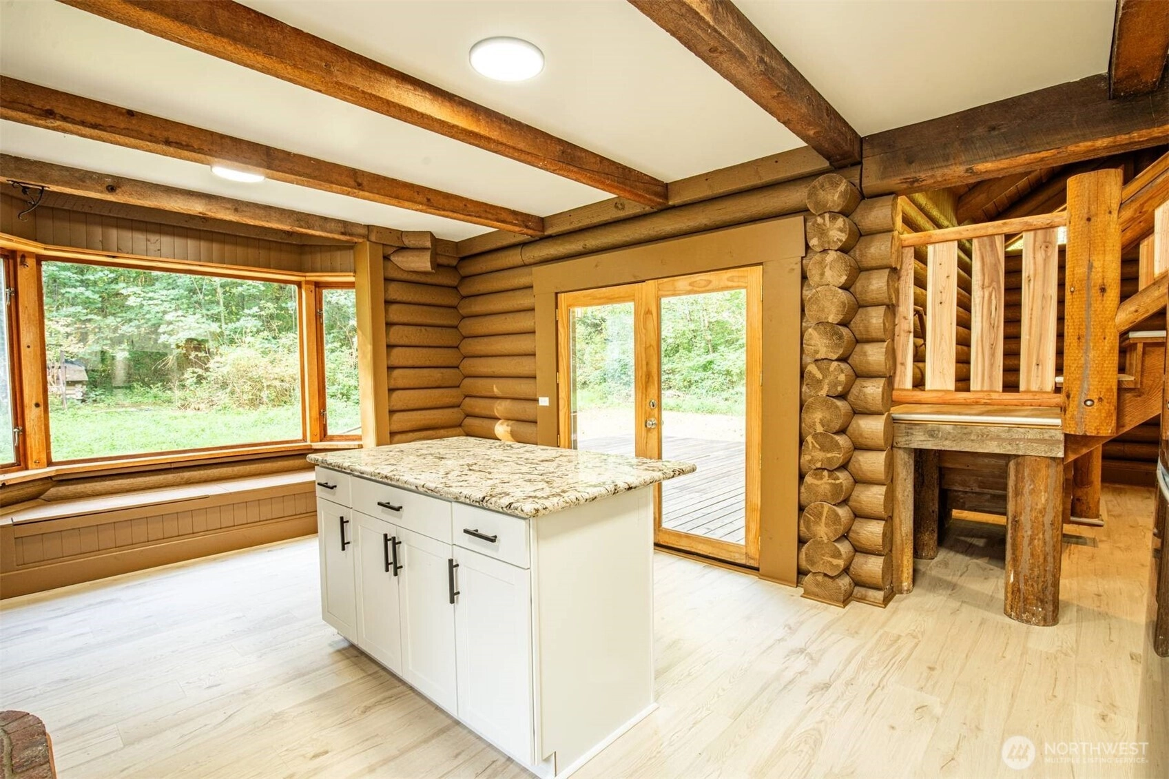 Discover this move-in ready 2-bed, 2-bath log cabin on 3.8 private acres, a dream for outdoor enthusiasts! Surrounded by nature, it features a detached two-car garage with space for all your gear. Inside, enjoy an updated kitchen with granite countertops, a large island, and durable LVP flooring. The living room offers a warm fireplace and abundant natural light. Step out from the dining room onto a private deck, perfect for relaxing or entertaining. The main level includes a walk-in shower and spacious utility room for convenience. Upstairs, two bedrooms offer peaceful, wooded views. A perfect blend of comfort and nature, ready for your next adventure.