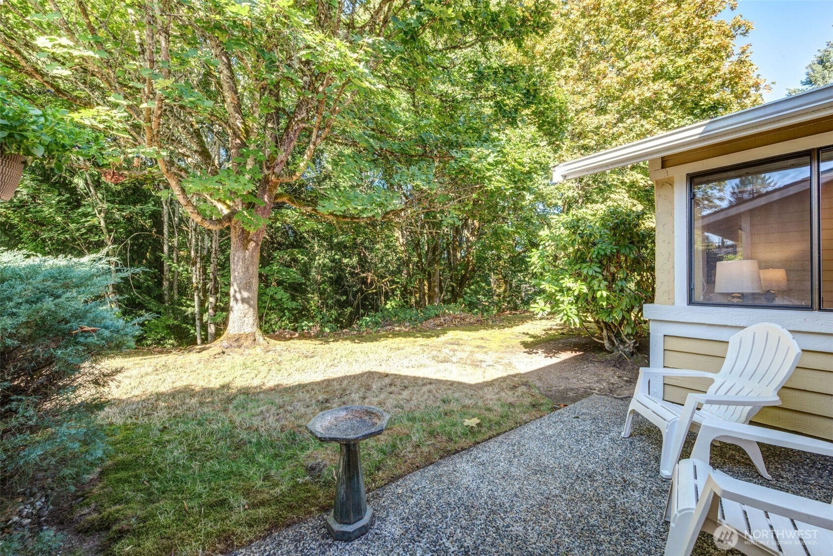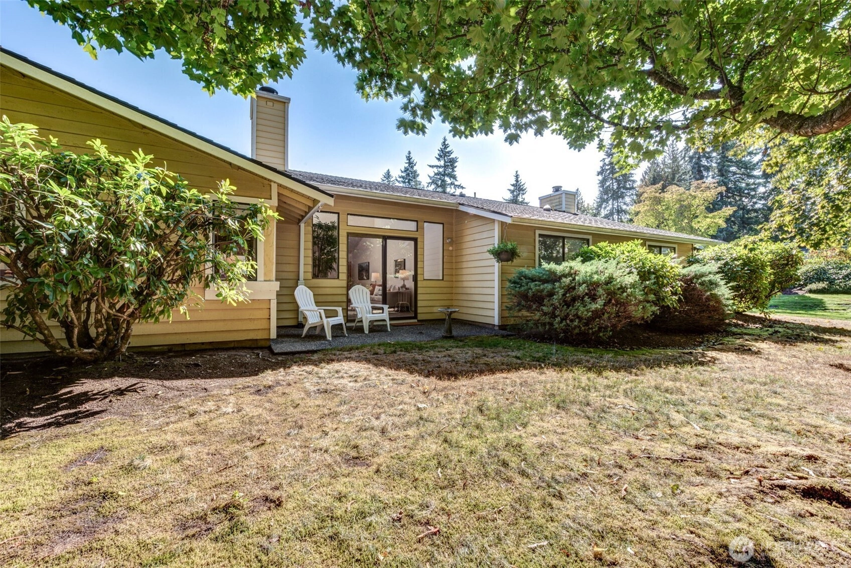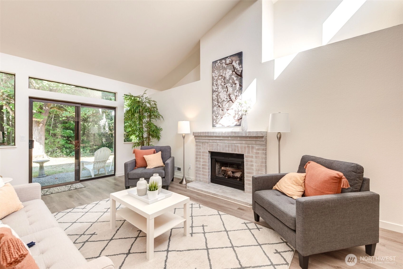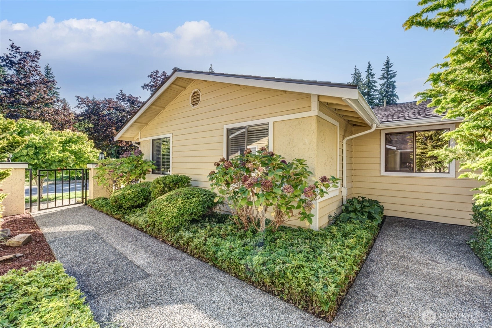 Private Greenbelt setting. Beautiful 1 story with Soaring Ceiling & NO Steps. Safe & secure in sought-after Mill Lane. Mill Creek Country Club Living, but affordable! Grounds are spacious with well maintained landscaping. Open & Bright. 1061 sf. 2 Beds, 2 Baths. Very comfortable home. Nicely updated & remodeled throughout incl ALL NEW; eng laminate flooring, doors & trim, paint, electrical outlets & stainless appliances. Kitchen has newer gray cabinets & quartz counters. Gas water tank 2016. One yr old quality gas furnace. Fireplace. Spacious vaulted Primary Bed has lg closet area & ensuite bath. 2 Car Garage, direct access into house. 1 Block to MC Country Club. Great Walking, Trails, Parks. Town Center nearby. Coveted Mill Creek Schools.