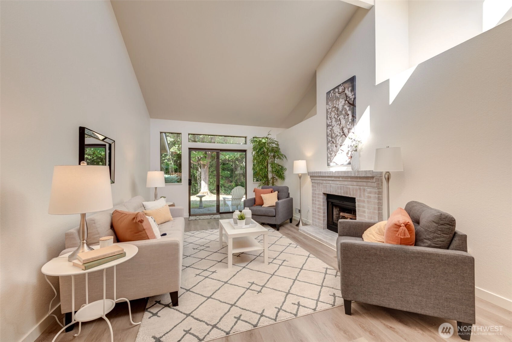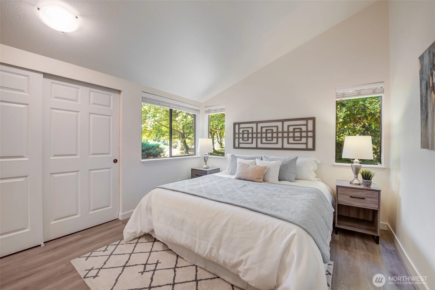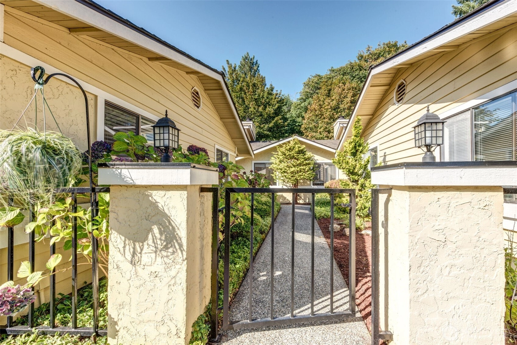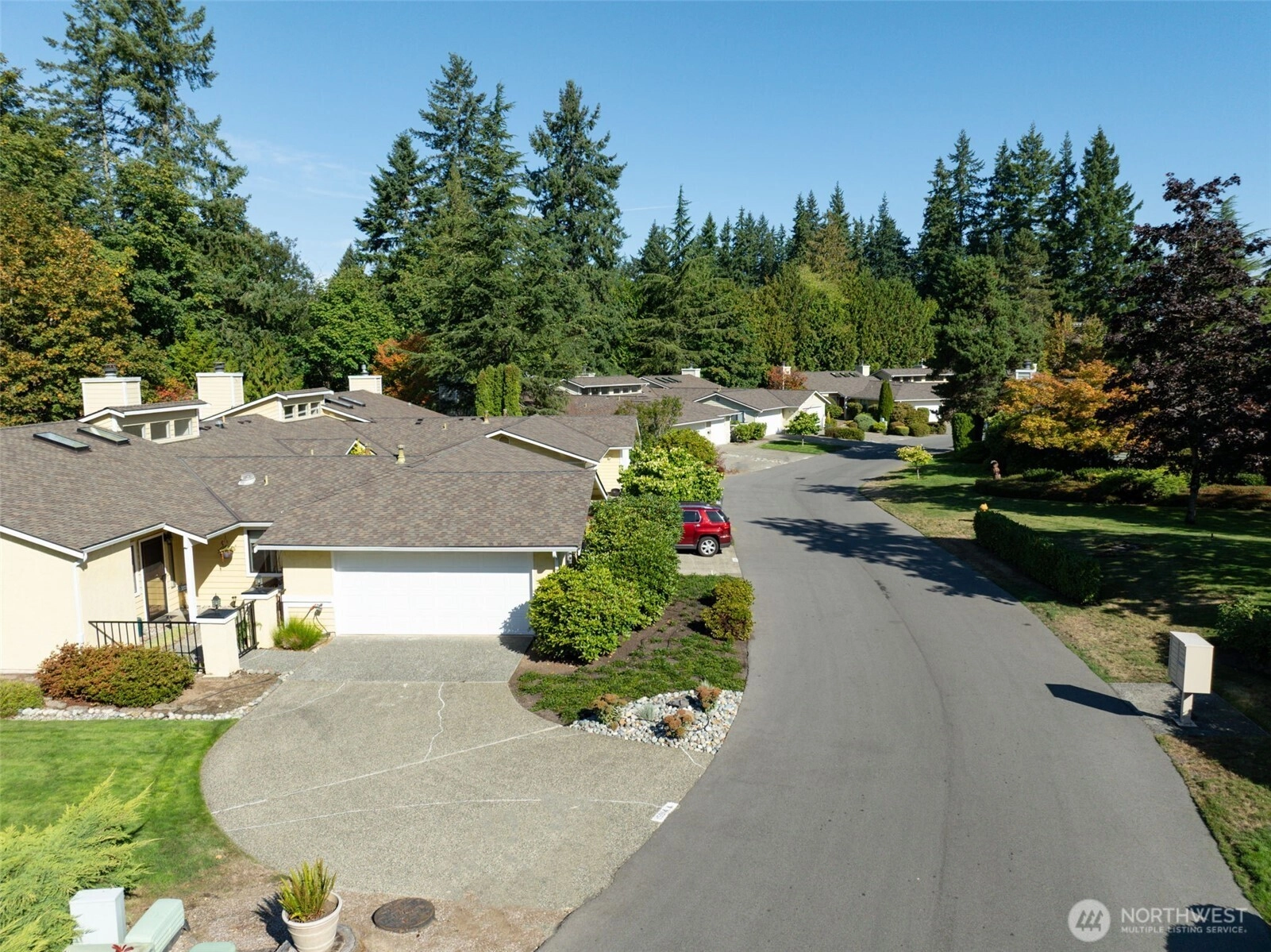 Private Greenbelt setting. Beautiful 1 story with Soaring Ceiling & NO Steps. Safe & secure in sought-after Mill Lane. Mill Creek Country Club Living, but affordable! Grounds are spacious with well maintained landscaping. Open & Bright. 1061 sf. 2 Beds, 2 Baths. Very comfortable home. Nicely updated & remodeled throughout incl ALL NEW; eng laminate flooring, doors & trim, paint, electrical outlets & stainless appliances. Kitchen has newer gray cabinets & quartz counters. Gas water tank 2016. One yr old quality gas furnace. Fireplace. Spacious vaulted Primary Bed has lg closet area & ensuite bath. 2 Car Garage, direct access into house. 1 Block to MC Country Club. Great Walking, Trails, Parks. Town Center nearby. Coveted Mill Creek Schools.