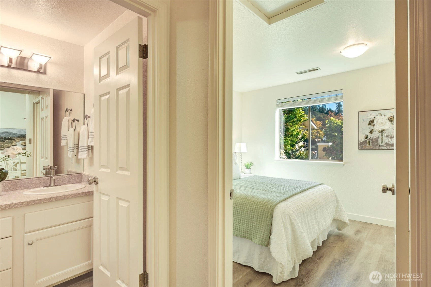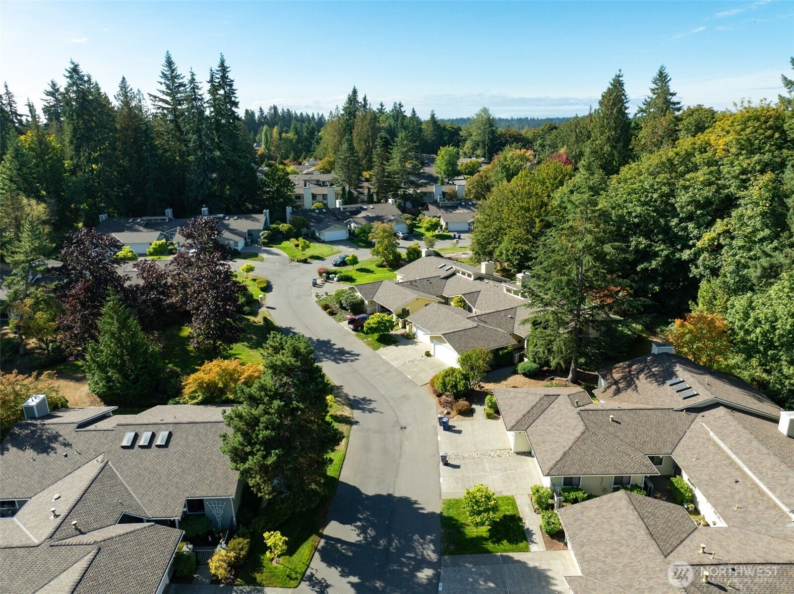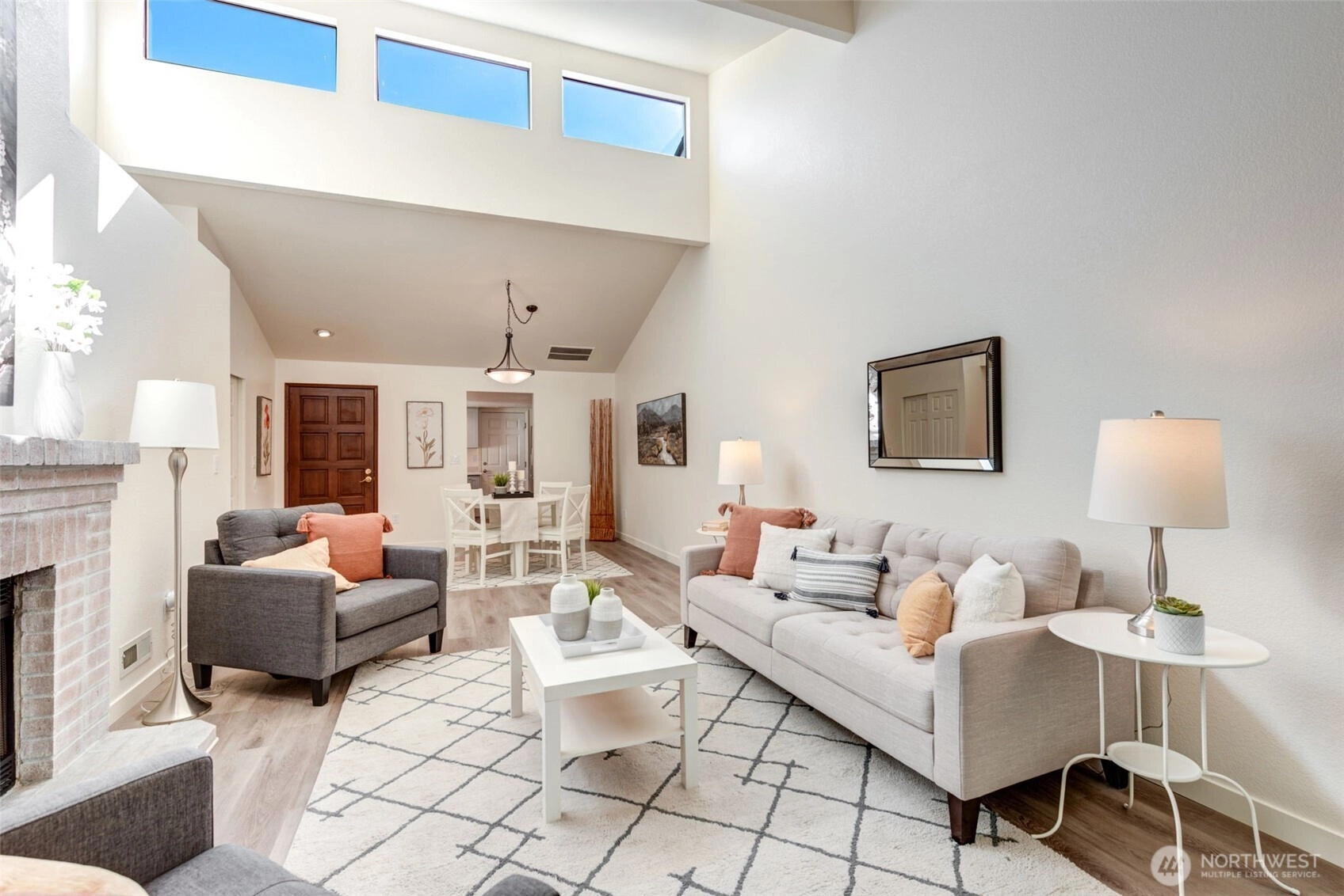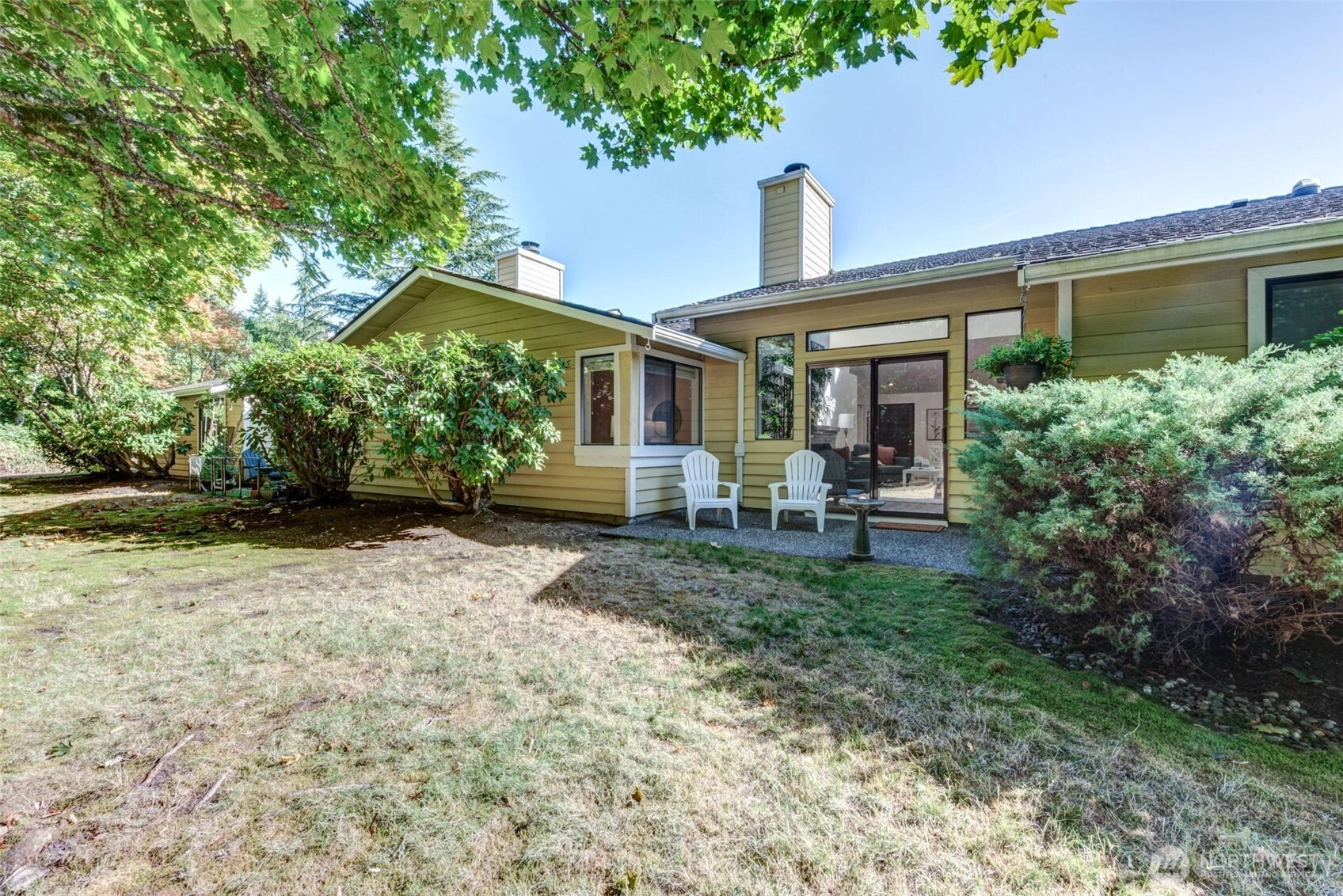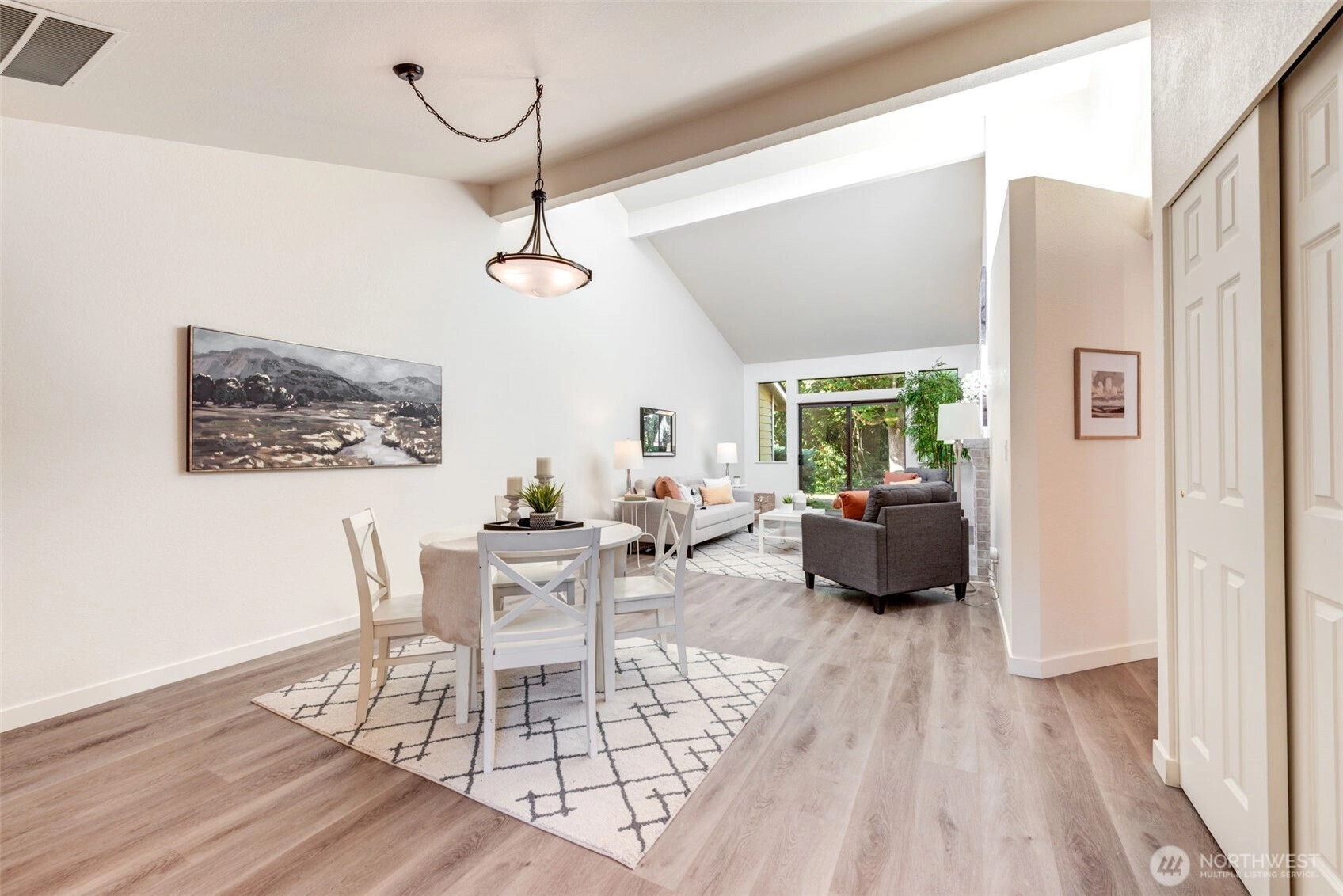 Private Greenbelt setting. Beautiful 1 story with Soaring Ceiling & NO Steps. Safe & secure in sought-after Mill Lane. Mill Creek Country Club Living, but affordable! Grounds are spacious with well maintained landscaping. Open & Bright. 1061 sf. 2 Beds, 2 Baths. Very comfortable home. Nicely updated & remodeled throughout incl ALL NEW; eng laminate flooring, doors & trim, paint, electrical outlets & stainless appliances. Kitchen has newer gray cabinets & quartz counters. Gas water tank 2016. One yr old quality gas furnace. Fireplace. Spacious vaulted Primary Bed has lg closet area & ensuite bath. 2 Car Garage, direct access into house. 1 Block to MC Country Club. Great Walking, Trails, Parks. Town Center nearby. Coveted Mill Creek Schools.