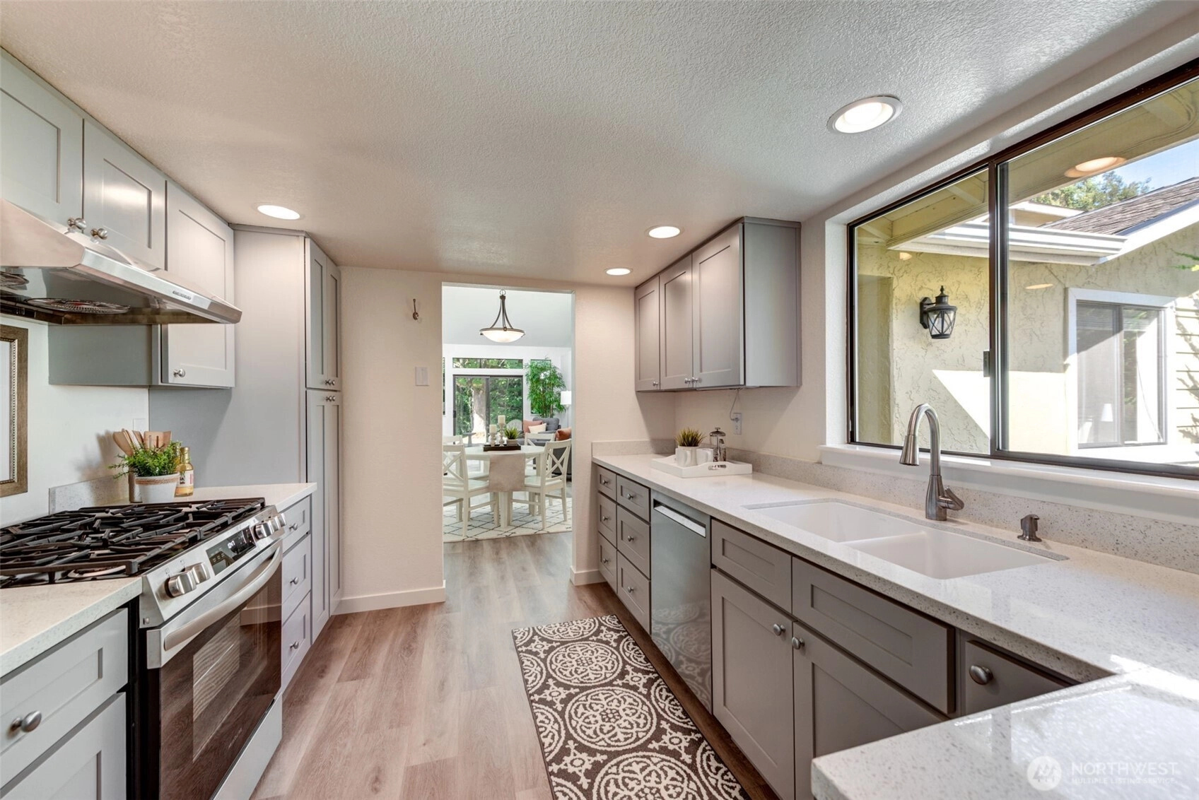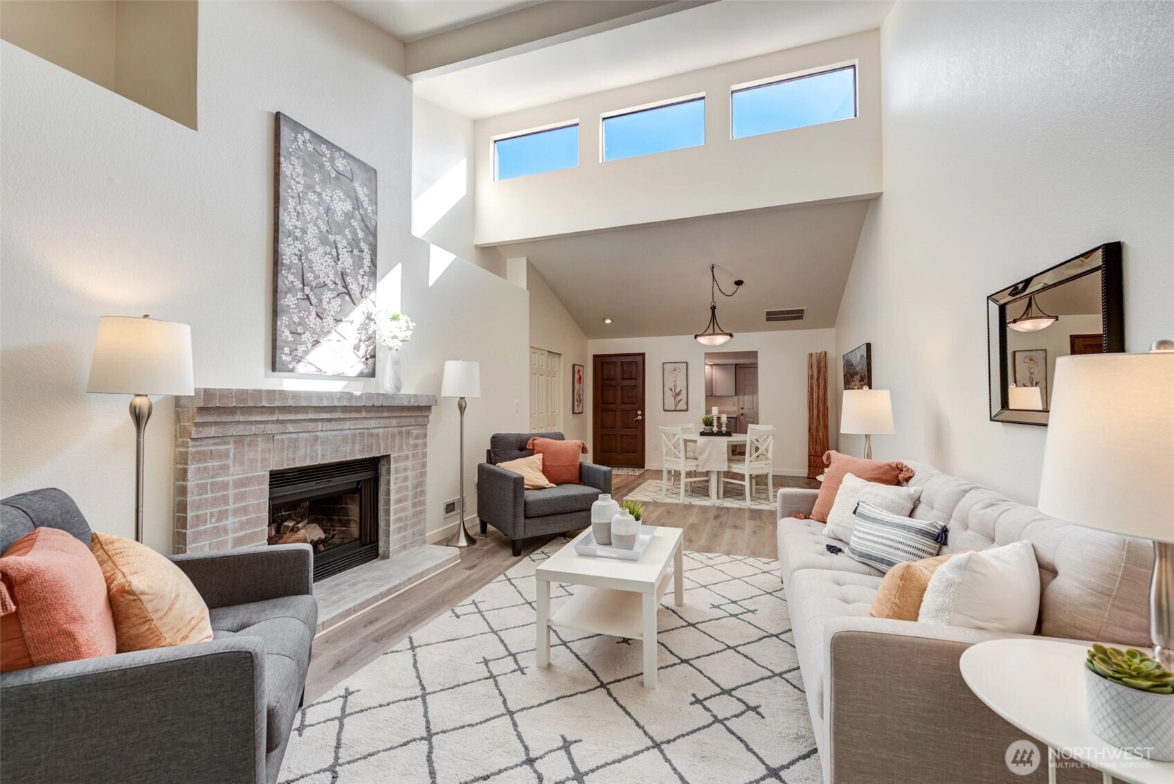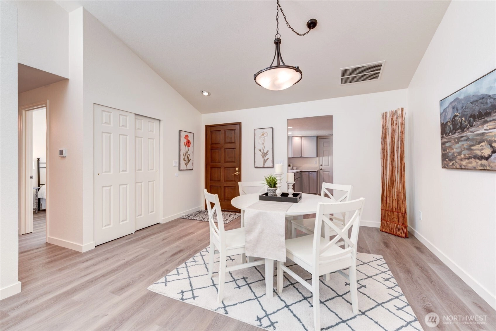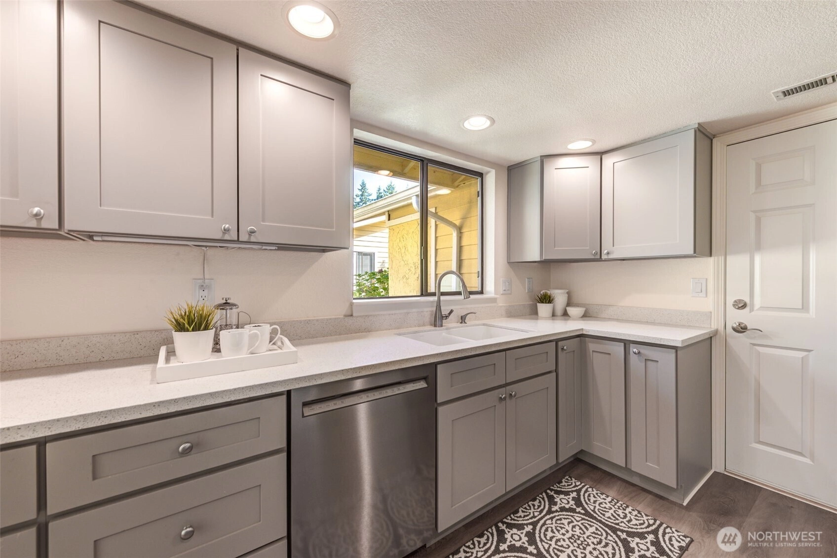 Private Greenbelt setting. Beautiful 1 story with Soaring Ceiling & NO Steps. Safe & secure in sought-after Mill Lane. Mill Creek Country Club Living, but affordable! Grounds are spacious with well maintained landscaping. Open & Bright. 1061 sf. 2 Beds, 2 Baths. Very comfortable home. Nicely updated & remodeled throughout incl ALL NEW; eng laminate flooring, doors & trim, paint, electrical outlets & stainless appliances. Kitchen has newer gray cabinets & quartz counters. Gas water tank 2016. One yr old quality gas furnace. Fireplace. Spacious vaulted Primary Bed has lg closet area & ensuite bath. 2 Car Garage, direct access into house. 1 Block to MC Country Club. Great Walking, Trails, Parks. Town Center nearby. Coveted Mill Creek Schools.