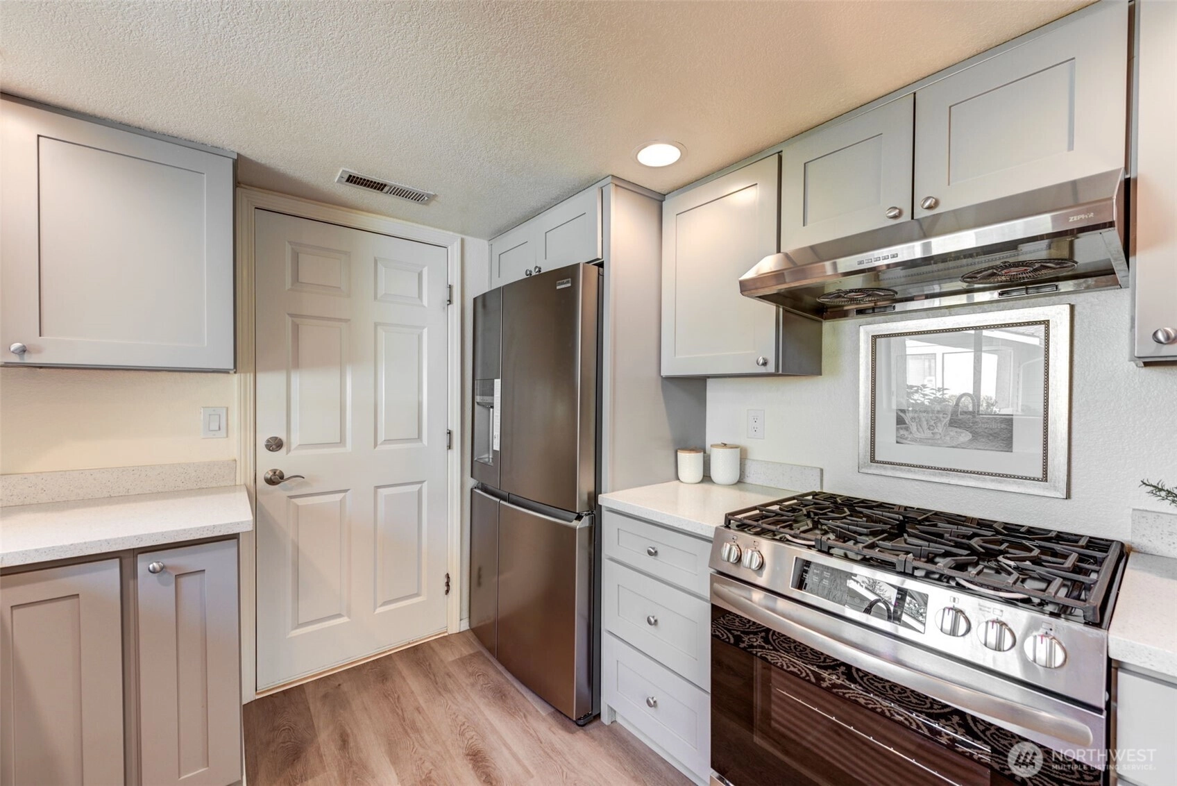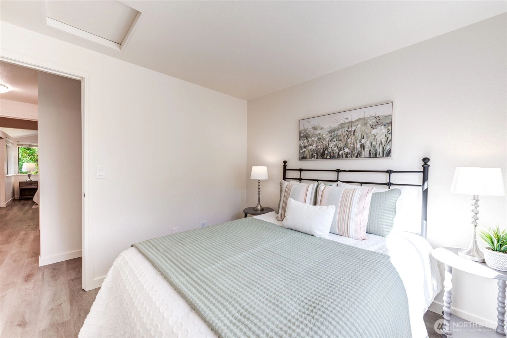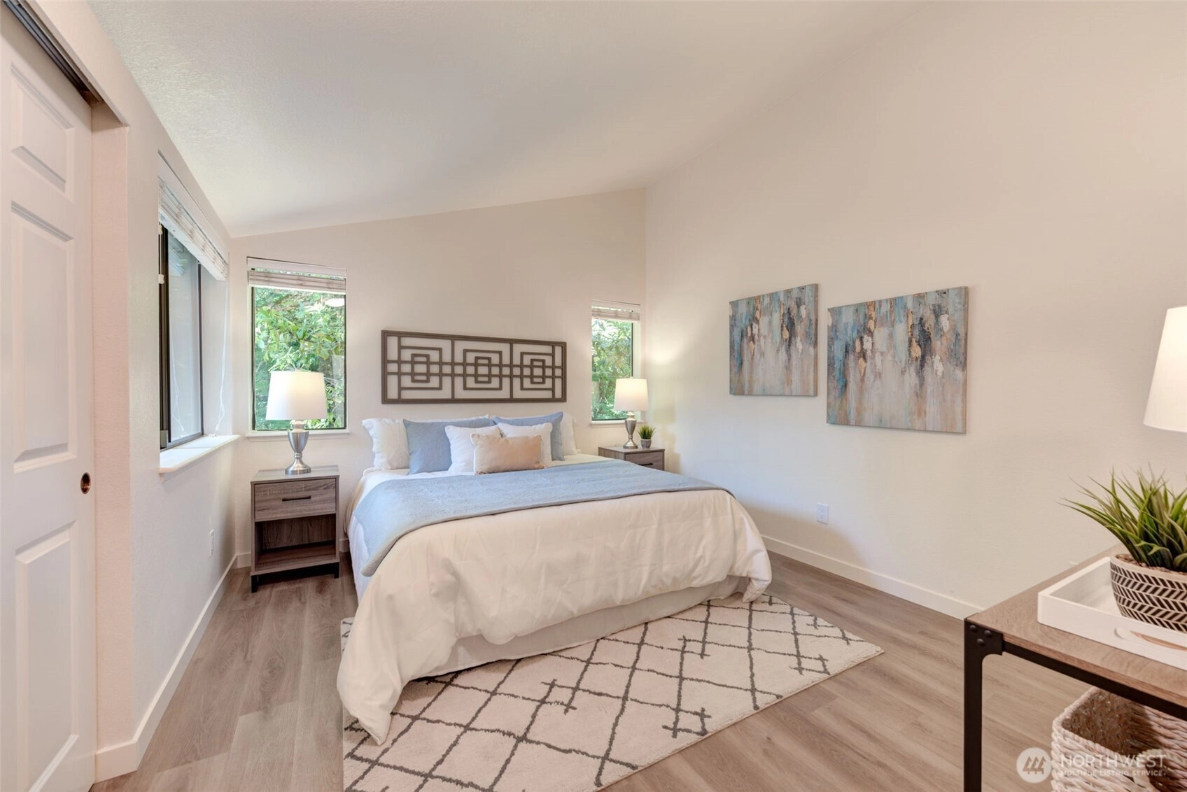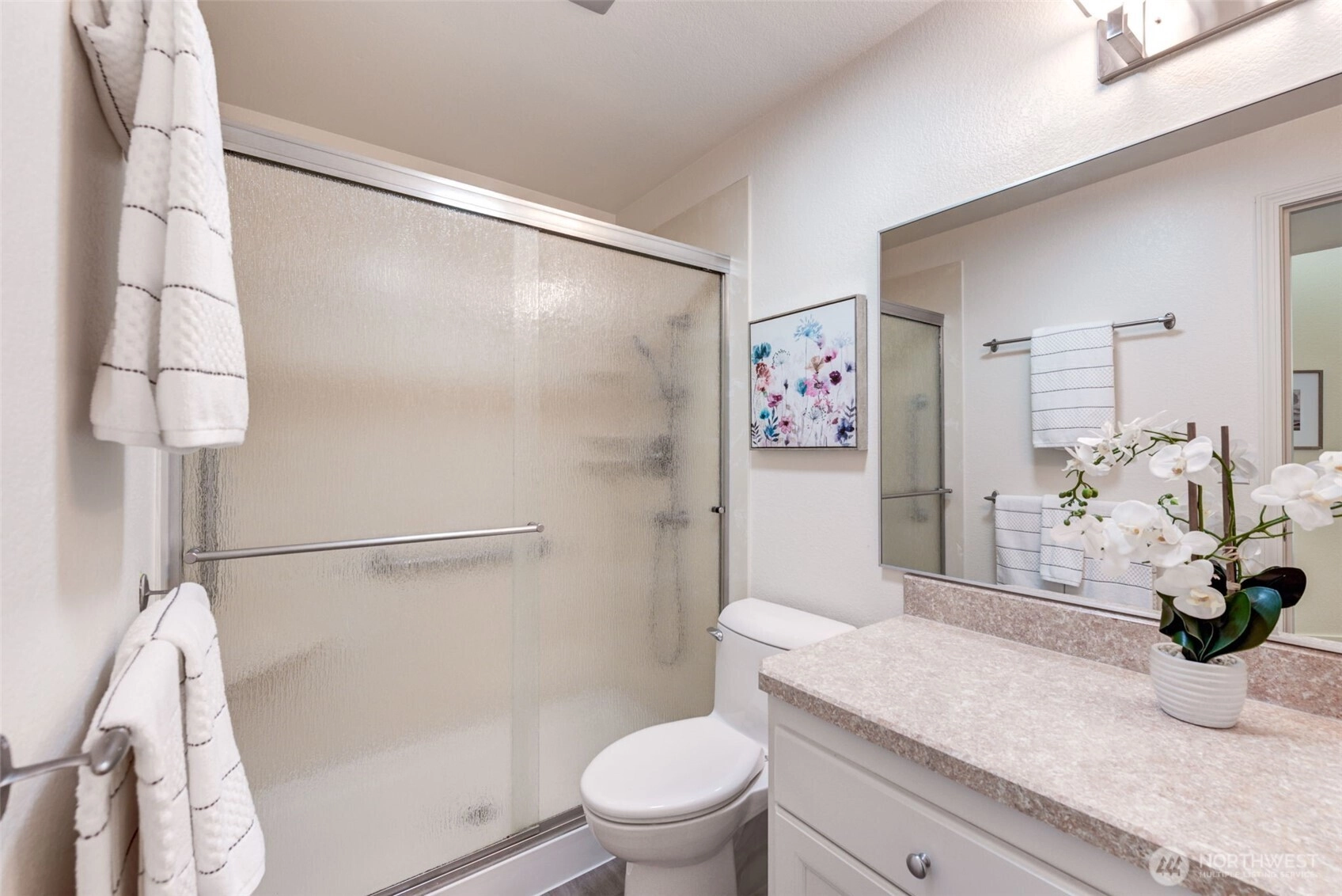 Private Greenbelt setting. Beautiful 1 story with Soaring Ceiling & NO Steps. Safe & secure in sought-after Mill Lane. Mill Creek Country Club Living, but affordable! Grounds are spacious with well maintained landscaping. Open & Bright. 1061 sf. 2 Beds, 2 Baths. Very comfortable home. Nicely updated & remodeled throughout incl ALL NEW; eng laminate flooring, doors & trim, paint, electrical outlets & stainless appliances. Kitchen has newer gray cabinets & quartz counters. Gas water tank 2016. One yr old quality gas furnace. Fireplace. Spacious vaulted Primary Bed has lg closet area & ensuite bath. 2 Car Garage, direct access into house. 1 Block to MC Country Club. Great Walking, Trails, Parks. Town Center nearby. Coveted Mill Creek Schools.