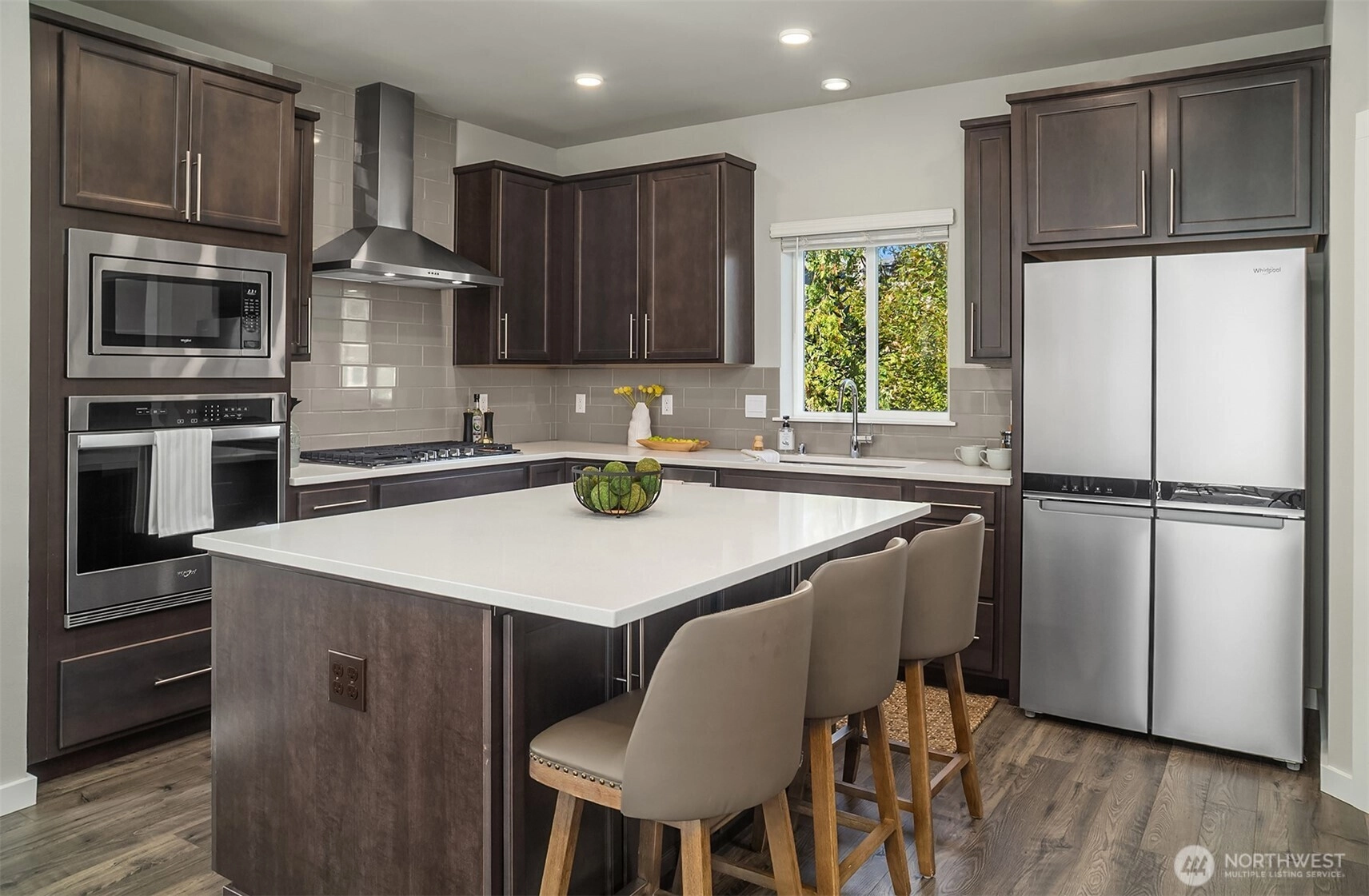 Located in the Northshore School Dist with 4 bedrooms, including 2 primary bdrms with en-suites, one conveniently located on the entry level-ideal for multigenerational living. The open-concept design is perfect for entertaining, showcasing a commanding kitchen island, high-end appliances, a dining space, office area and a spacious living room with an expansive wall of south-facing windows complete with door access to a charming deck. Upstairs boasts 3 additional bdrms, 2 bathrooms, laundry, and a luxurious primary suite with a generous walk-in closet & a spa-like 5-piece bathroom. Low-maintenance backyard next to a tranquil greenbelt, perfect for gardening, play, or simply relaxing. Air Conditioning, garage and additional outdoor parking.