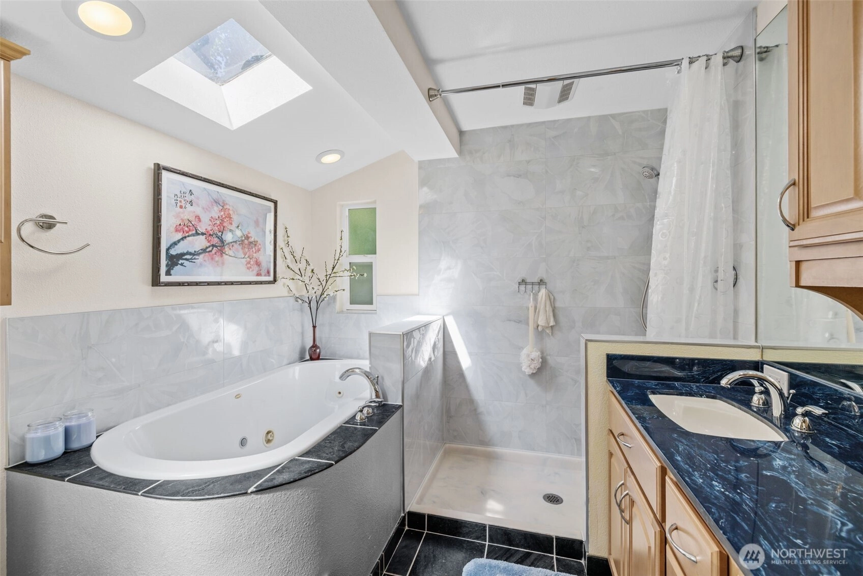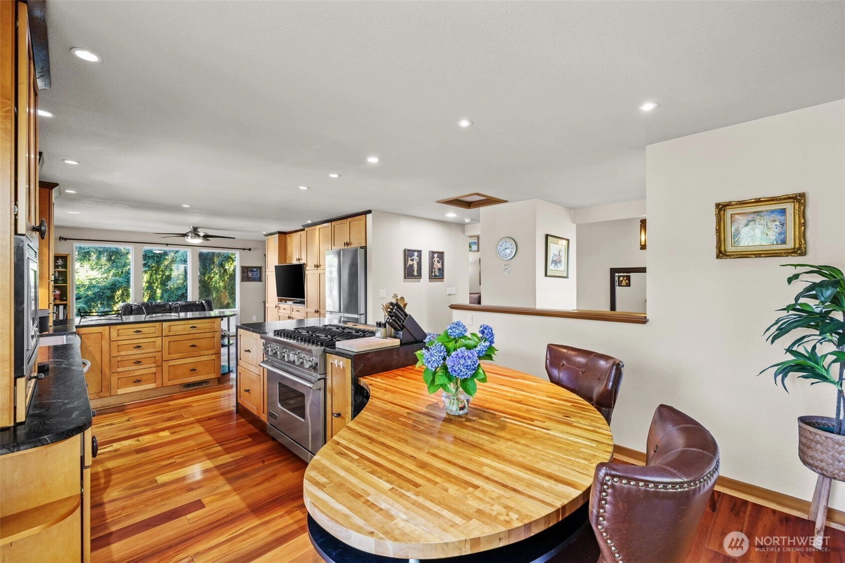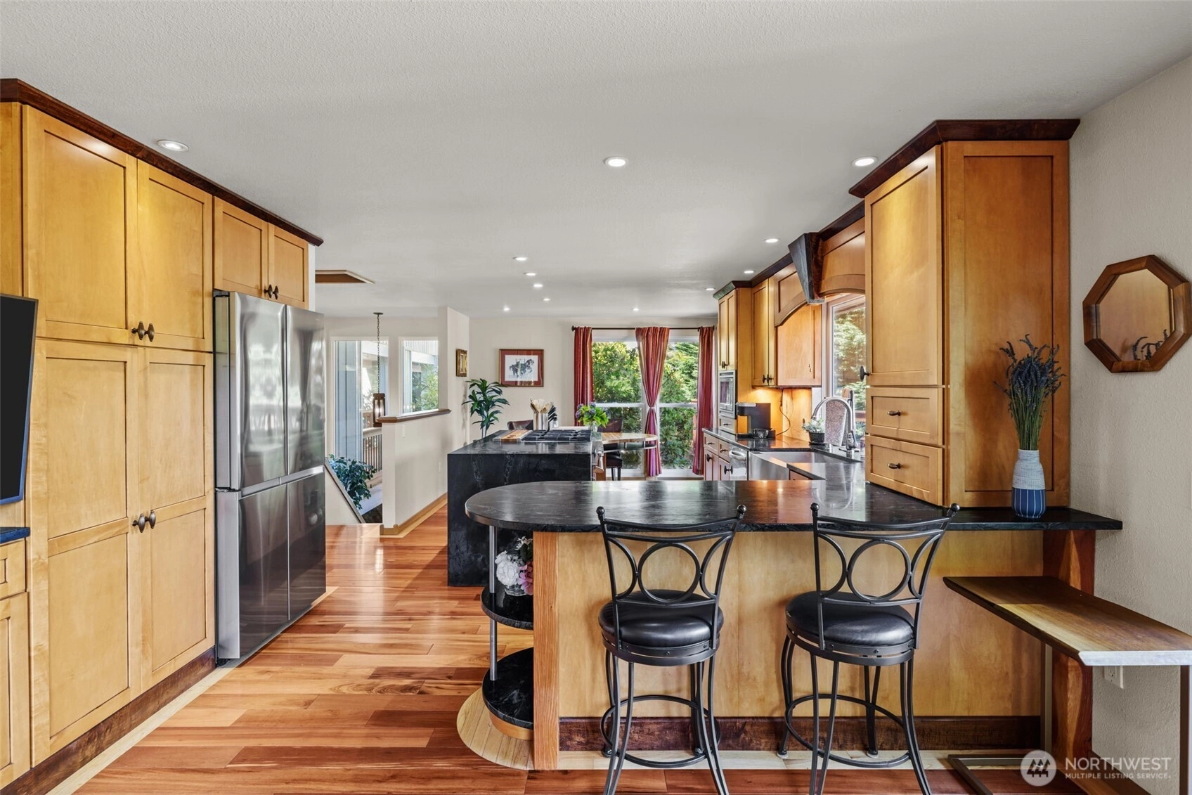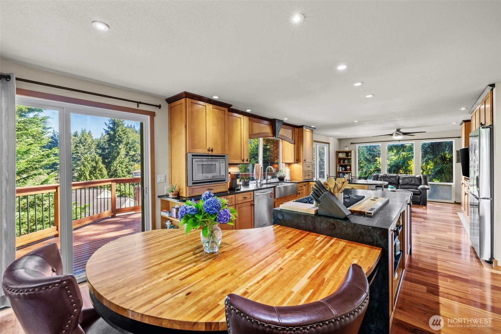 Over $100k price drop in Somerset! This beautiful, refreshed Bellevue gem boasts a chef's kitchen with gas Viking stove, soapstone countertops, waterfall edge island, elegant wood cabinets with crown molding, luxurious Brazilian Koa hardwood floors and new interior paint in most areas. Generous primary suite with a 5pc bath and skylight, 2 fireplaces, a 2nd en-suite, 3 more bedrooms, a rec room with a wet bar, storage room/flex space, and a great deck for entertaining as well as a low-maintenance backyard! New downstairs windows in 2024. Don't miss the extra storage space in the crawlspace! Located in top-rated Bellevue school district! Great location in a cul-de-sac and close to I-90/I-405 freeway access, shopping, and city conveniences.