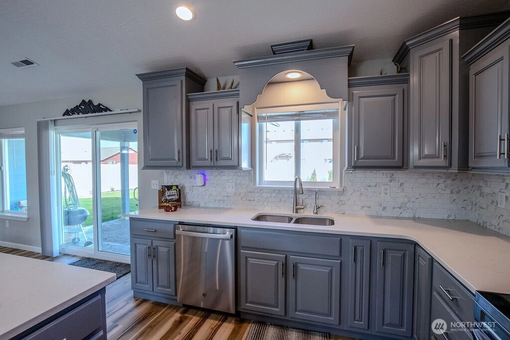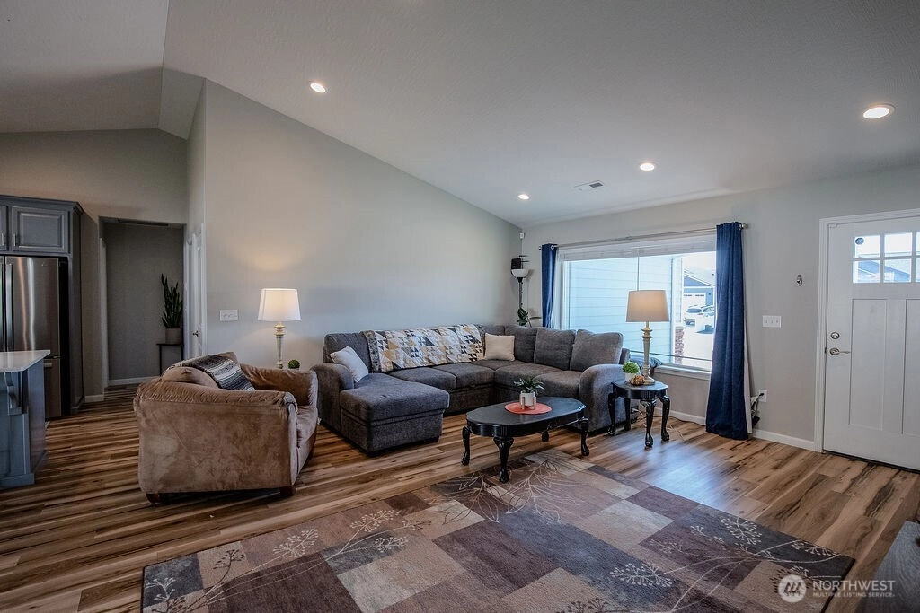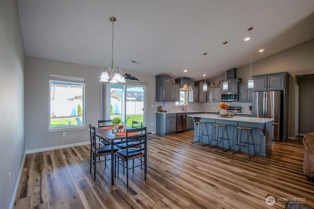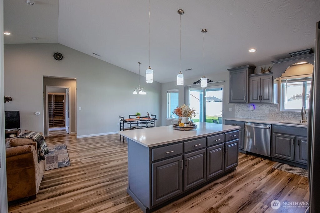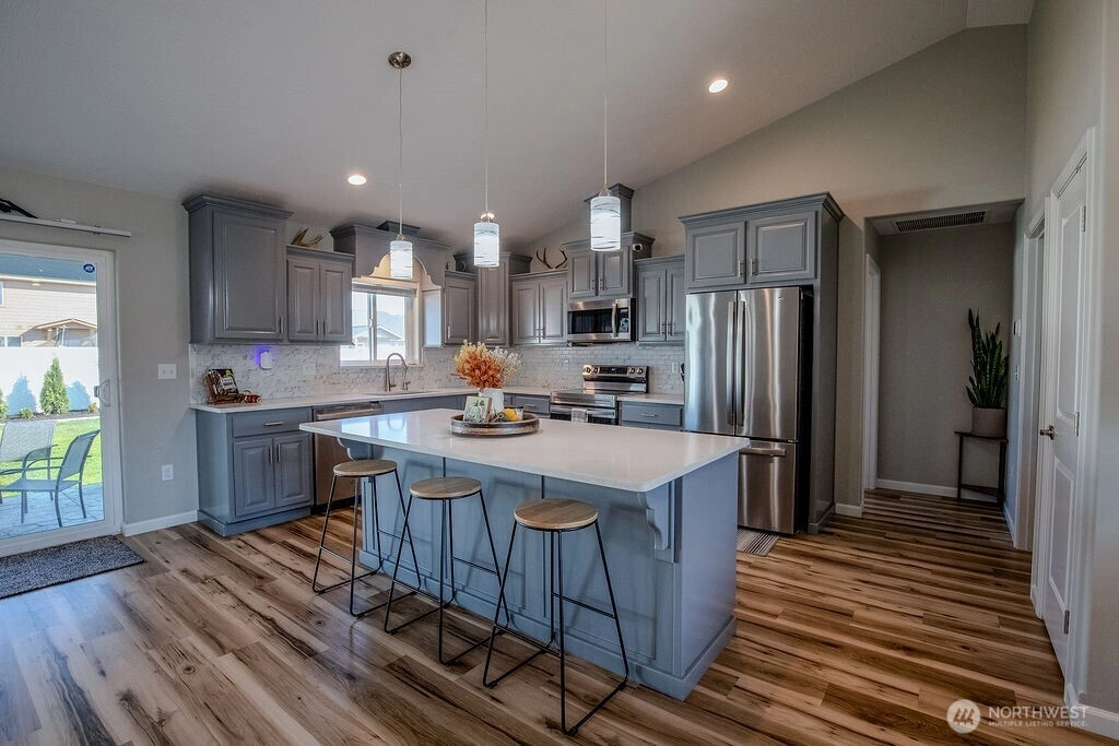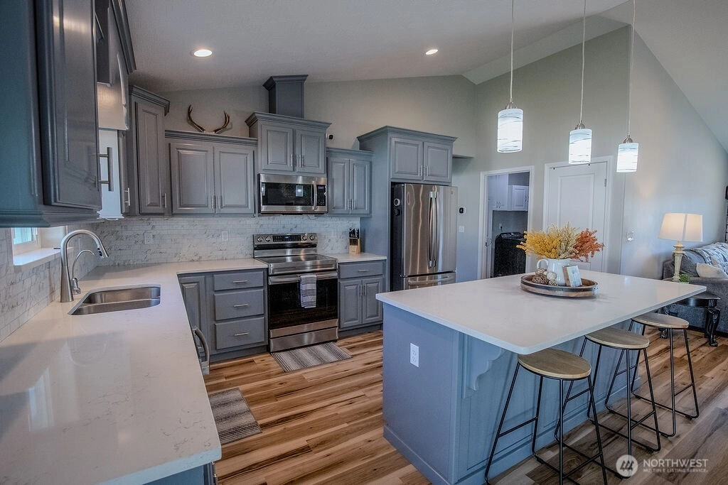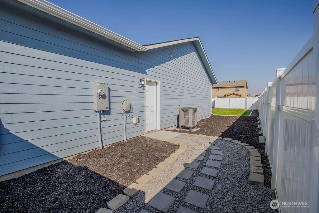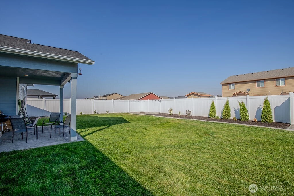 Fantastic home in a great neighborhood. Â 3 bedrooms, 1 3/4 baths with a large primary bedroom suite and open floor plan. Â The great room has a vaulted ceiling with the kitchen featuring a large island, solid surface counter top and beautiful soft-close cabinets. The primary bathroom and guest bathroom also have solid surface counter tops. The attached, finished garage has additional concrete next to it for your boat, RV or guest parking. Â Vinyl fenced back yard can be accessed off the alley or through double gate in the front. Relaxing under the large covered back patio sounds perfect after a long day. Concrete curbing and firepit are great features. Front yard is drought resistant design.