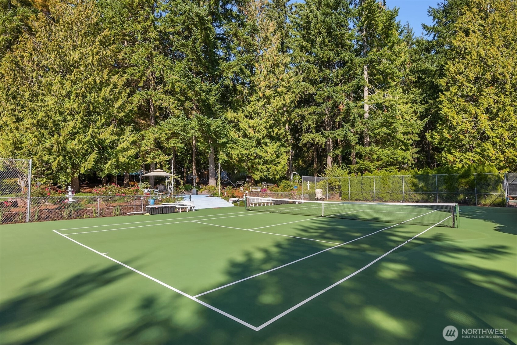 A rare sanctuary in Poulsbo-three parcels joined for ~3.07 acres with tennis court less than a mile from Brownsville Marina. This single-level 4-bed 2-bath residence delivers effortless living with no steps, soaring vaulted ceiling, & walls of glass that reveal the serene wooded setting. Outdoors, indulge in a private tennis court, basketball, bocce, & even pickleball potential. Three storage sheds add convenience, while fruit trees, mature landscaping, & open spaces set the stage for relaxation. Bring your vision to the included 1.83 acre buildable lot. Gather at the fire pit or under the canopy of trees in multiple inviting areas perfect for entertaining, celebrating, or simply savoring the dream of Pacific Northwest living each day.