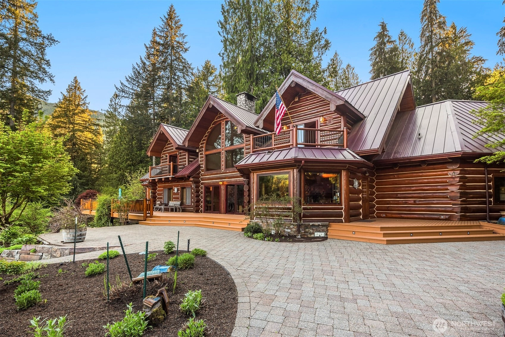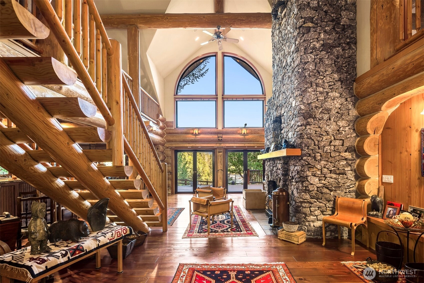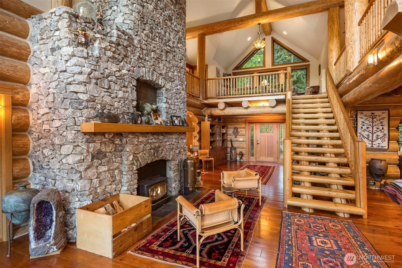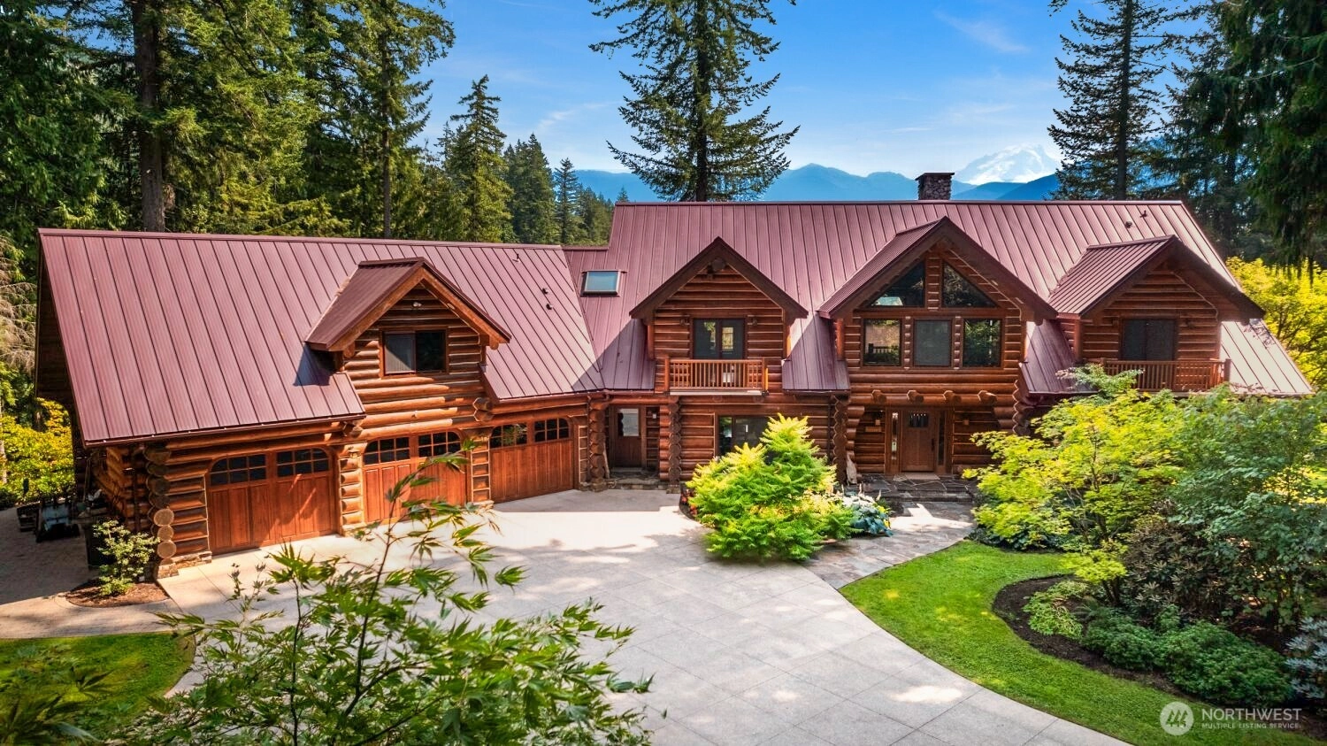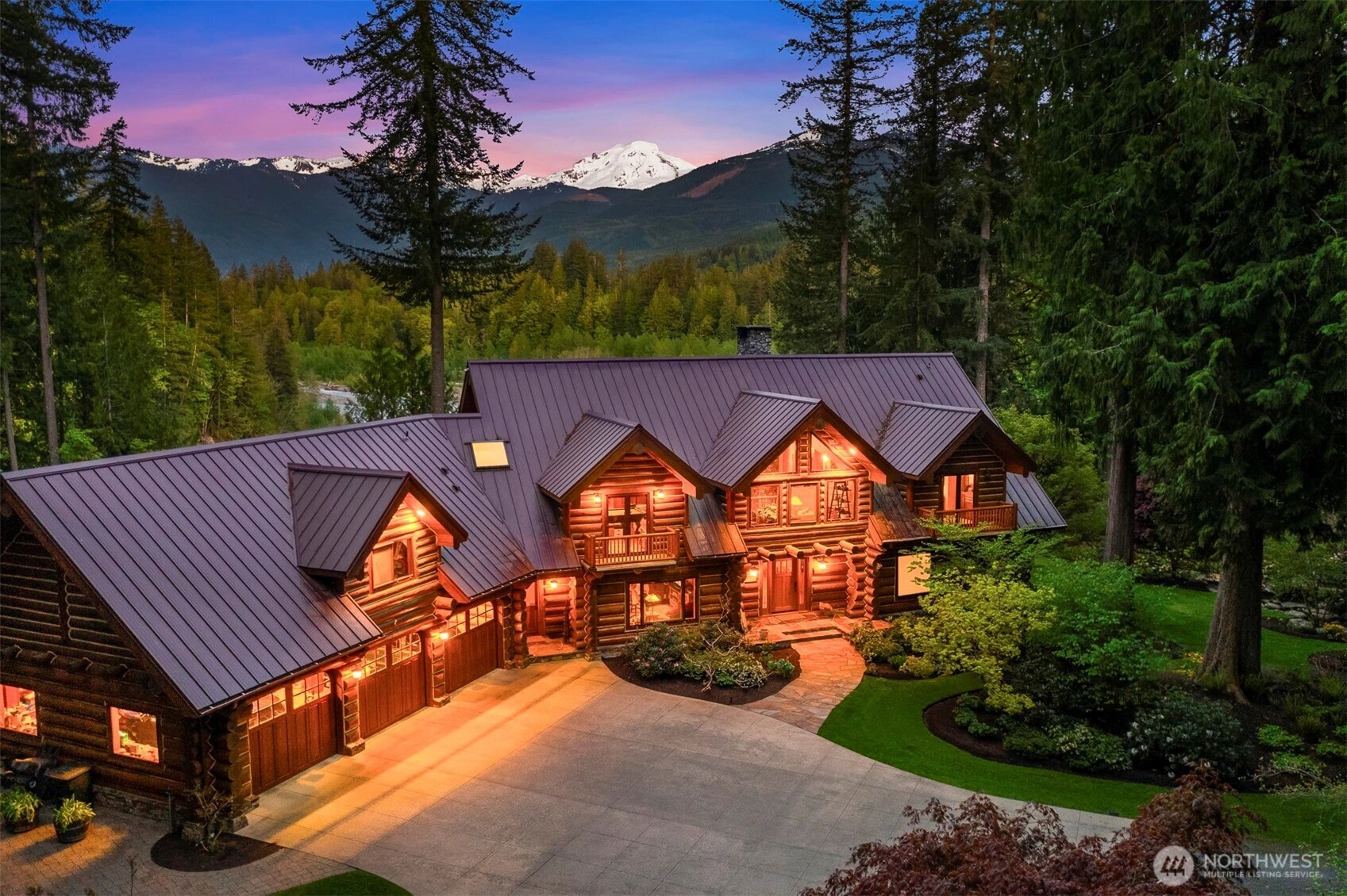 Embrace the grandeur of this Mt. Baker estate, boasting a mile of North Fork Nooksack River frontage across 15 acres. This majestic property offers an unparalleled après ski lifestyle with breathtaking panoramic views descending below the mountain range. The meticulously curated grounds feature serene waterfalls, meandering creeks, and tranquil ponds, crafting an exquisite year-round haven. Discover a true log estate crafted from the regions original fir logs to showcase exceptional artistry. The 30-foot vaulted ceilings create a grand ambiance, while a striking fireplace made entirely of local quarry limestone enhances the estate's elegance. This property is the epitome of refined living, blending natural beauty with sophisticated luxury.