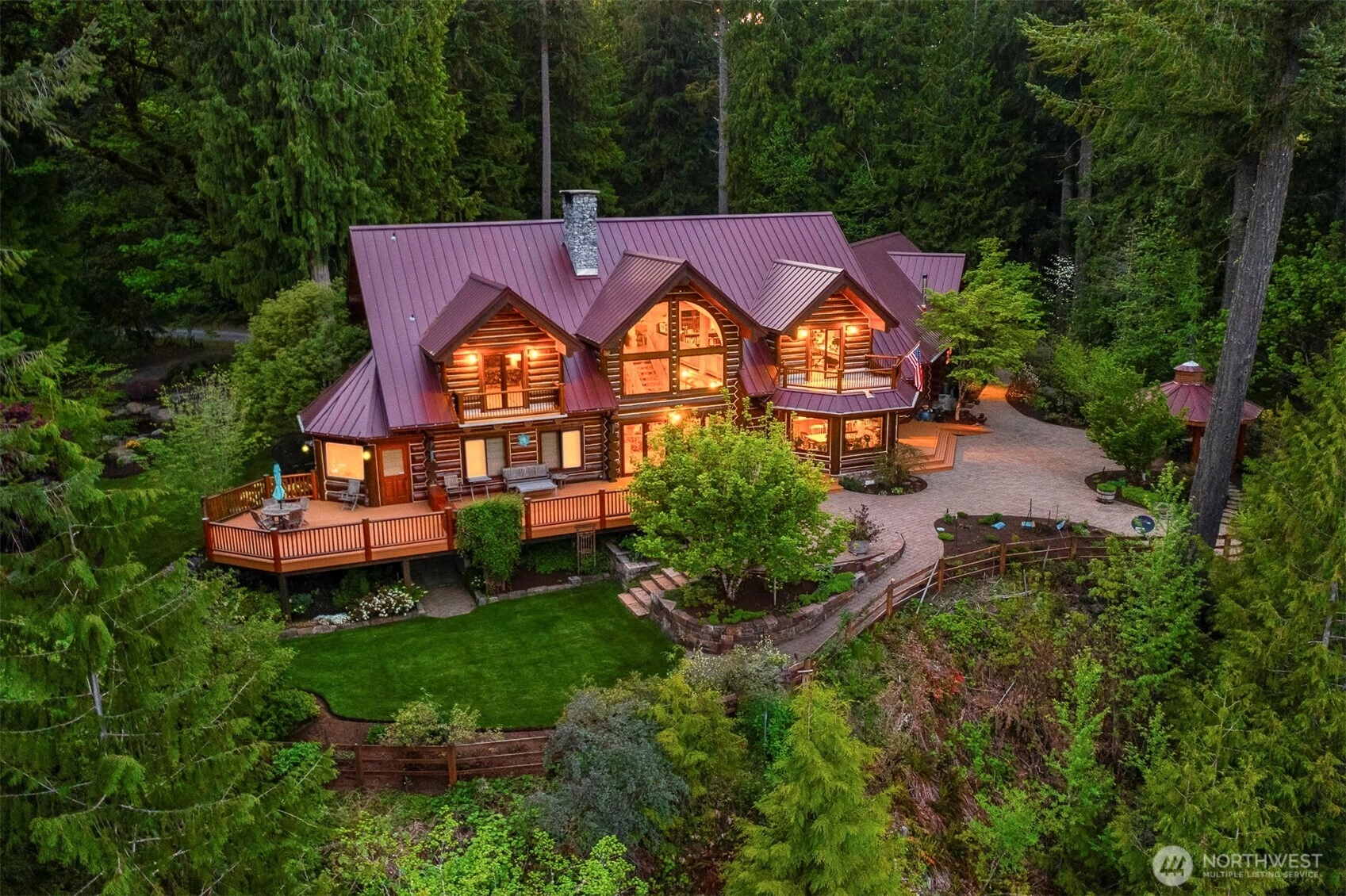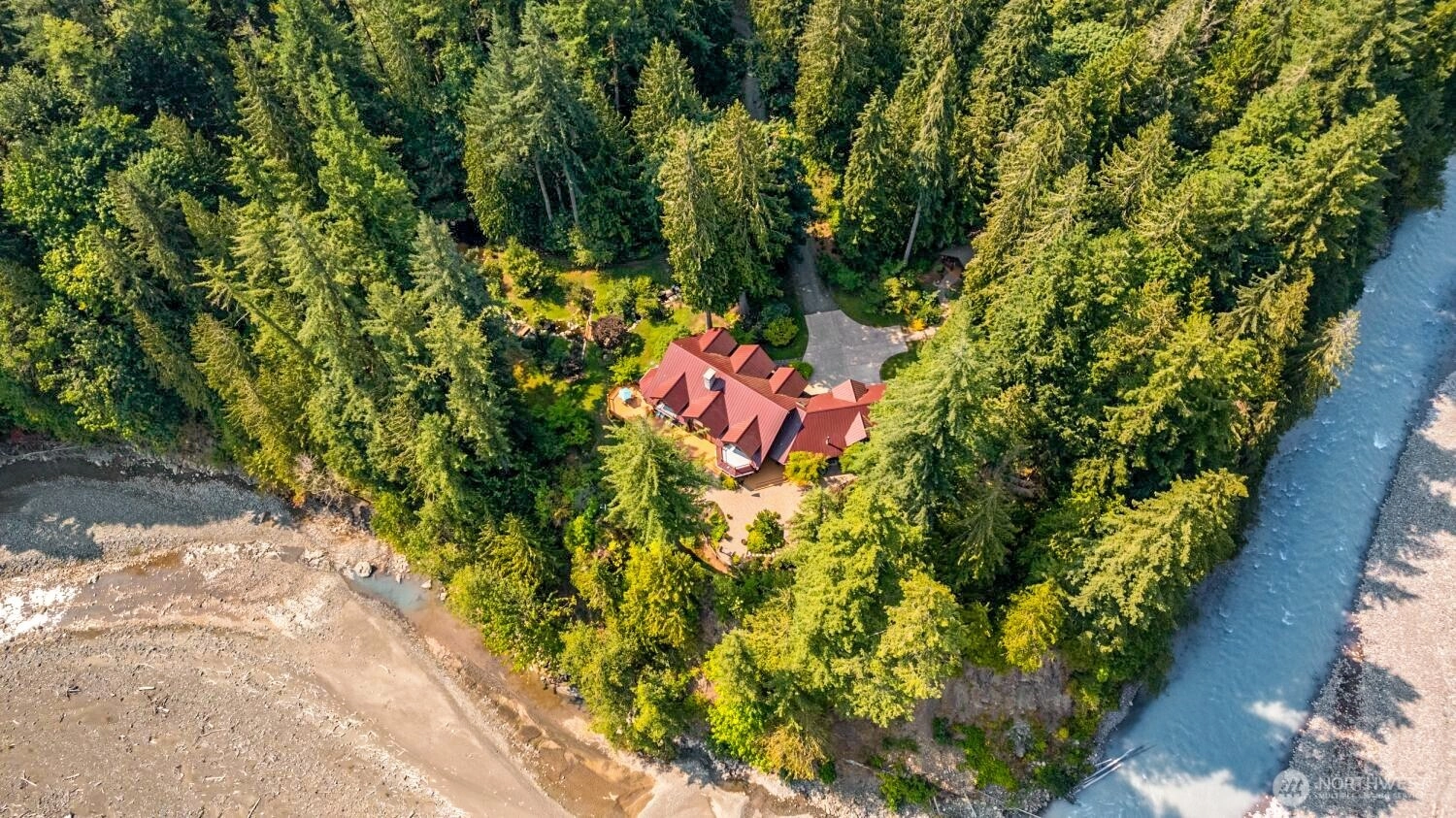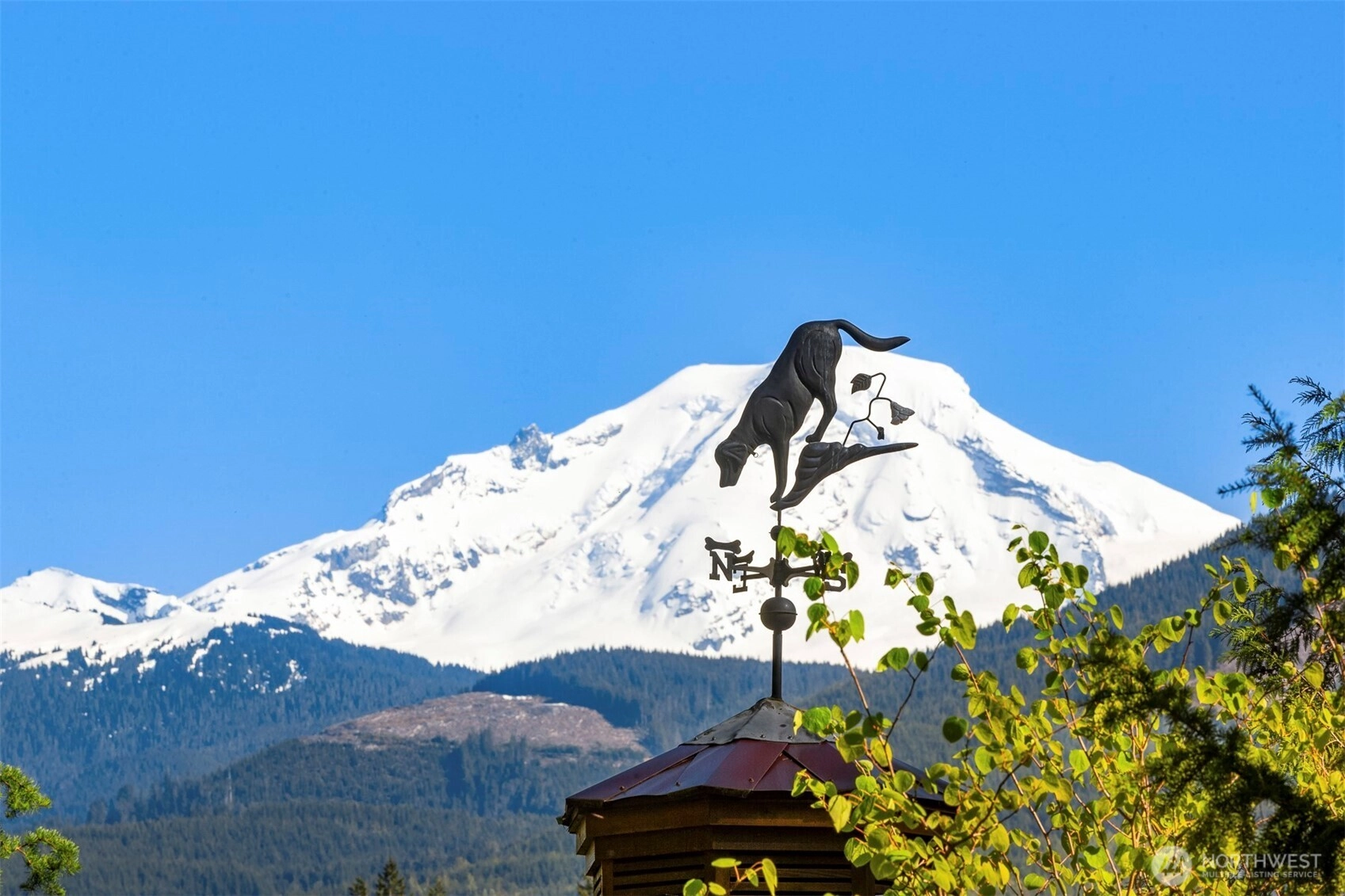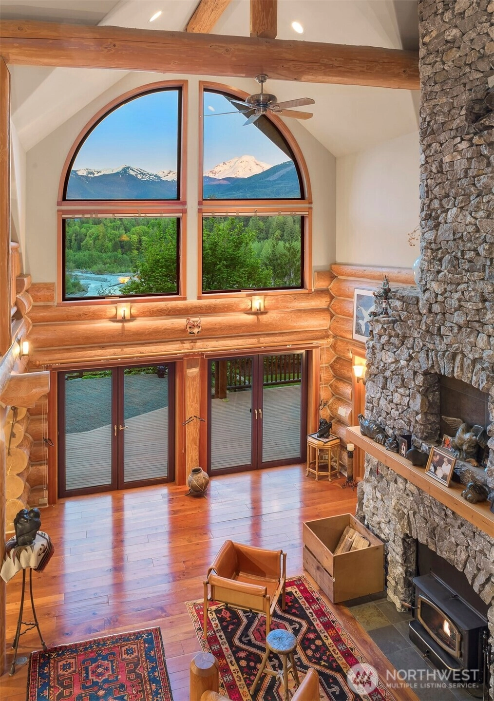 Embrace the grandeur of this Mt. Baker estate, boasting a mile of North Fork Nooksack River frontage across 15 acres. This majestic property offers an unparalleled après ski lifestyle with breathtaking panoramic views descending below the mountain range. The meticulously curated grounds feature serene waterfalls, meandering creeks, and tranquil ponds, crafting an exquisite year-round haven. Discover a true log estate crafted from the regions original fir logs to showcase exceptional artistry. The 30-foot vaulted ceilings create a grand ambiance, while a striking fireplace made entirely of local quarry limestone enhances the estate's elegance. This property is the epitome of refined living, blending natural beauty with sophisticated luxury.