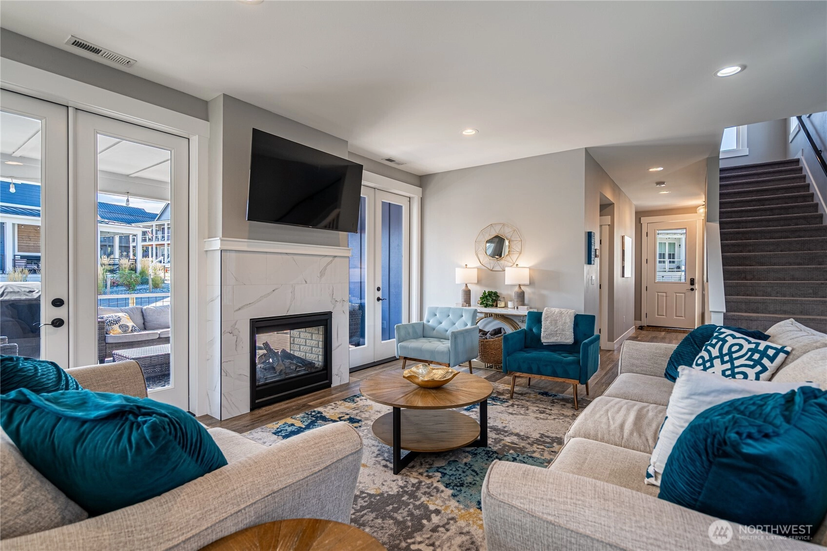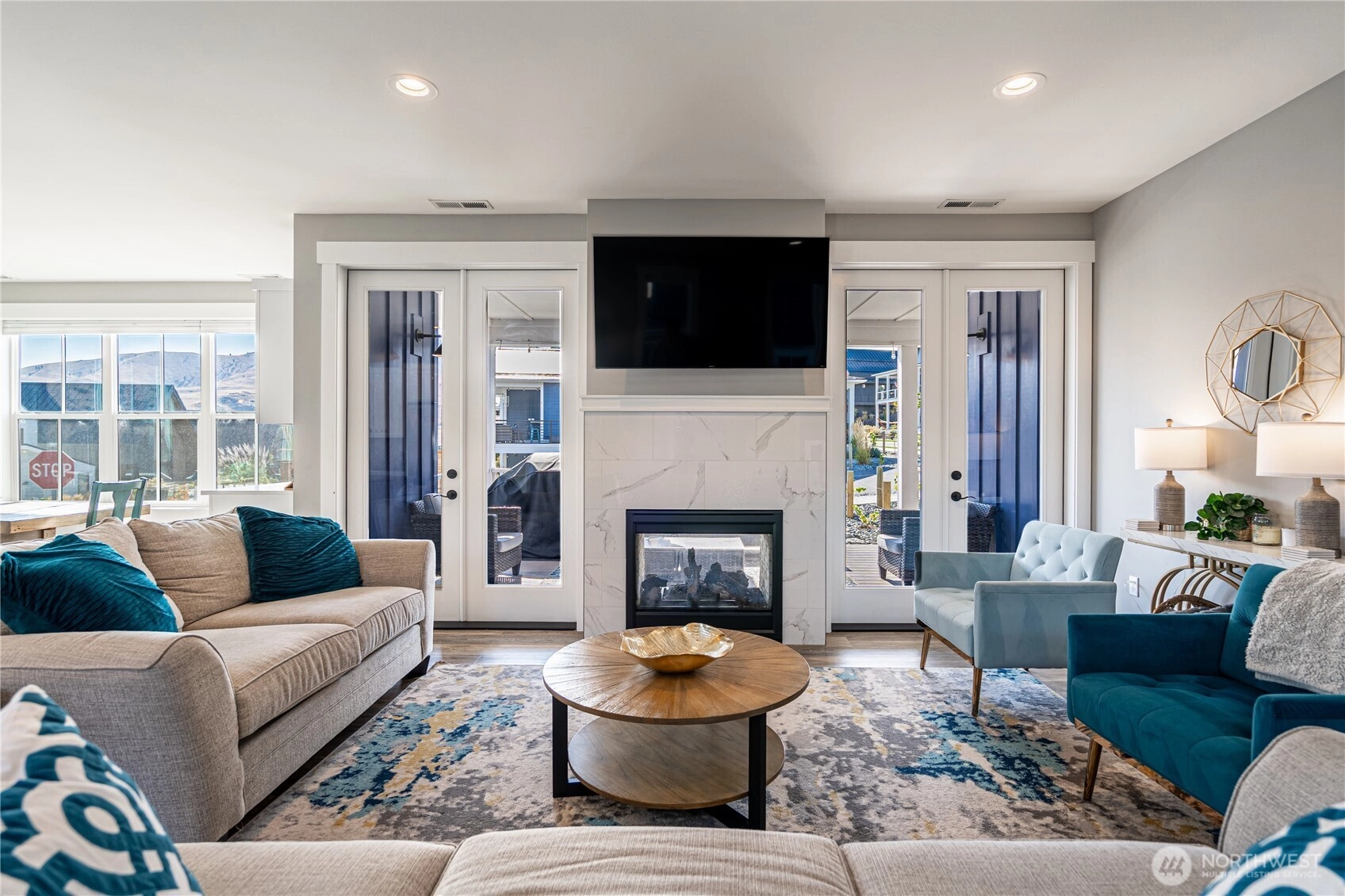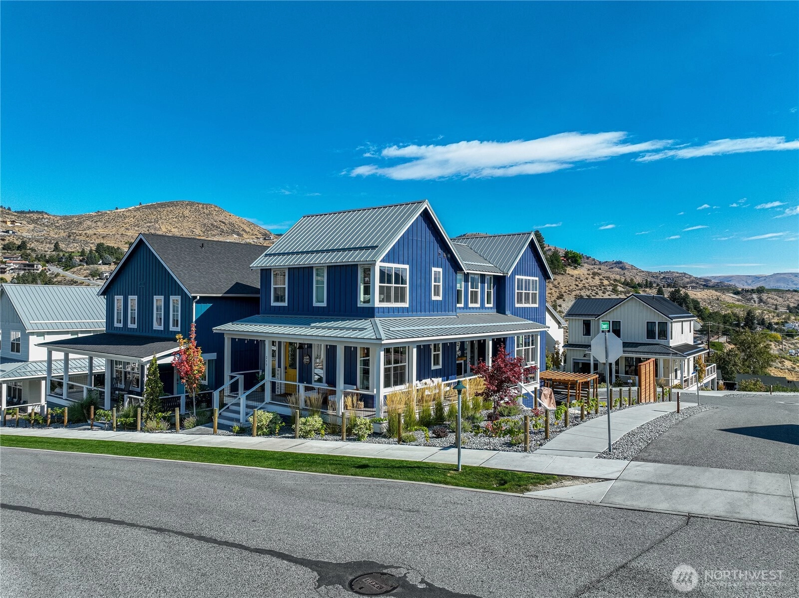 Beautifully appointed four bedroom home at the Lookout on a corner lot with lake and mountain views. The wrap around covered porch takes advantage of morning and afternoon sunshine. Open living area and main floor bedroom with an indoor/outdoor gas fireplace and double French doors that lead to the covered sitting area. Situated only a block and a half away from the pool, the Lookout has excellent year around rental history. Quartz countertops throughout and ample dining room area takes advantage of the views. Primary bedroom and 2 additional ensuite bedrooms make this a desirable floor plan for your vacation destination or vacation rental. Large garage and excellent rental history. Fully turnkey for your enjoyment. Hot tub and gas fire pit
