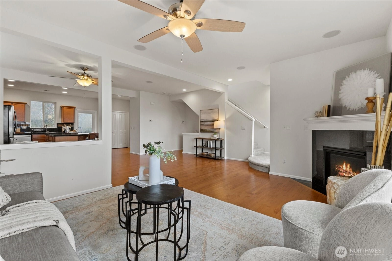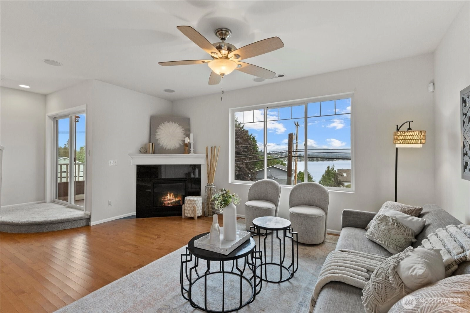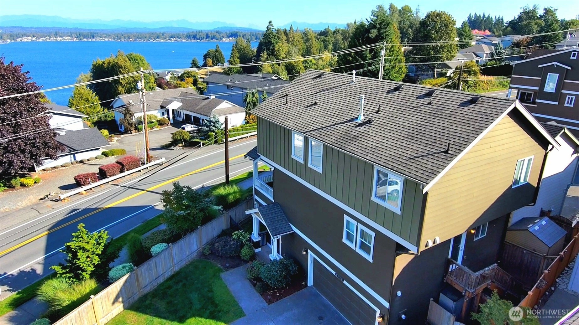 Lake Views! This 1,960 sq. ft. Lake Point home is perfectly placed to capture some of the best vistas in the neighborhood. The open great room with corner fireplace flows to a covered deck overlooking Lake Stevens. The kitchen features granite tile counters, Samsung appliances, and a breakfast bar. Upstairs, the primary suite offers a spa-inspired bath and walk-in closet. Central A/C, hardwired surround sound, new water heater installed in 2024, and a serviced furnace ensure comfort. A private driveway, oversized garage, and fully fenced patio complete this exceptional property—just minutes to Frontier Village and Lundeen Park.