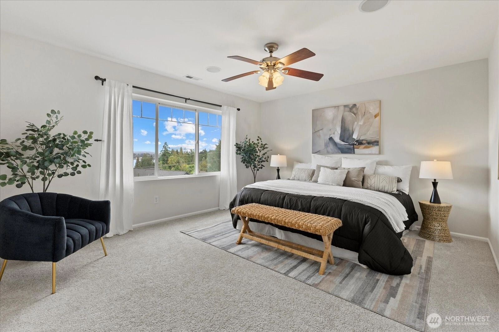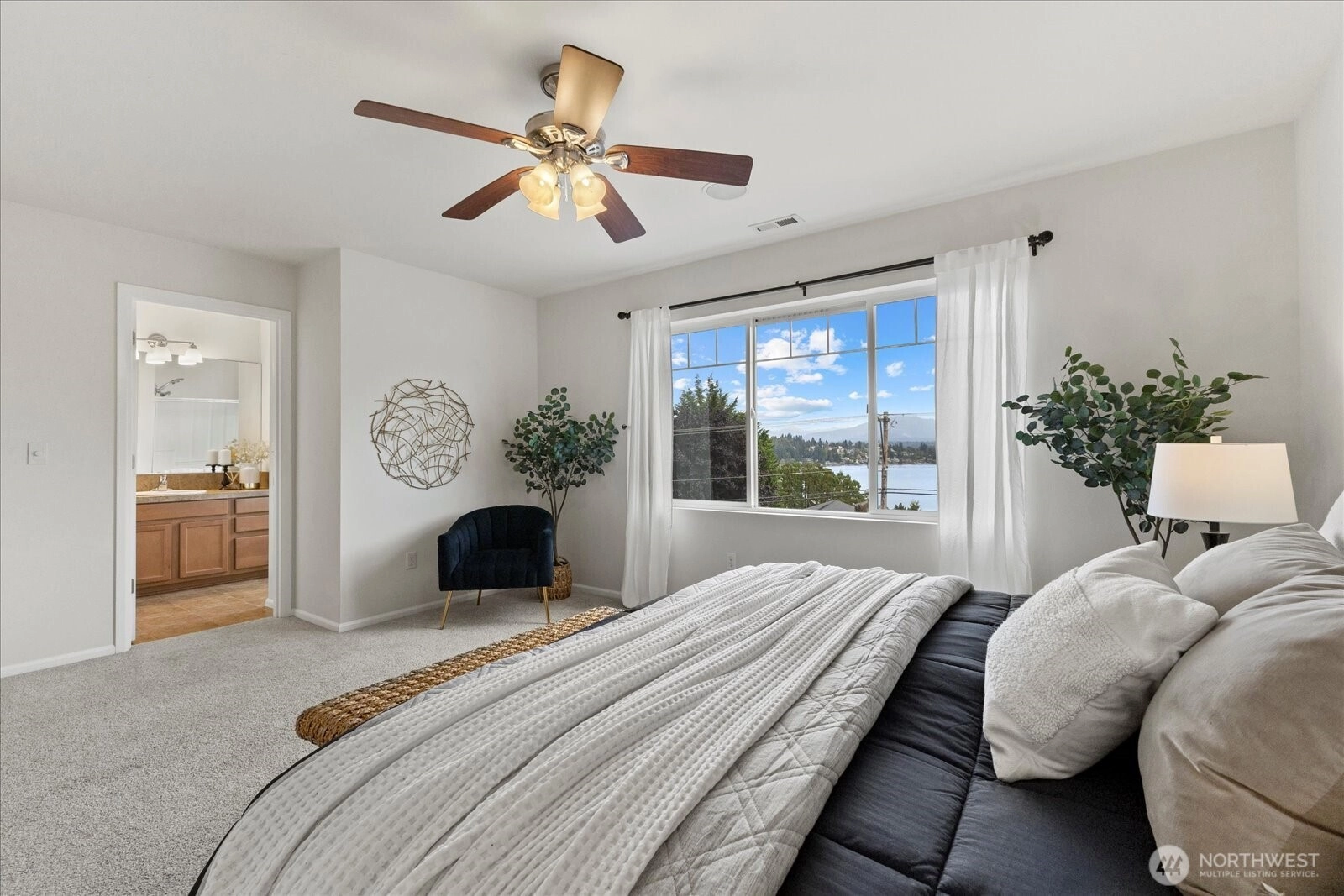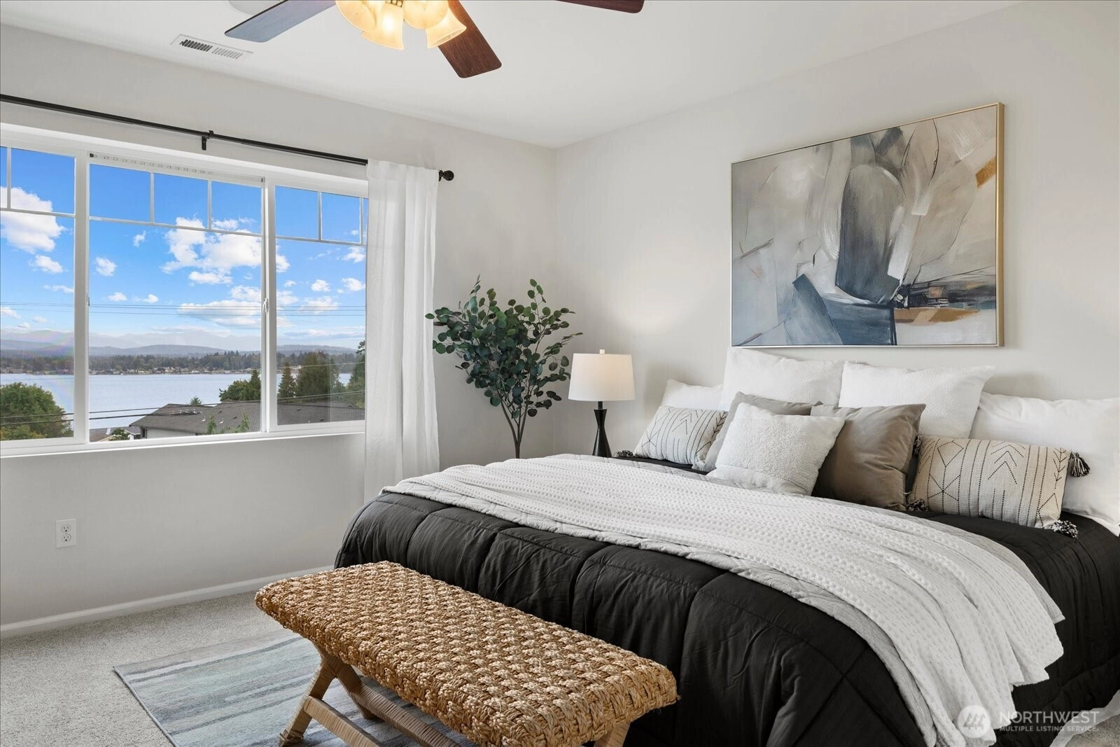 Lake Views! This 1,960 sq. ft. Lake Point home is perfectly placed to capture some of the best vistas in the neighborhood. The open great room with corner fireplace flows to a covered deck overlooking Lake Stevens. The kitchen features granite tile counters, Samsung appliances, and a breakfast bar. Upstairs, the primary suite offers a spa-inspired bath and walk-in closet. Central A/C, hardwired surround sound, new water heater installed in 2024, and a serviced furnace ensure comfort. A private driveway, oversized garage, and fully fenced patio complete this exceptional property—just minutes to Frontier Village and Lundeen Park.