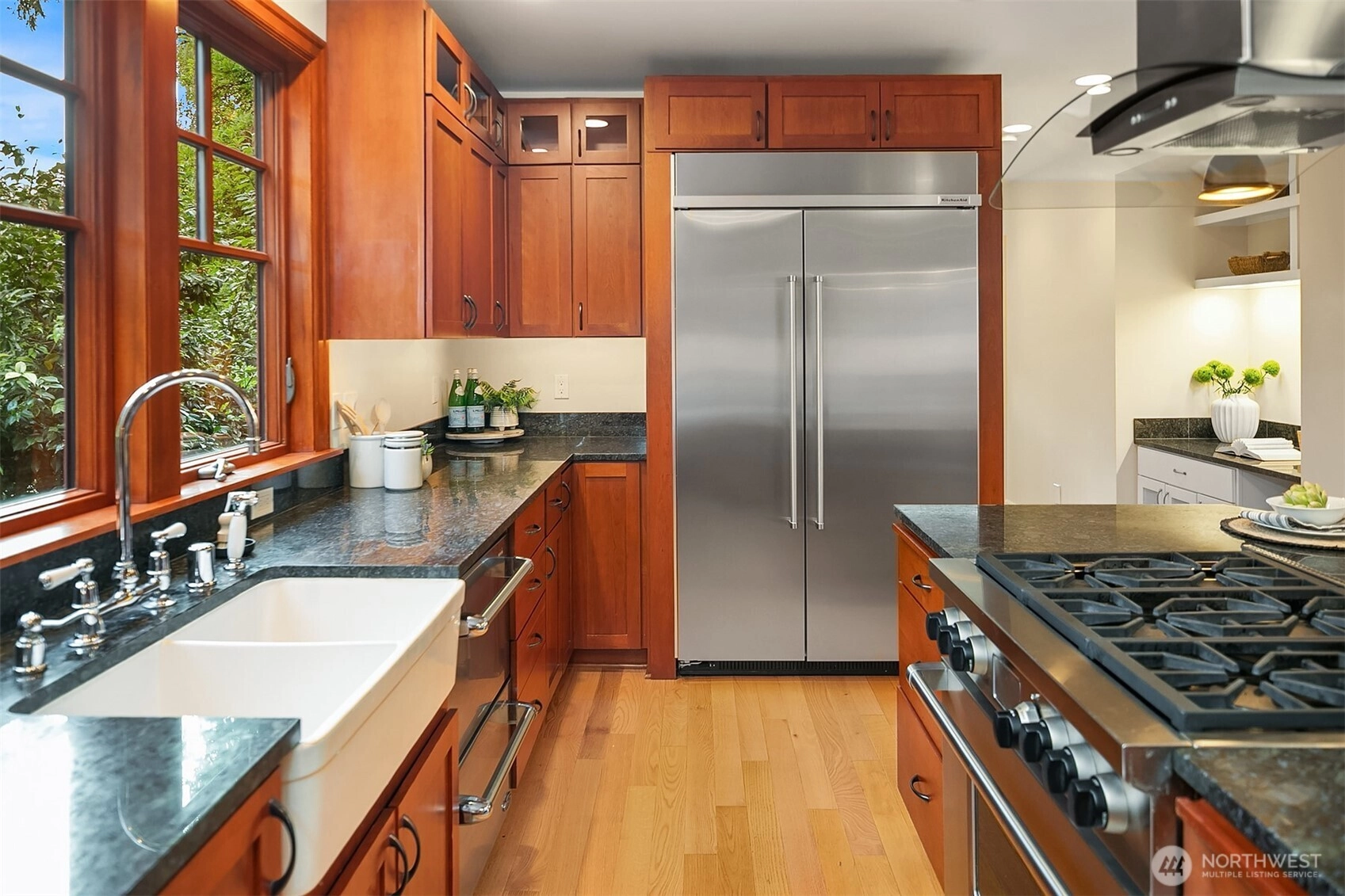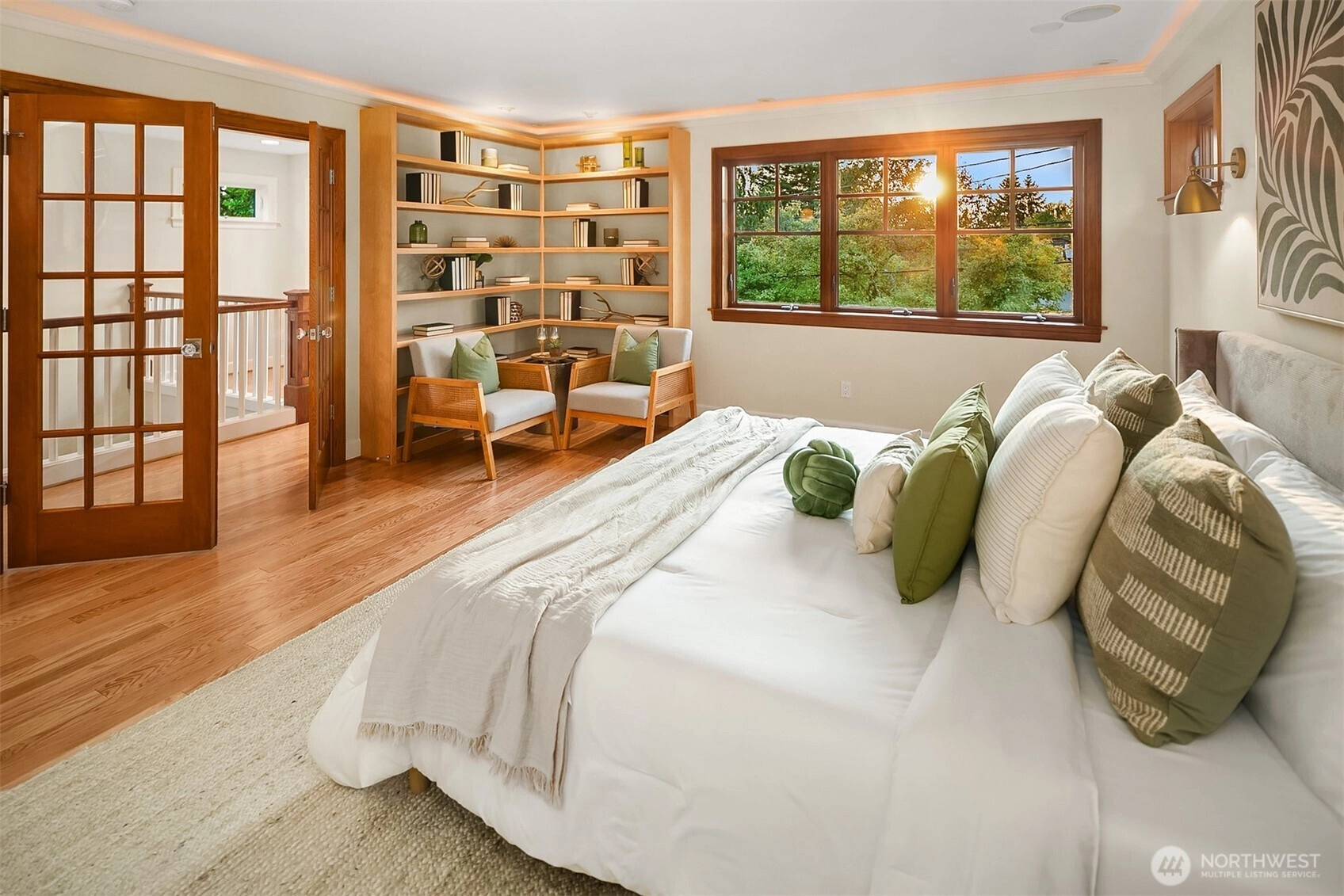 Four stories of true craftsmanship on a coveted block in Bryant. Reimagined in 2009, you’ll find features from the original 1926 Tudor blended with modern comforts in a functional layout. The richness of high ceilings, radiant heated floors and warm wood tones carries throughout. A chef’s kitchen anchors the living space of the main floor while the second floor holds the primary suite, 2 beds, a full bath, laundry and sitting room. Top floor has surprising views, 2 beds, a bath and moody sunsets from the balcony. Lower level could quickly be converted to an ADU; don’t miss the hidden wine cellar. Comfort abounds with 2 gas fireplaces, A/C, and solar. Fully fenced backyard and heated garage. Walkable to cafes, shops and highly rated schools.
