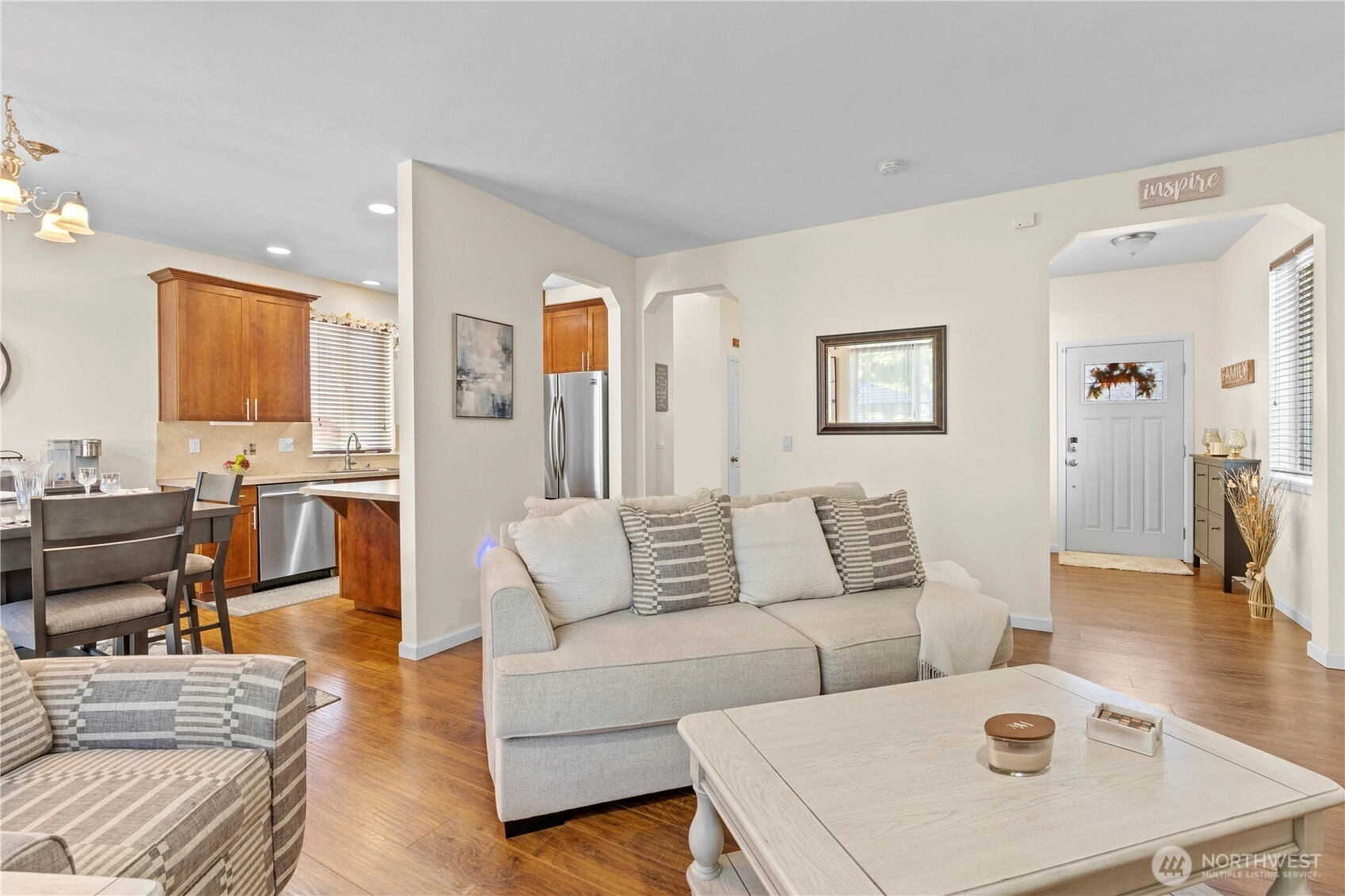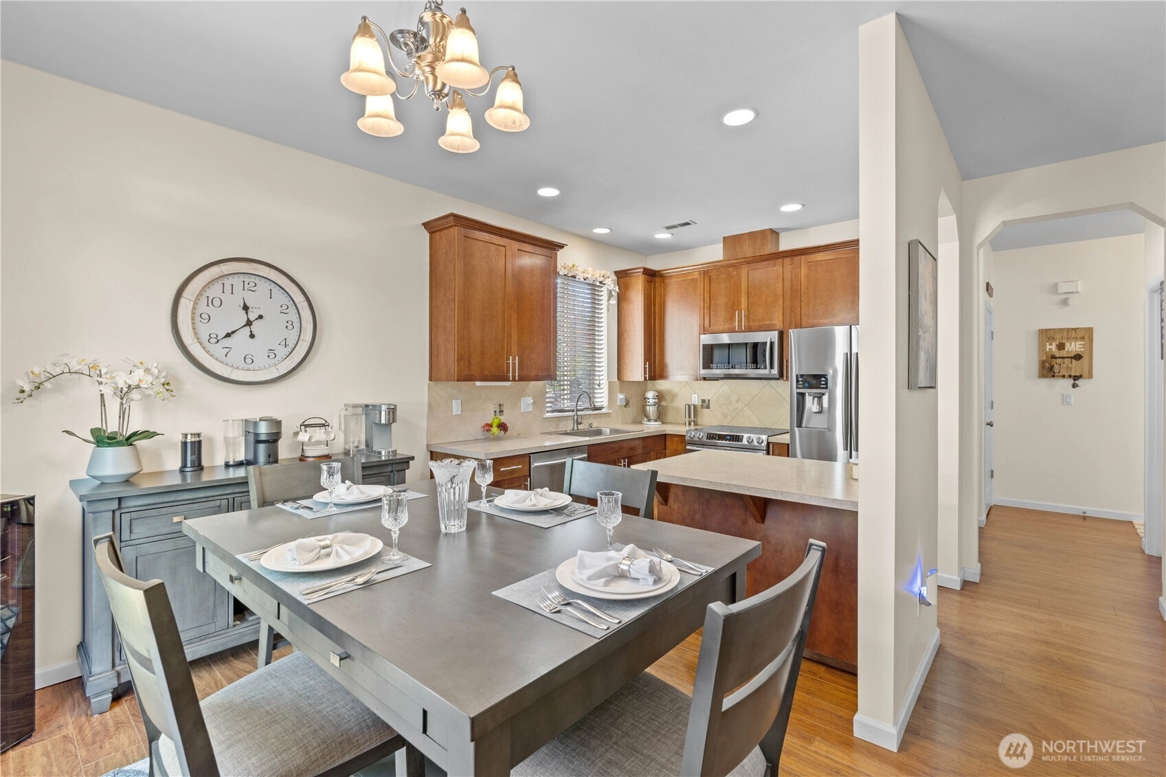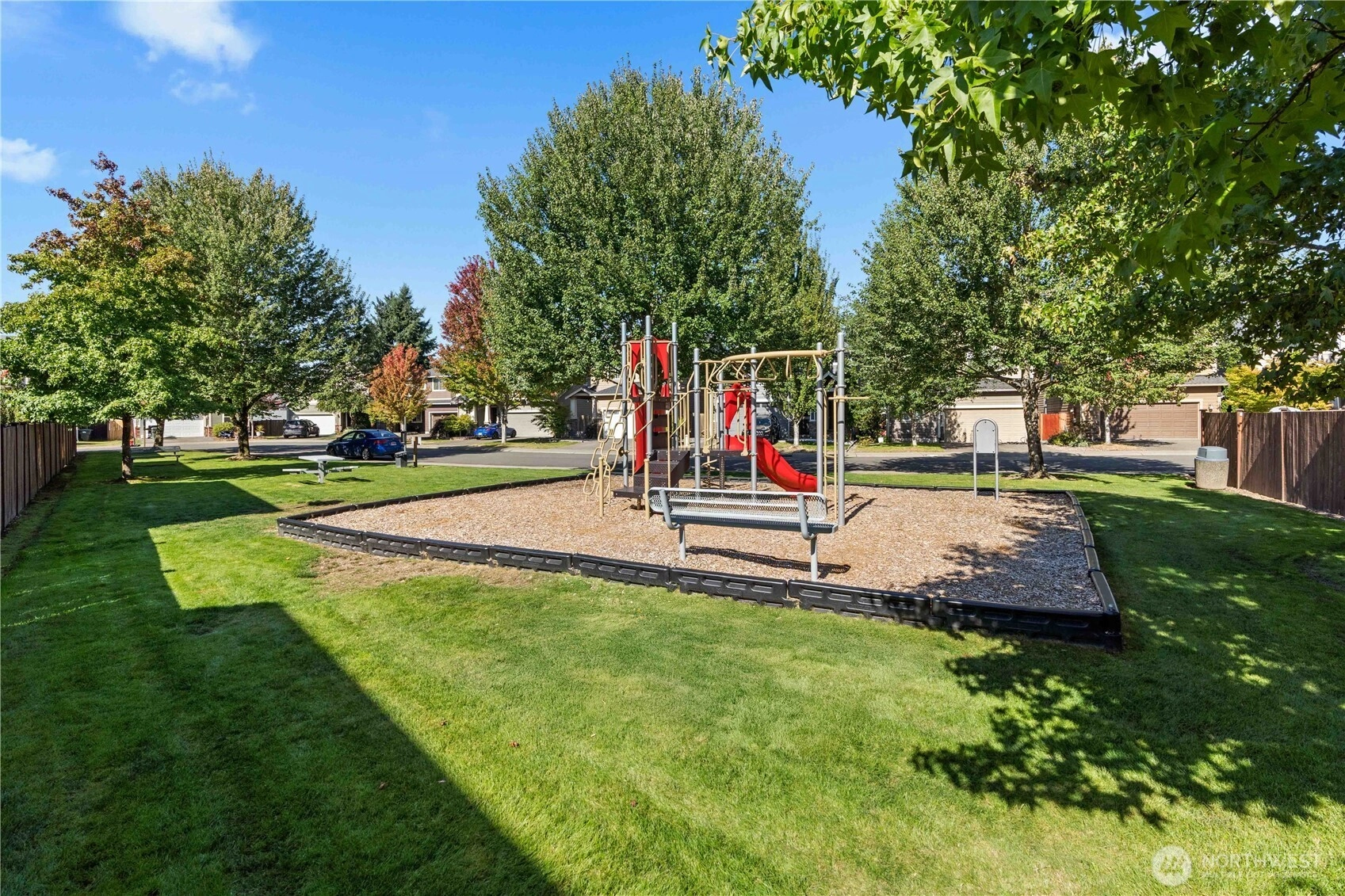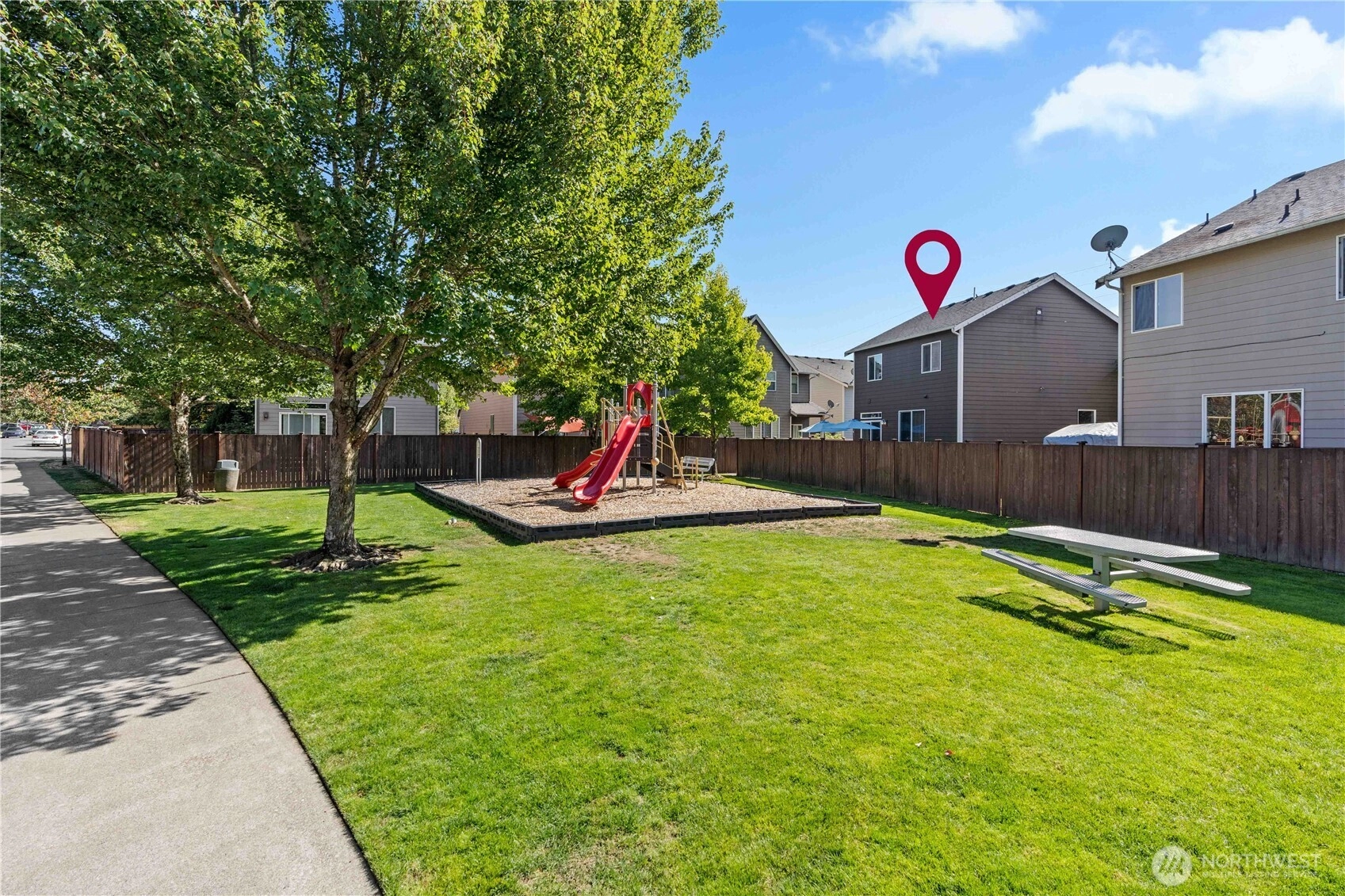 Welcome to easy living in Navarro, inside sought-after Gem Heights in Puyallup! This beautifully maintained 4-bed, 2.5 bath home has a perfect flowing layout. The open & bright living room flows seamlessly into the dining area & kitchen for easy everyday living & fun entertaining opportunities. The kitchen's island/peninsula fits stools for casual dining. Stainless appliances keep it classy. Upstairs, you will find your primary suite w/attached bath & walk-in closet. Three more spacious bedrooms, a full hall bath, & convenient upstairs laundry complete your new home. A slider off your dining area leads to a fully fenced, low-maintenance backyard w/patio. Don't miss the park right behind! Just minutes from shopping, dining, & commuting!