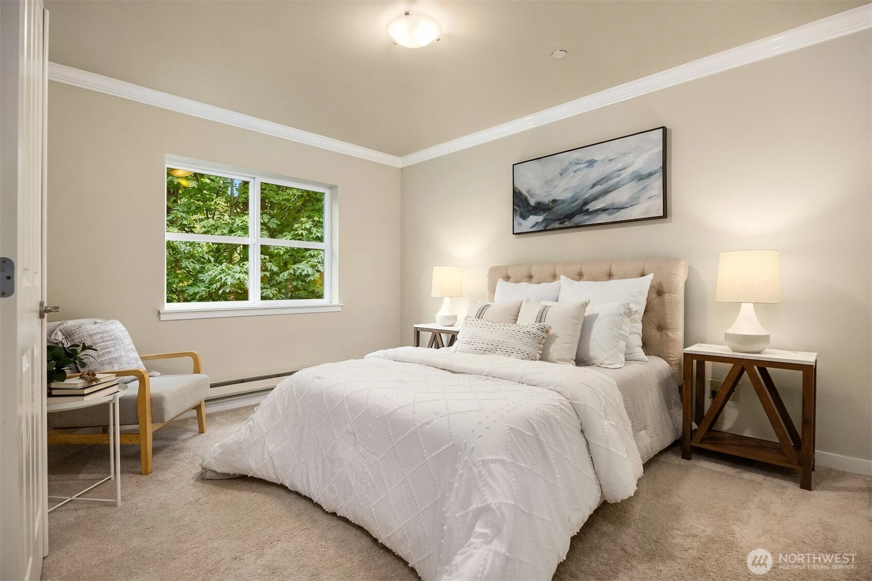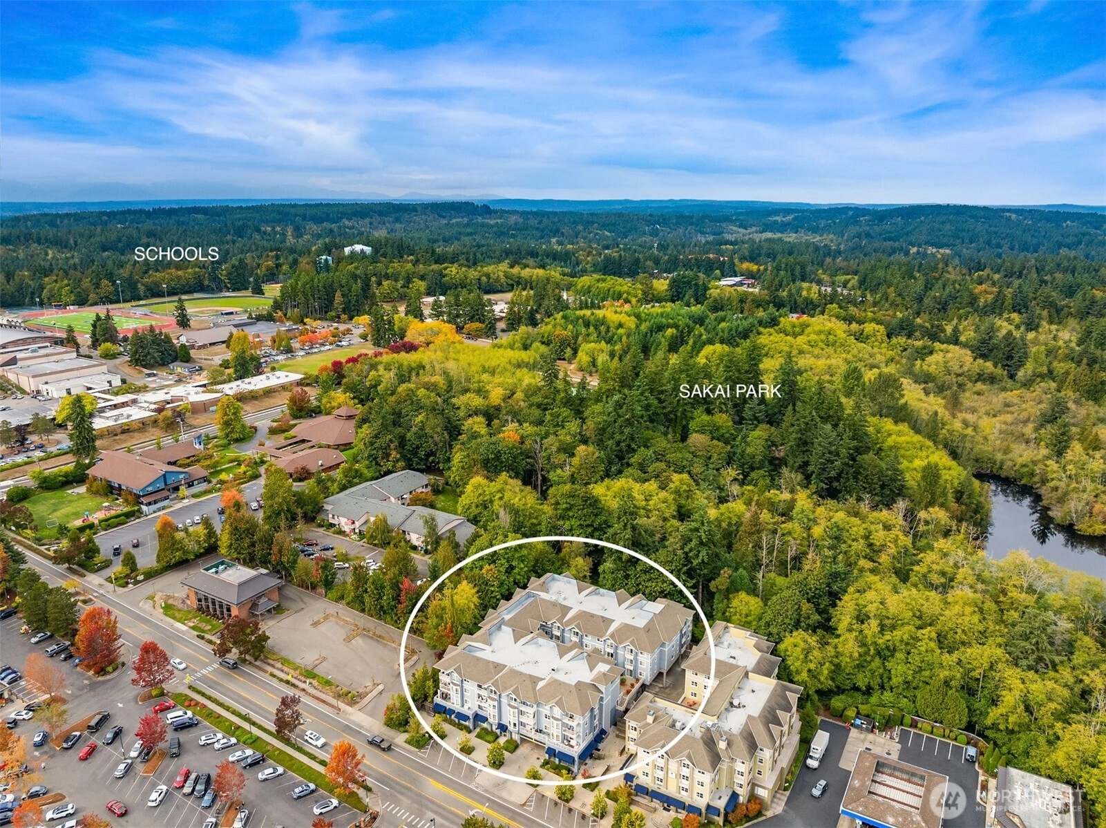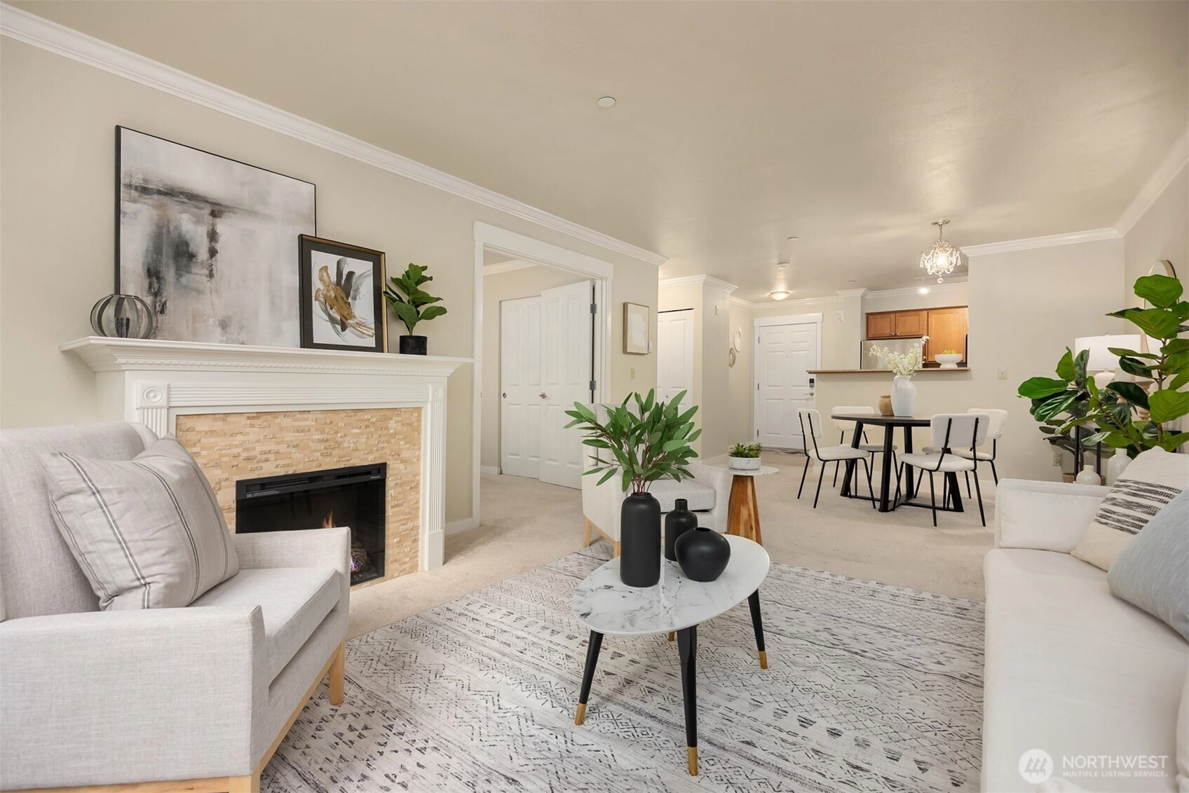 Welcome to Island Crossings, a condominium close to shopping, public transit, and island amenities such as an aquatic center and library. This one-bedroom home has been lightly lived in and well maintained. Granite countertops and stainless steel appliances adorn the kitchen and crown molding adds a touch of elegance. The living room is anchored by an electric fireplace with deep mantel. Enjoy a dedicated, covered parking space in a secure garage, and building access from lobby with code or key only. An elevator will whisk you to the third floor, where this home is located on the quiet north side of the building. Windows overlook 2+ acres of forested open space that abuts the 22-acre Sakai Park.