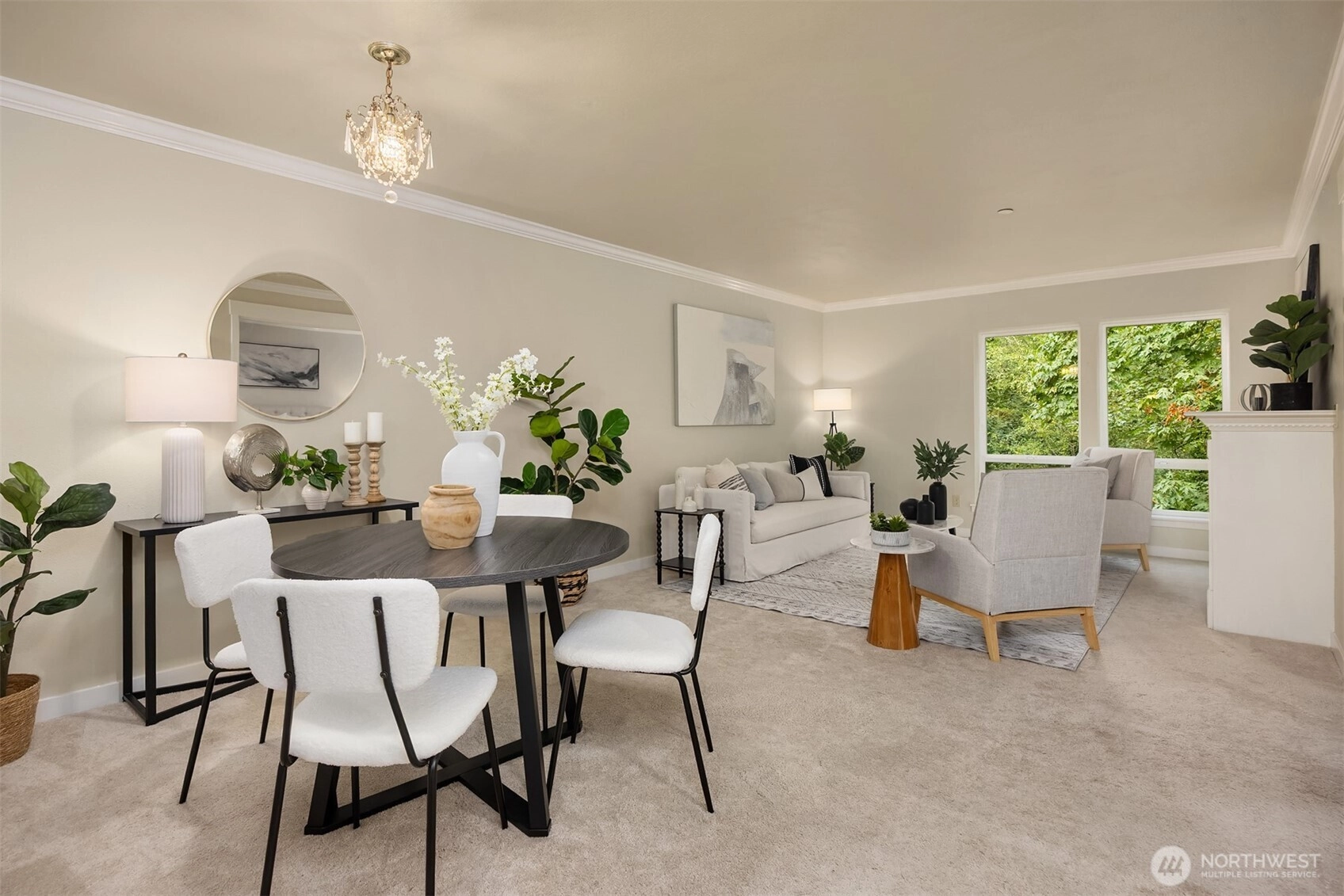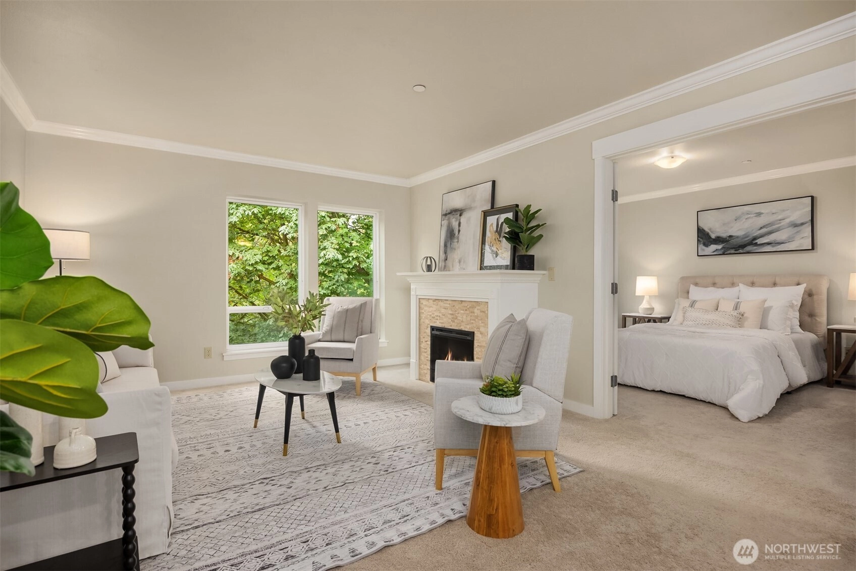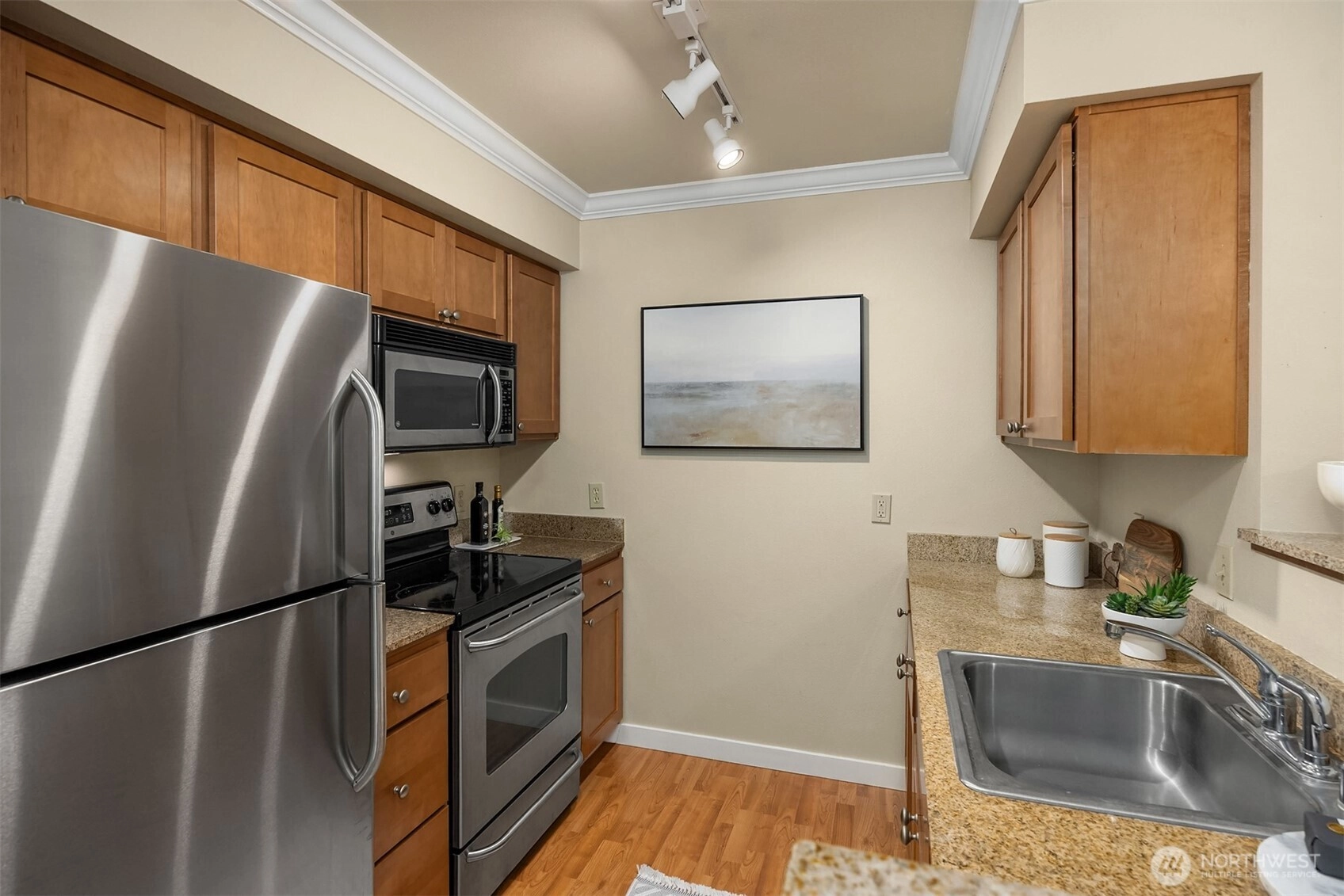 Welcome to Island Crossings, a condominium close to shopping, public transit, and island amenities such as an aquatic center and library. This one-bedroom home has been lightly lived in and well maintained. Granite countertops and stainless steel appliances adorn the kitchen and crown molding adds a touch of elegance. The living room is anchored by an electric fireplace with deep mantel. Enjoy a dedicated, covered parking space in a secure garage, and building access from lobby with code or key only. An elevator will whisk you to the third floor, where this home is located on the quiet north side of the building. Windows overlook 2+ acres of forested open space that abuts the 22-acre Sakai Park.