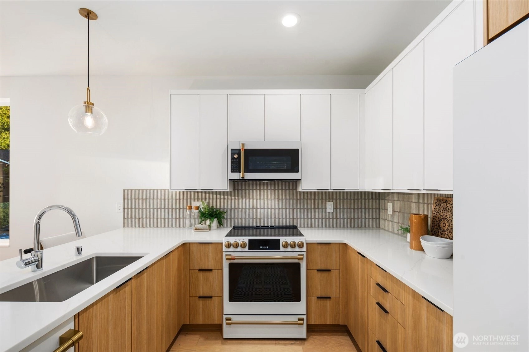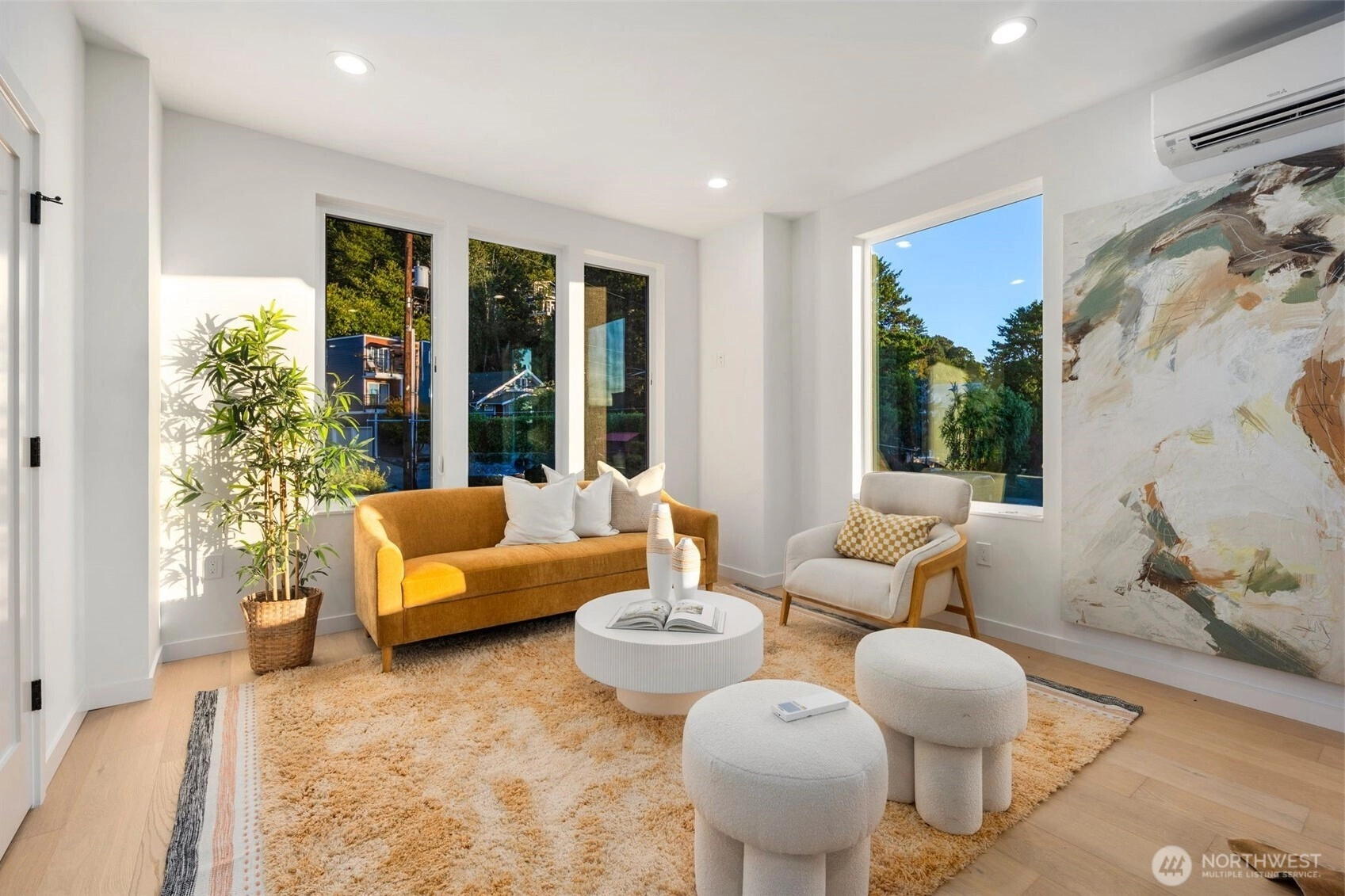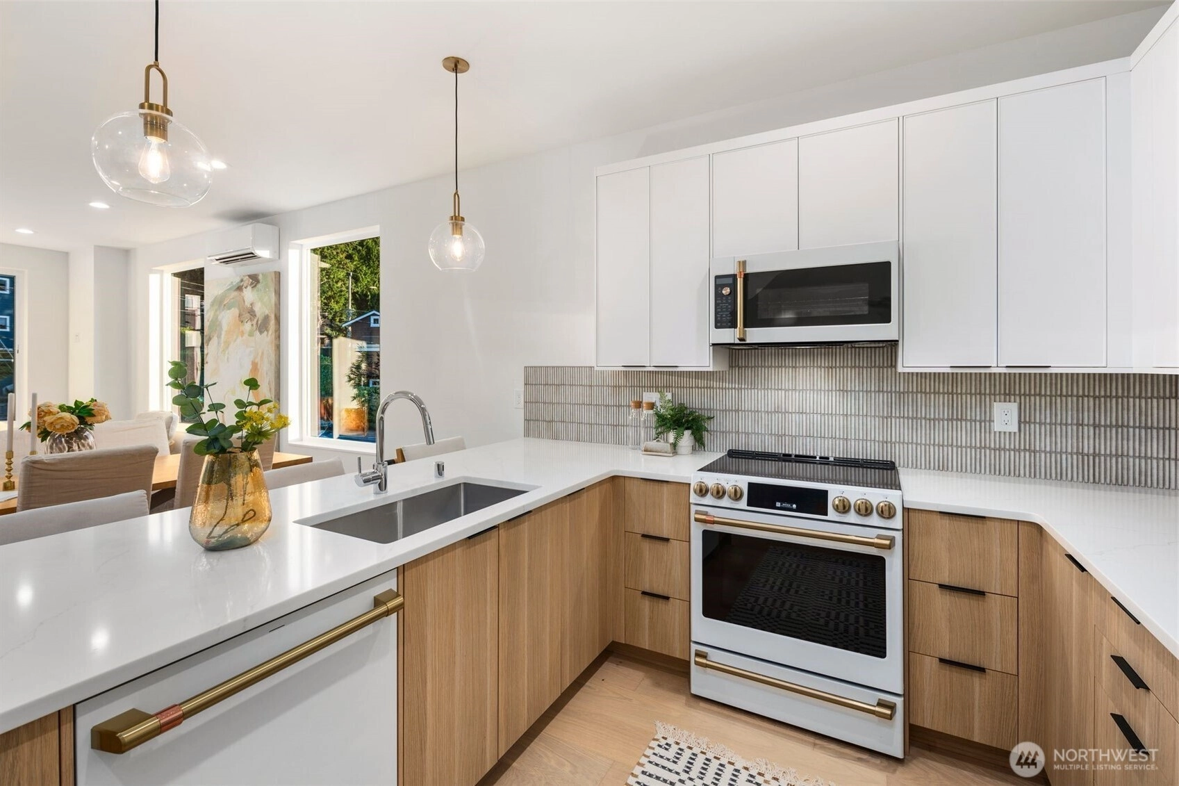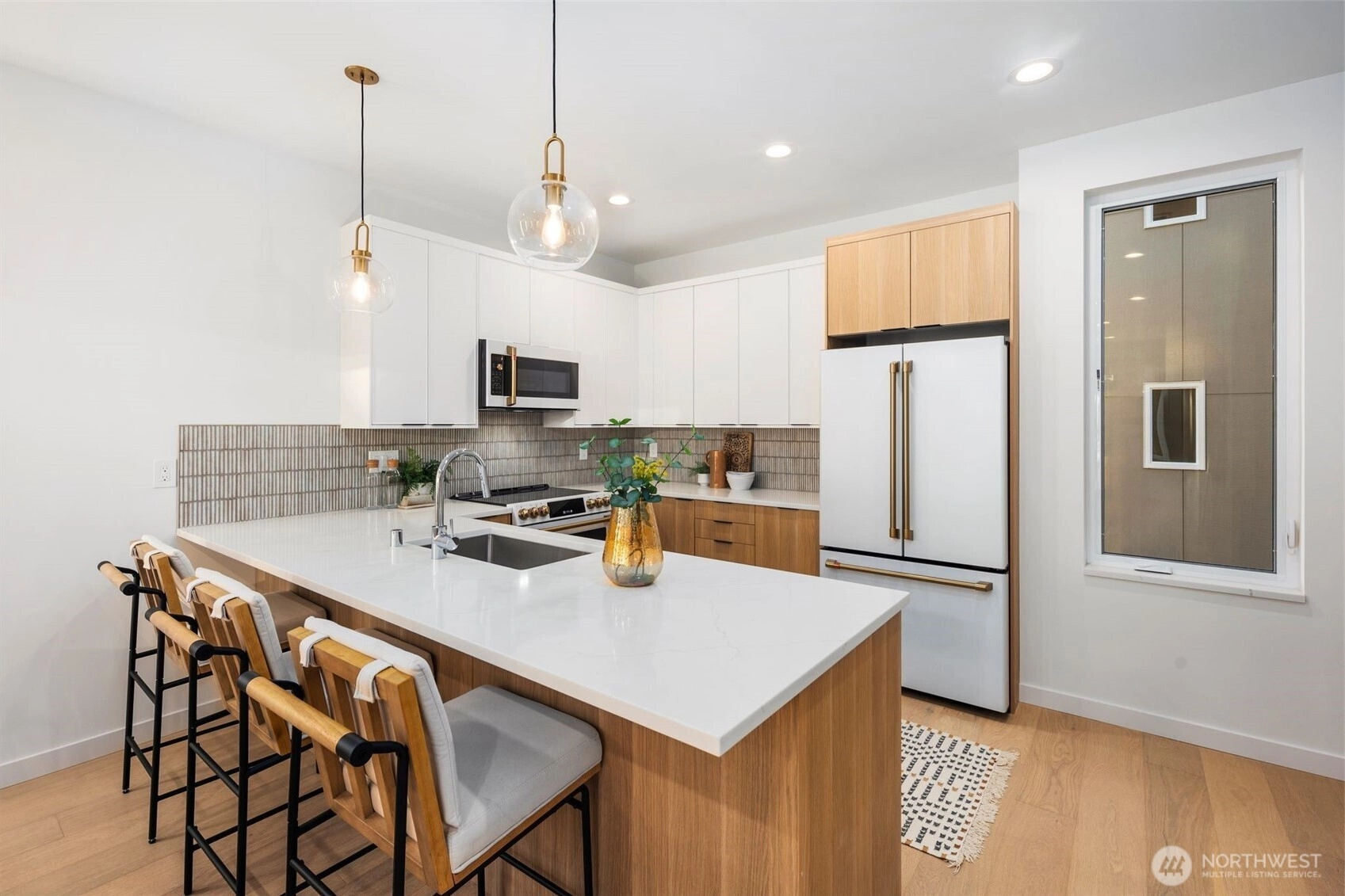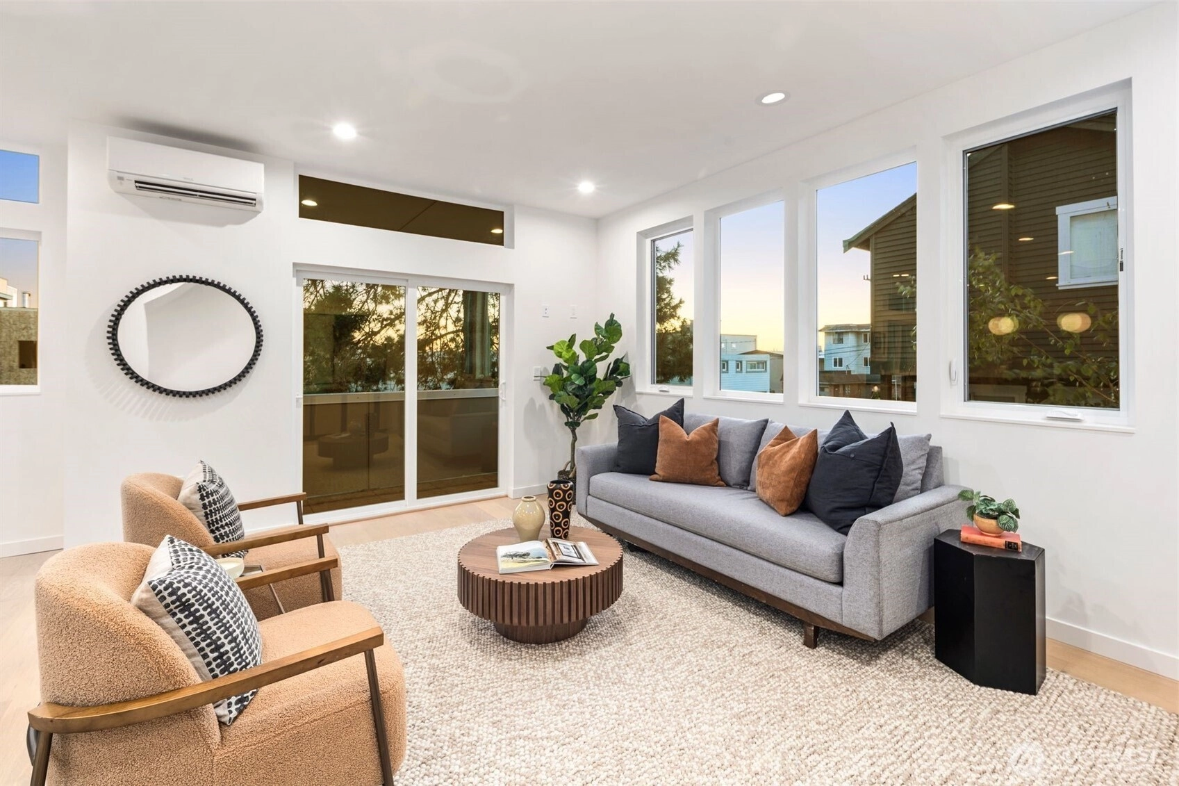 Last Townhome Remaining!! Stunning Olympic Mountain sunsets, exquisite interior designer influenced finishes showcase these custom residences. Centerpiece kitchen with Bellmont cabinetry, white Cafe appliances accented by stylish fixutres & backsplash & soft tone hardwood floors. An open floorplan with tall vertical windows captures the abundance of natural light. Lutron Caseta smart lighting. Primary w/ dual vanity bath, heated floors, walk-in shower. 2 additional bedrooms provide an excellent opportunity for guests or a home office. Beautiful rooftop decks to enjoy the amazing sunshine against the backdrop of the Sound. Dedicated 1-car parking EV prepped. Walk to the beach/bike to Alki and enjoy the unique splendor of West Seattle.