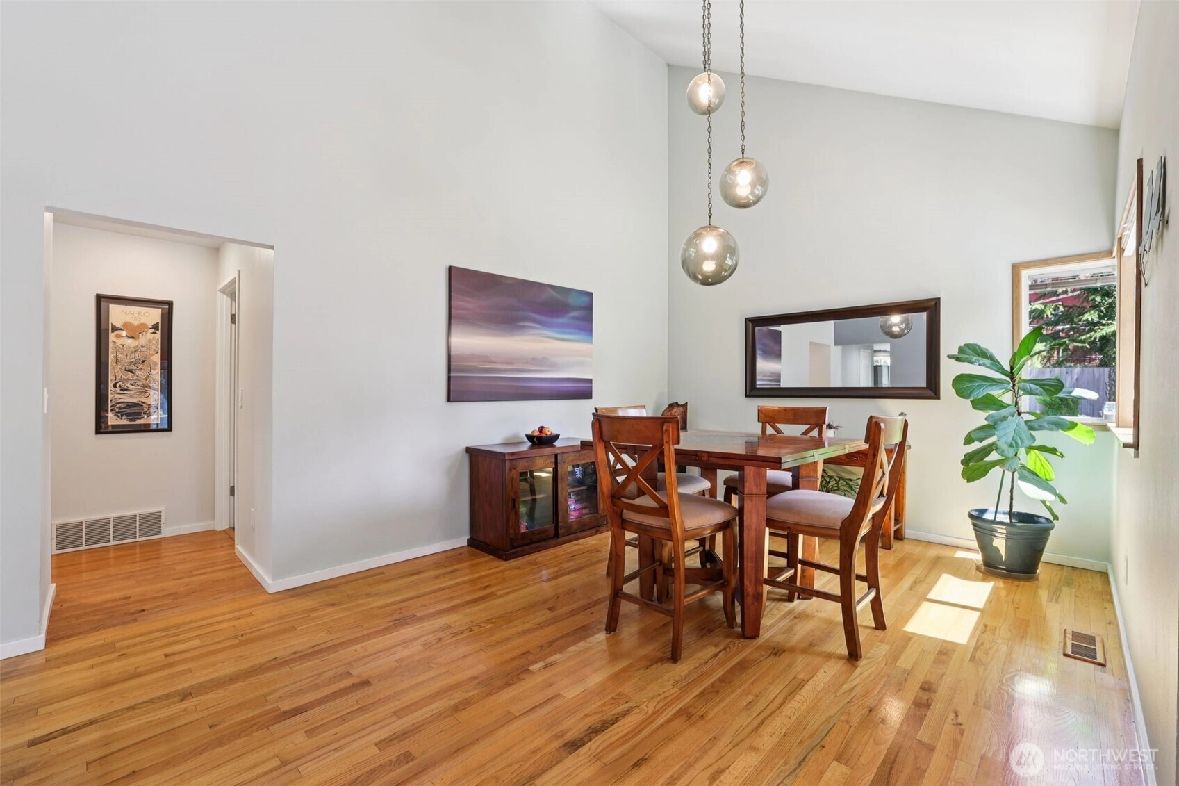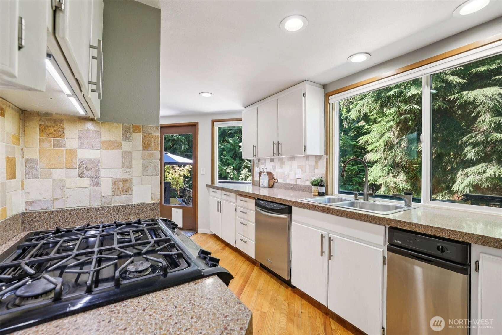 Multi-level NW contemporary with tall ceilings and walls of windows, a Large primary suite with tons of closet space, spa-like bath and ensuite laundry. Great outdoors for entertaining with wraparound deck and large patio in a private setting. Walkout basement offers a 2nd kitchen, laundry, non-conforming 4th bedroom with separate entrance and flex rooms/storage/office/gym. 2 car garage, carport and large storage shed. Upgrades include newer windows, remodeled baths, dog run, fully fenced back yard and 200 amp service. Lot A rights to The Cove with private beach, pickleball/tennis and clubhouse. Short walk to parks and shopping and easy access to light rail and 509 to downtown. Move in ready and offered at $200K below June appraisal.