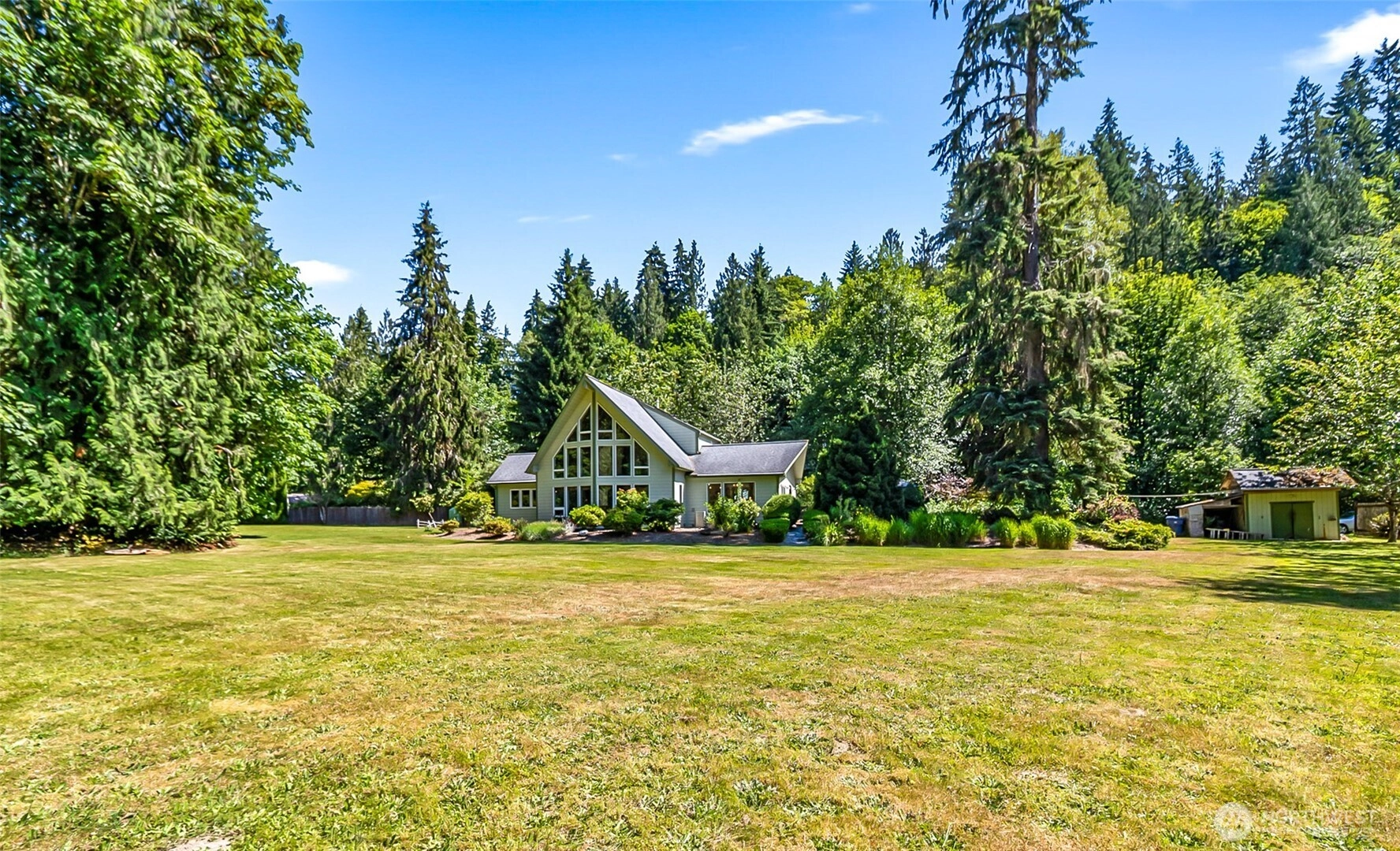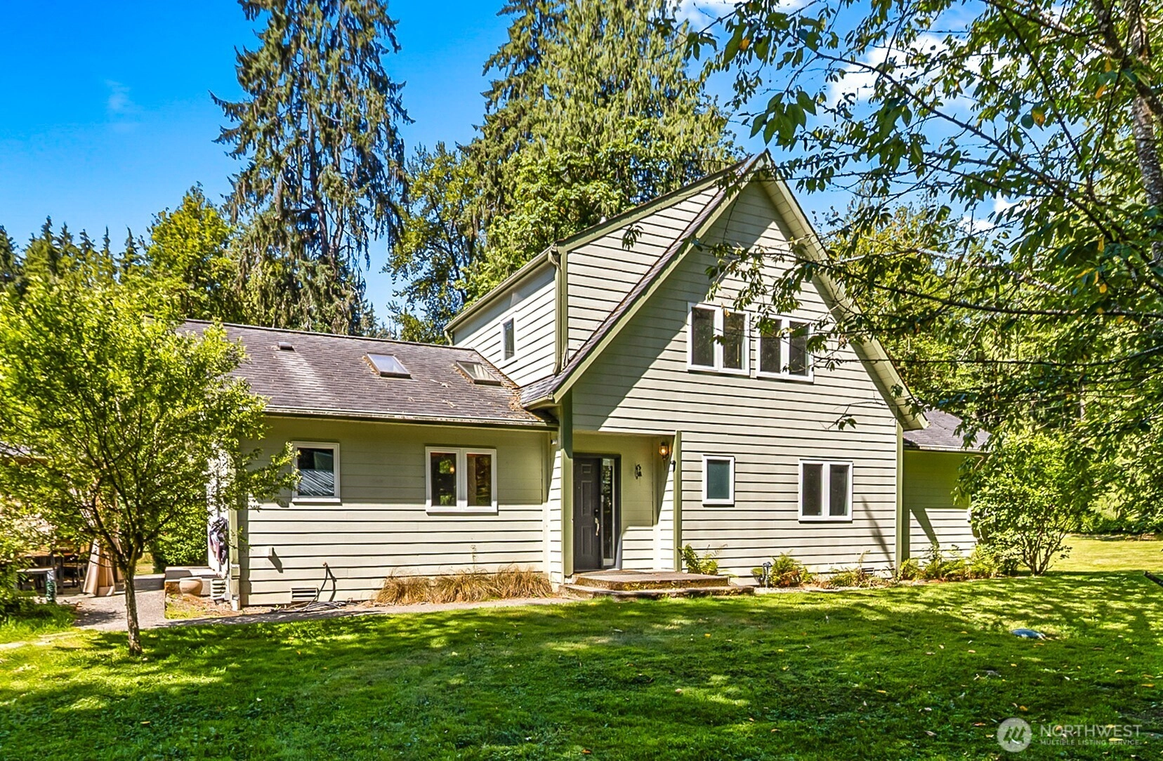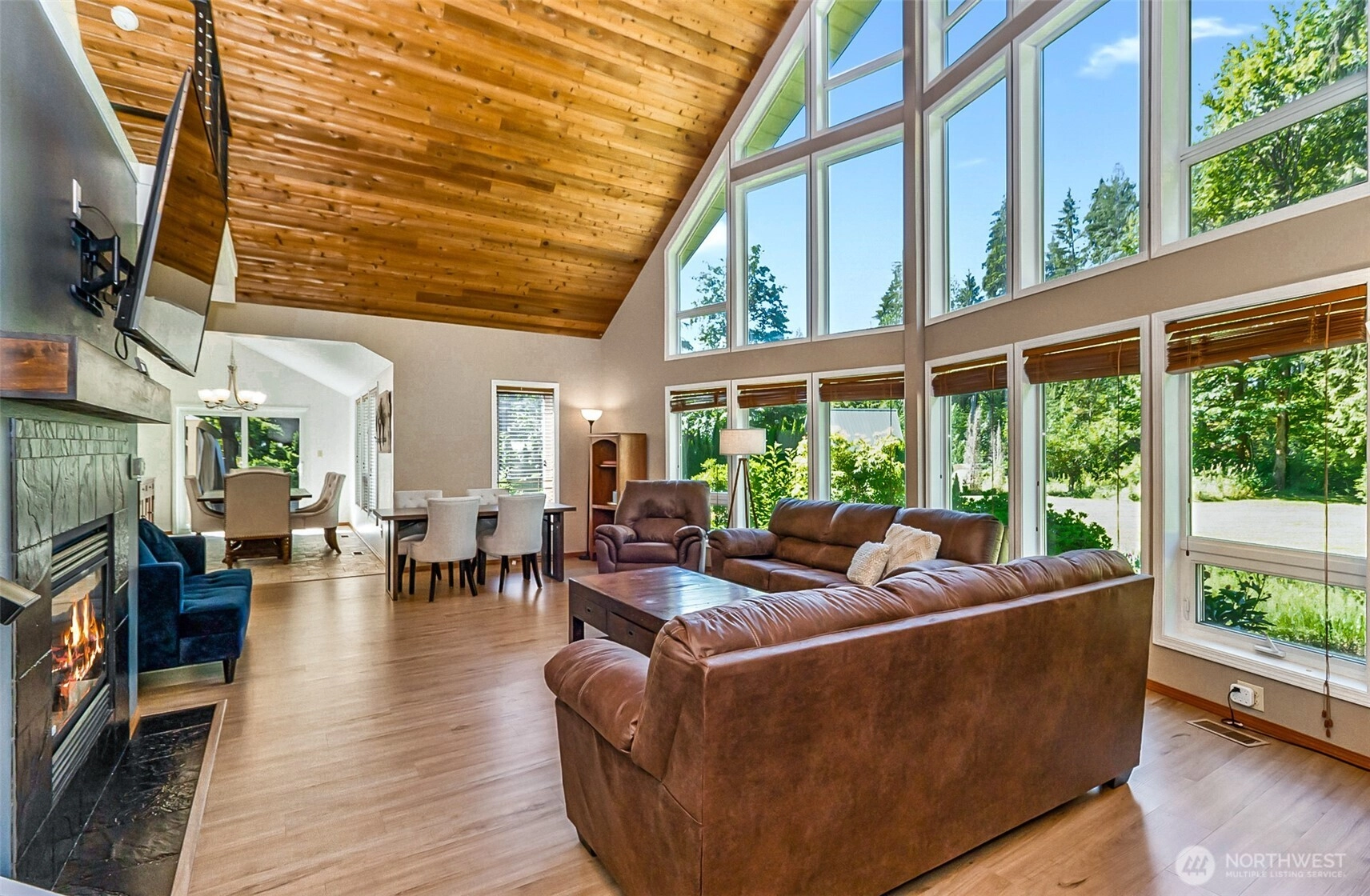 This exceptional property provides privacy, seclusion, beautiful waterfront and a gorgeous home. The tiled entry welcomes you to open spaces with vaulted ceilings, full wall of windows & gas fireplace in the fantastic living room. Holiday sized dining room opens to the covered patio w/hot tub. The kitchen is bright, open and includes quality appliances & cabinetry, gas range & breakfast bar. Two bedrooms on the main level include the primary with luxurious bath and walk-in closet. A second primary suite on the upper level also has a full bath, walk-in closet & balcony with a view of the water. Welcome natural light throughout & the view is inspiring. Level, sunny 2.3 acre lot with mature landscaping, firepit, horseshoes, generous parking.