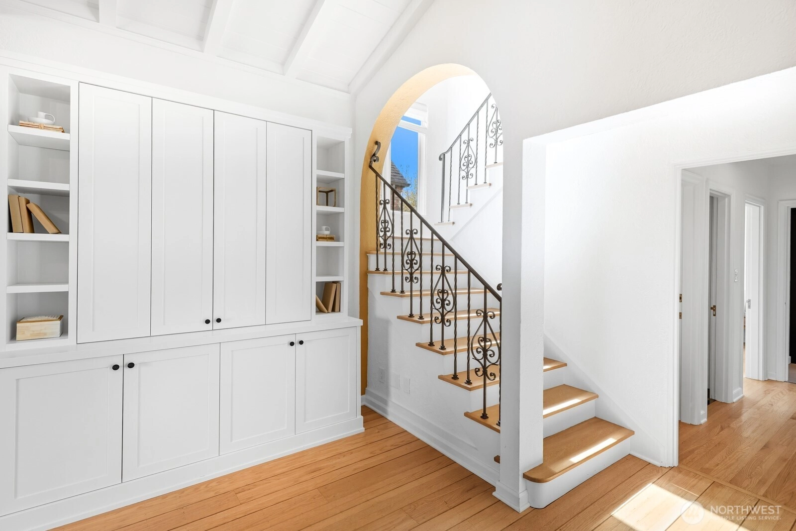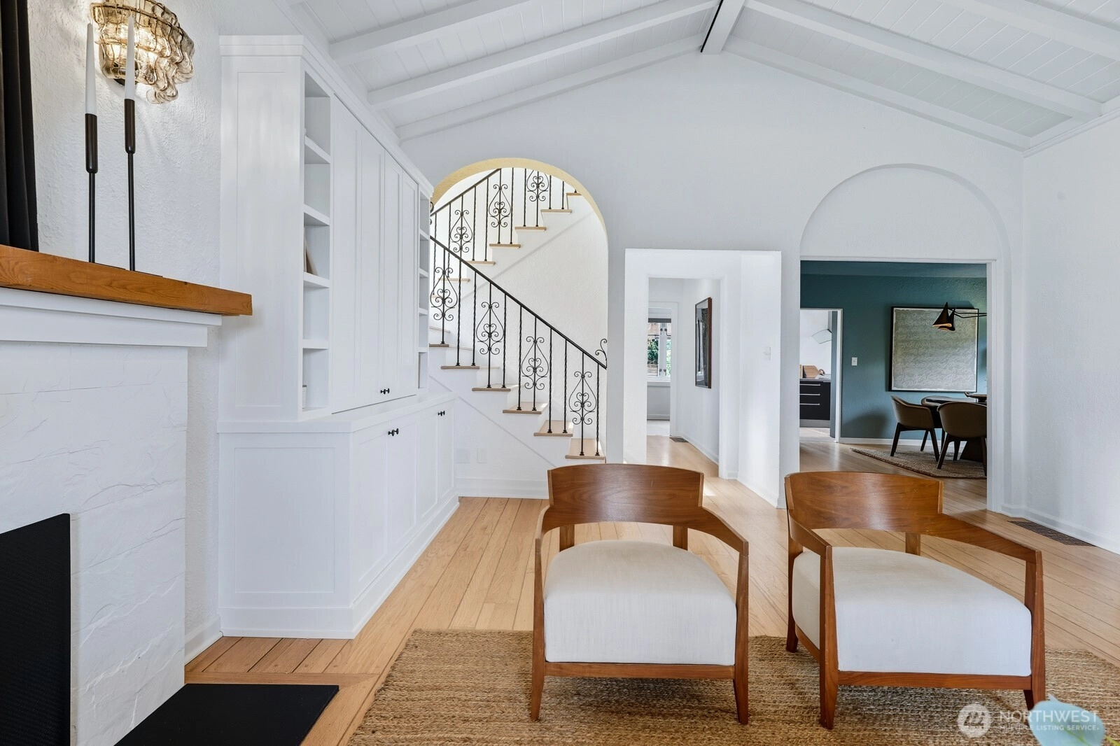 A charming stone-built home, this 1936 Laurelhurst treasure blends modern elegance with timeless craftsmanship. Inside, high beam-accented ceilings and original inlaid hardwood floors set a tone of enduring quality. Thoughtful updates honor the home’s solid construction, while graceful arches and lake views bring a sense of light and well-being to every room. Designed for connection and comfort, the circular floor plan flows effortlessly from a spacious dining room and chef-designed kitchen to a sunlit deck made for al fresco meals. Upstairs, a romantic primary suite awaits with a Juliet balcony and spa-inspired bath. A rare opportunity to own a home that feels both refined and relaxed—with the Laurelhurst Beach Club just moments away.