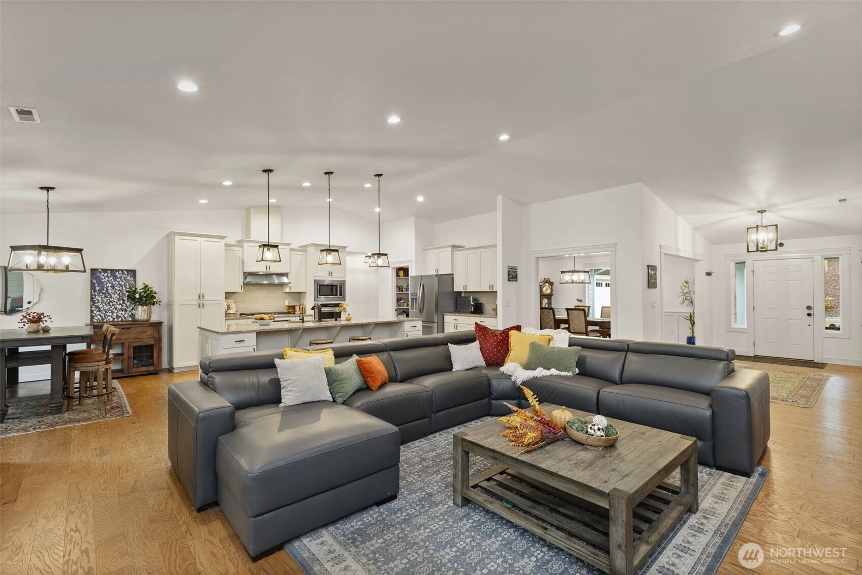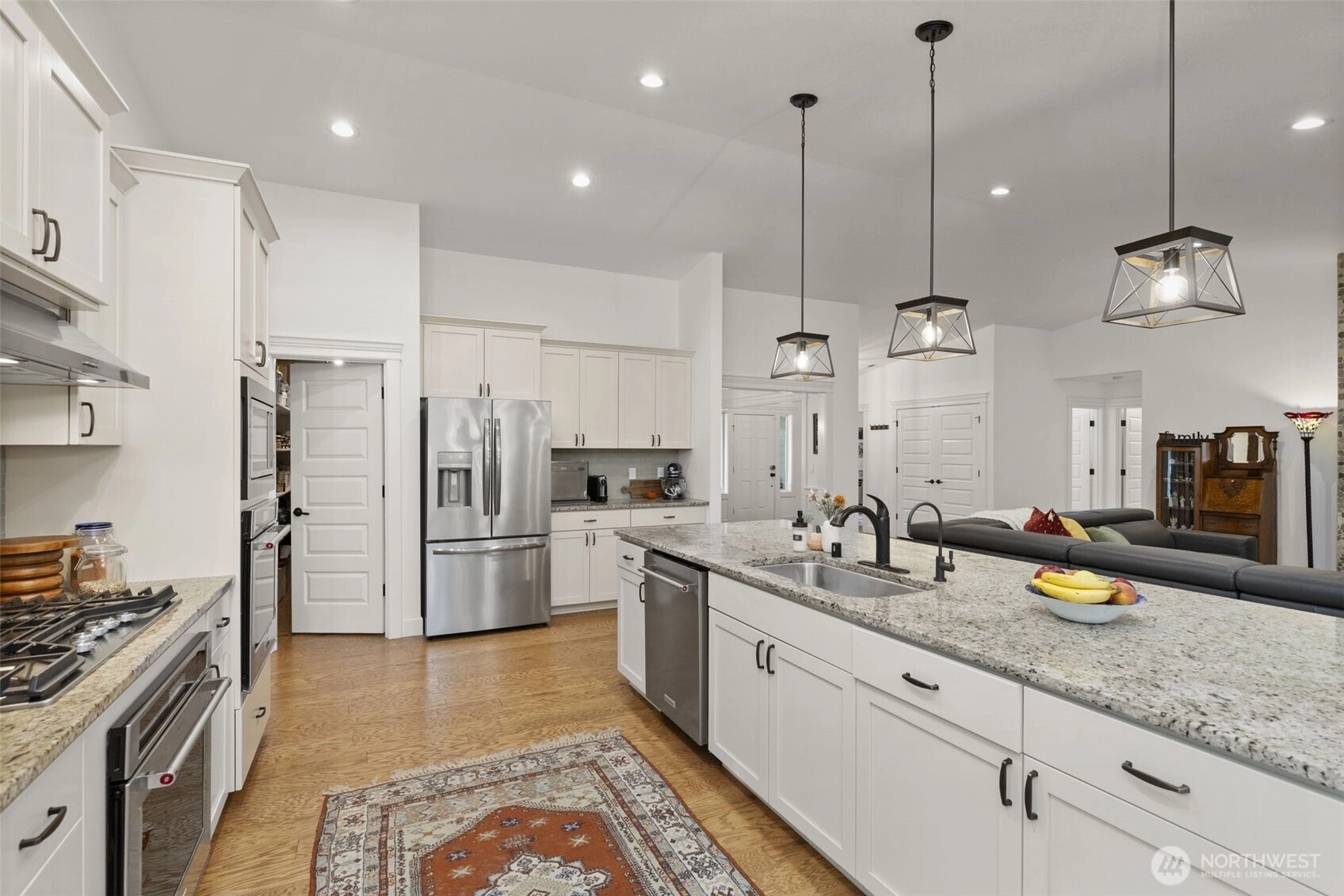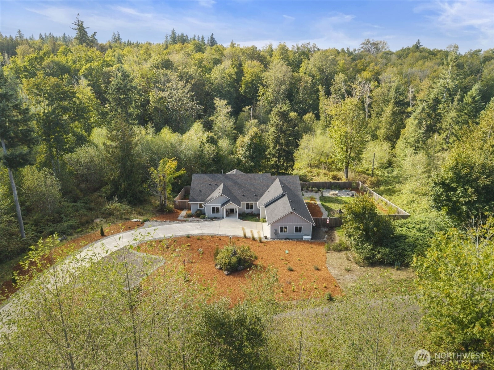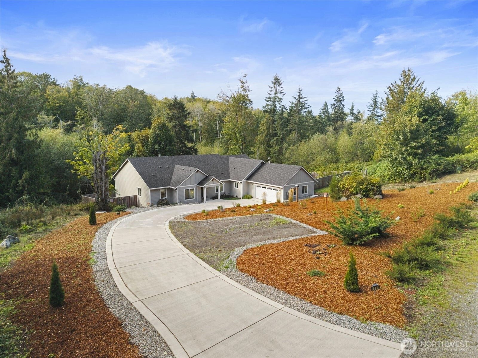 Modern living meets casual elegance in this immaculate, nearly new 3,100+ sq ft rambler tucked on 5 private acres. Open layout shines with hardwood floors, craftsman finishes, & a chef’s kitchen boasting granite island, propane cooktop, premium appliances, subway tile, & walk-in pantry. Entertain in formal & informal dining areas or relax by the fireplace & huge covered deck overlooking a private sanctuary. A spacious office, bonus room, oversized laundry, & smart appliances add comfort. Primary suite offers two large walk-ins. Garage w/ EV charging plus 1,800+ sq ft of full-height storage space complete this home. Just minutes from Kingston Ferry Terminal.Fiber Optic Internet w/ NET253. Starlink also available. Generator hardwired in too.