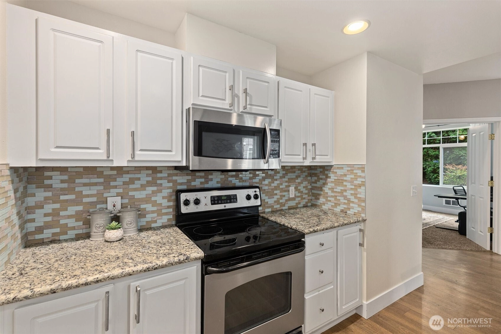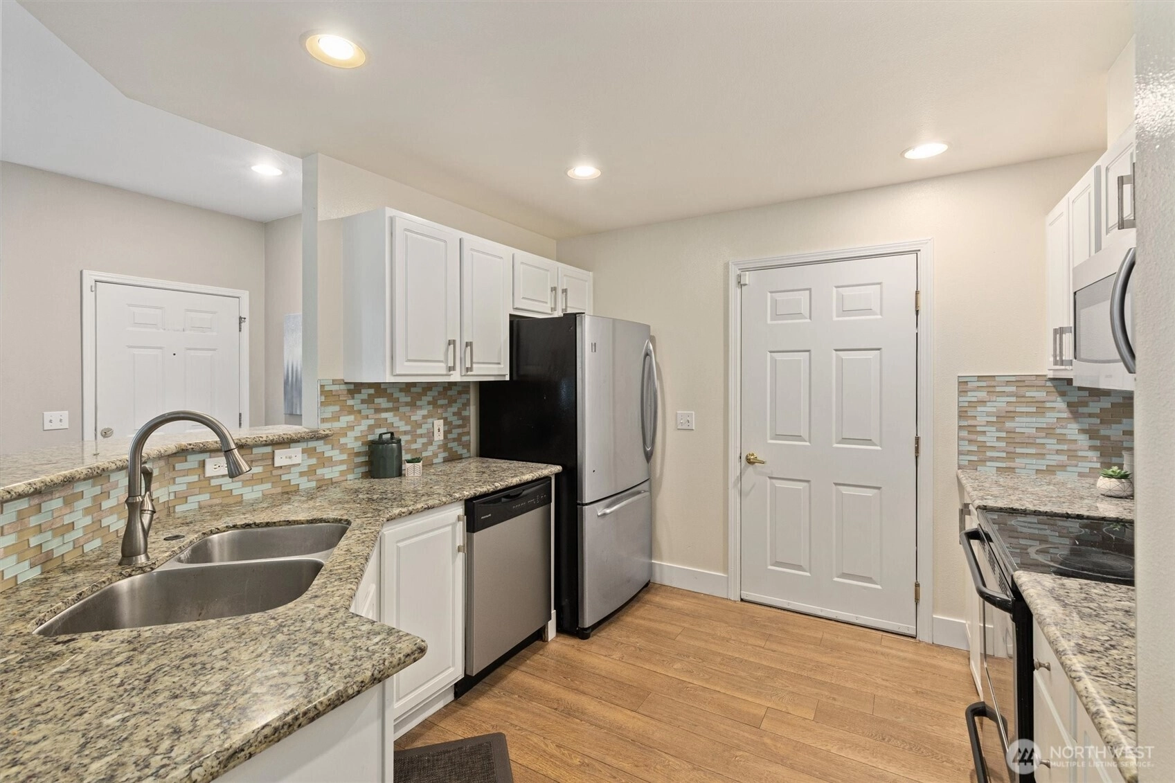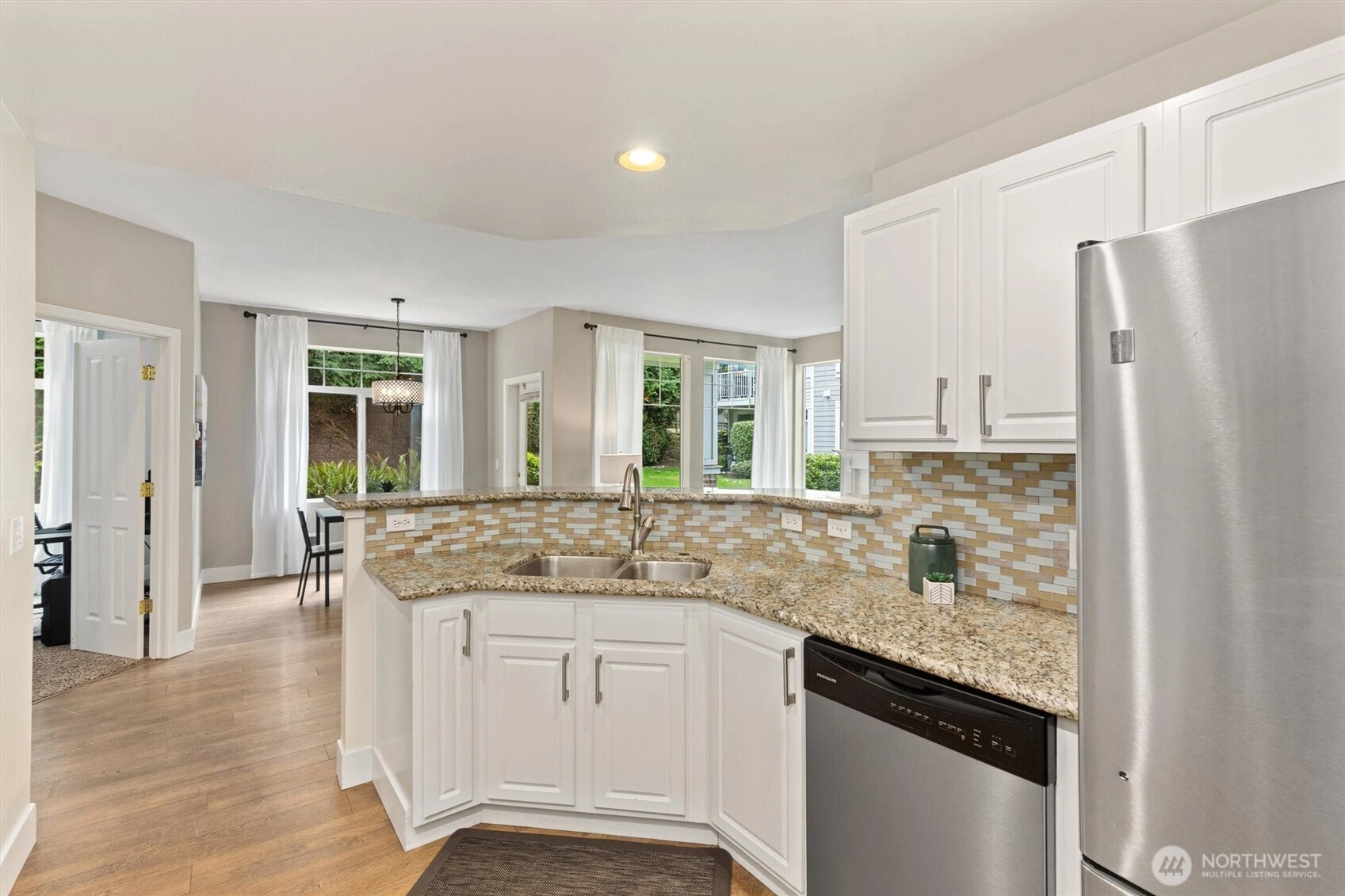 Bright and spacious ground-floor end unit in The Arbors! Enjoy true zero-step access from your attached garage—no stairs anywhere, making daily living easy and convenient. The open layout features 9-foot ceilings and oversized windows that fill the home with natural light. Nicely updated and move-in ready, with durable hard-surface flooring and carpet in both bedrooms. The kitchen shines with slab granite counters and stainless steel appliances, seamlessly connected to the living room. The generous primary suite offers a dual-sink vanity and walk-in closet, while the second bedroom works well for guests or a home office. No rental cap—great for homeowners or investors!