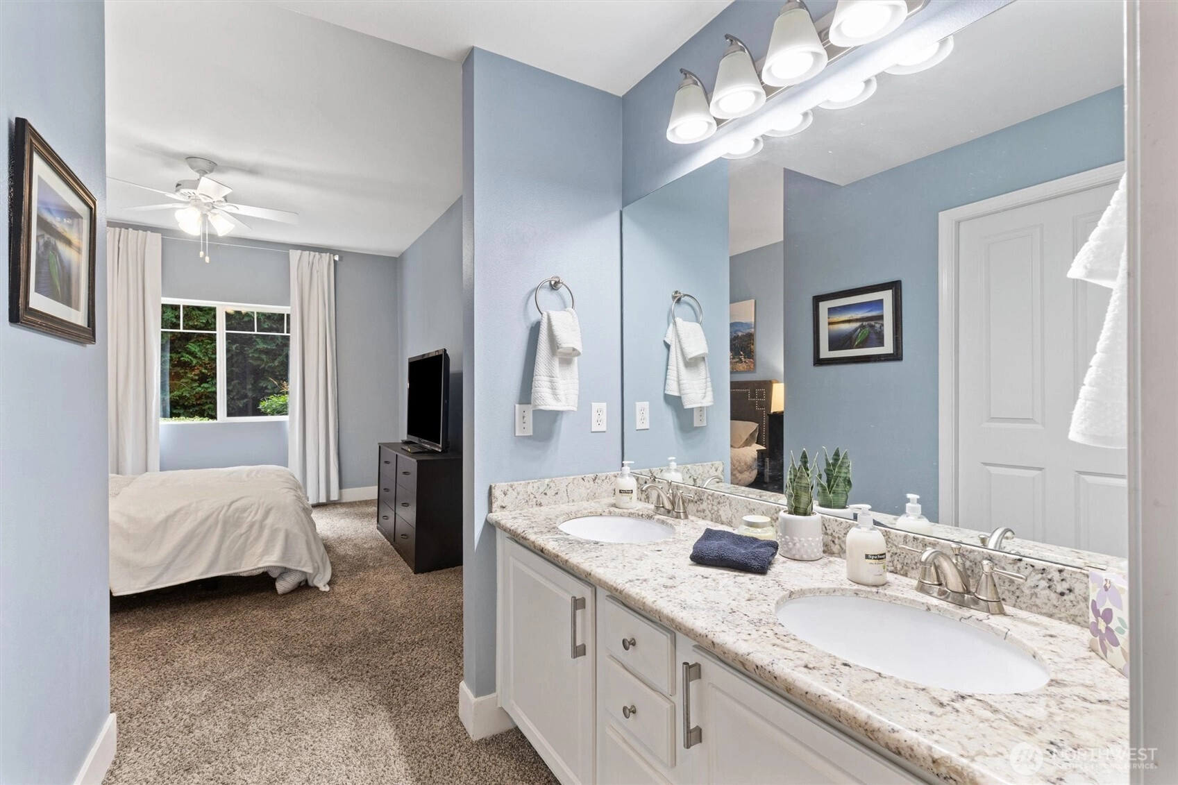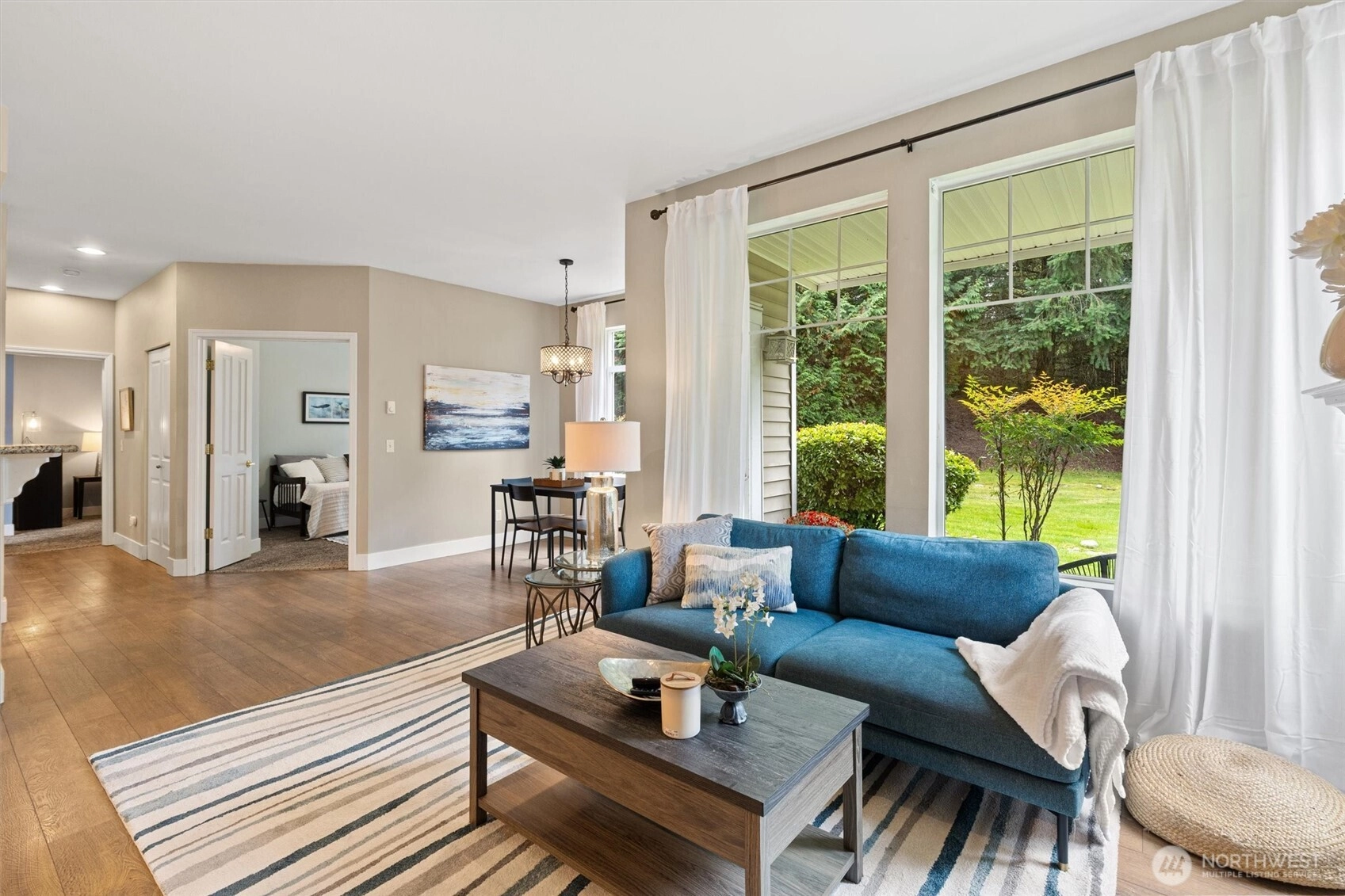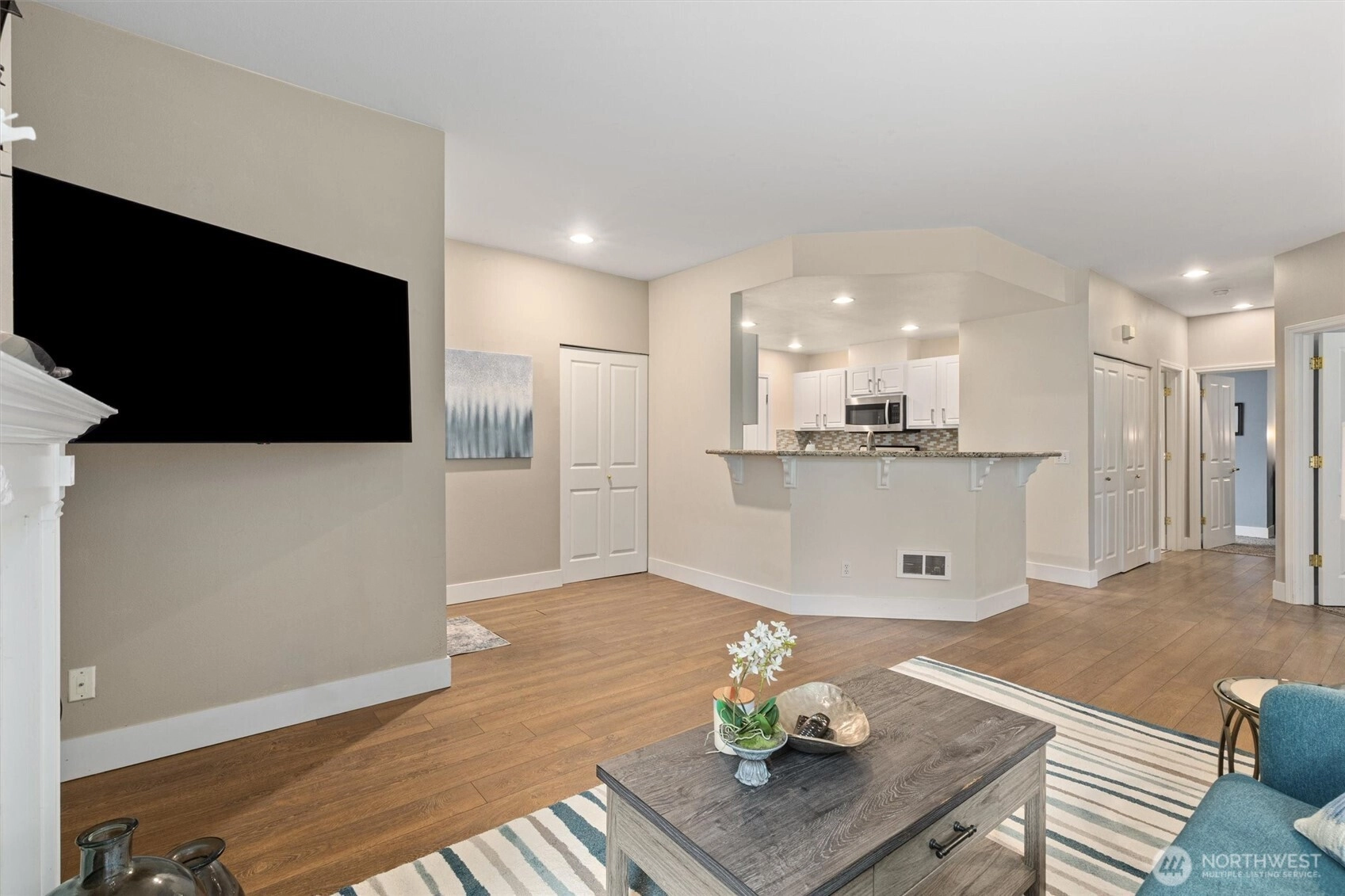 Bright and spacious ground-floor end unit in The Arbors! Enjoy true zero-step access from your attached garage—no stairs anywhere, making daily living easy and convenient. The open layout features 9-foot ceilings and oversized windows that fill the home with natural light. Nicely updated and move-in ready, with durable hard-surface flooring and carpet in both bedrooms. The kitchen shines with slab granite counters and stainless steel appliances, seamlessly connected to the living room. The generous primary suite offers a dual-sink vanity and walk-in closet, while the second bedroom works well for guests or a home office. No rental cap—great for homeowners or investors!