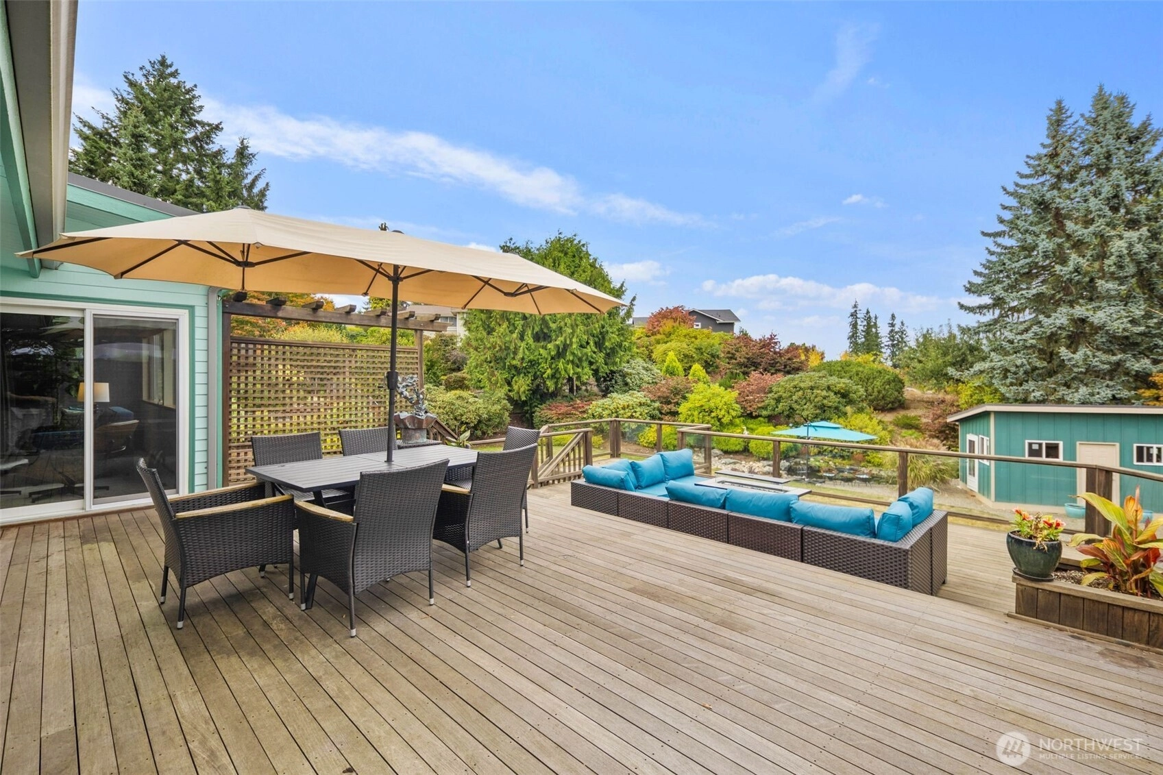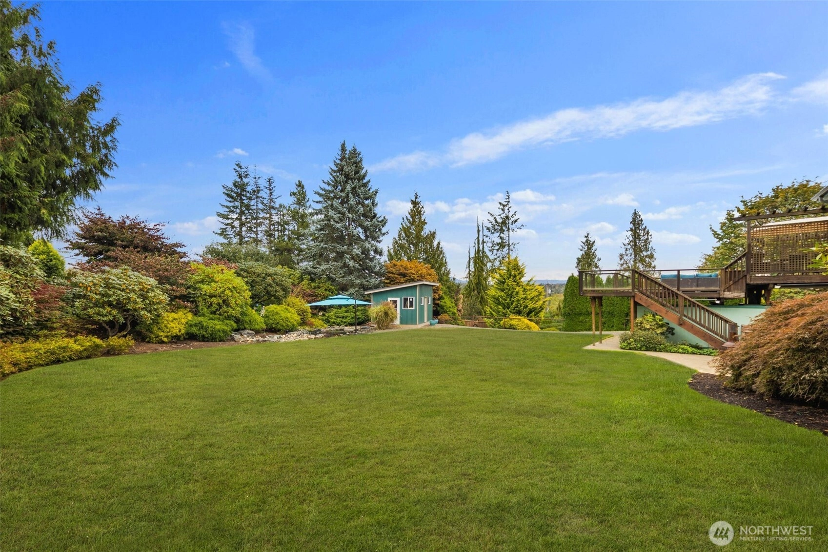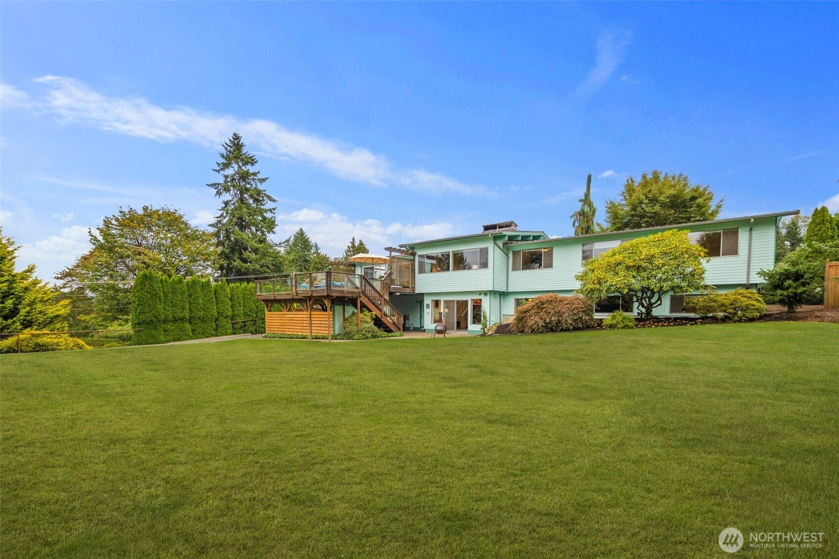!SELLER OFFERING ONE YEAR HOME WARRANTY AND 10K CREDITS! Modern comfort meets timeless views in this mid-century home in Vista La Grande. Updated in 2023 with new roof, gutters, kitchen, primary bath and carpet. Step onto the 800 sq. ft. Brazilian hardwood deck and enjoy sweeping valley views. Backyard features fruit trees and a 2,500-gallon koi pond. The lower level includes a private secondary master suite with cedar-lined closet and en-suite bath—ideal for guests, multi-gen living, or rental potential. Separate entrance adds flexibility. Fifth room flexes as a den, office, or studio (septic rated for four). Just 0.5 miles from Dutch Hill Elementary and minutes to downtown Snohomish, this home blends comfort, versatility, and connection.