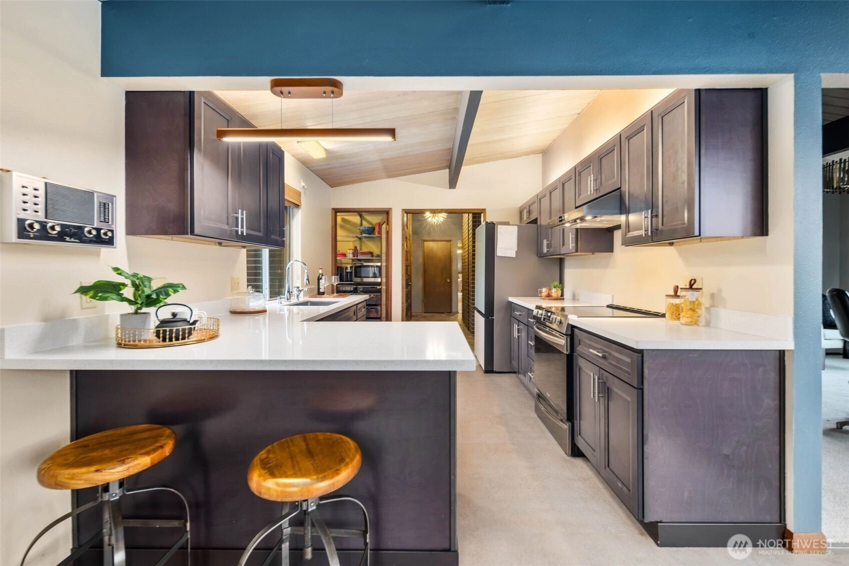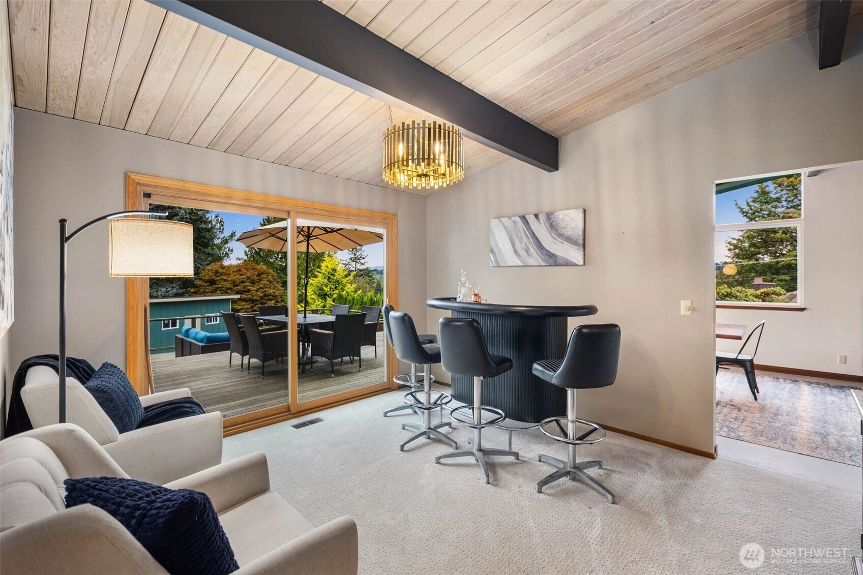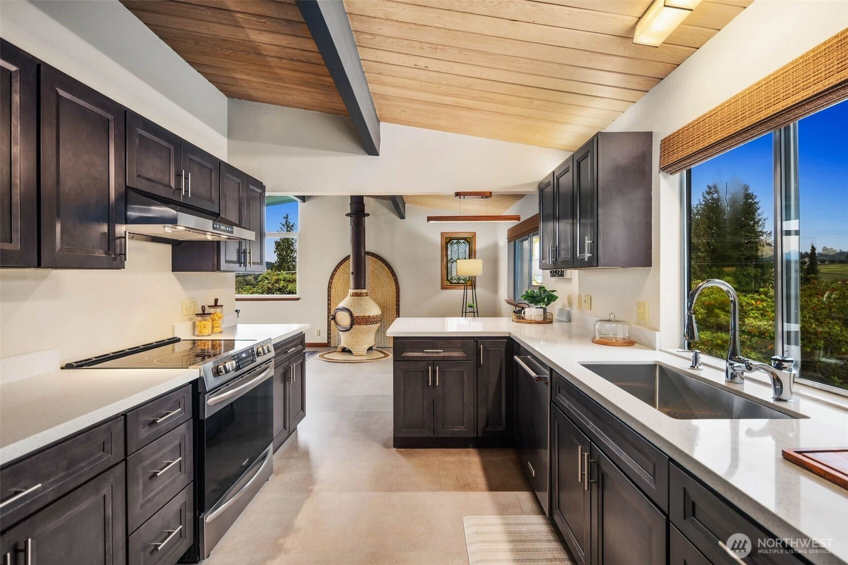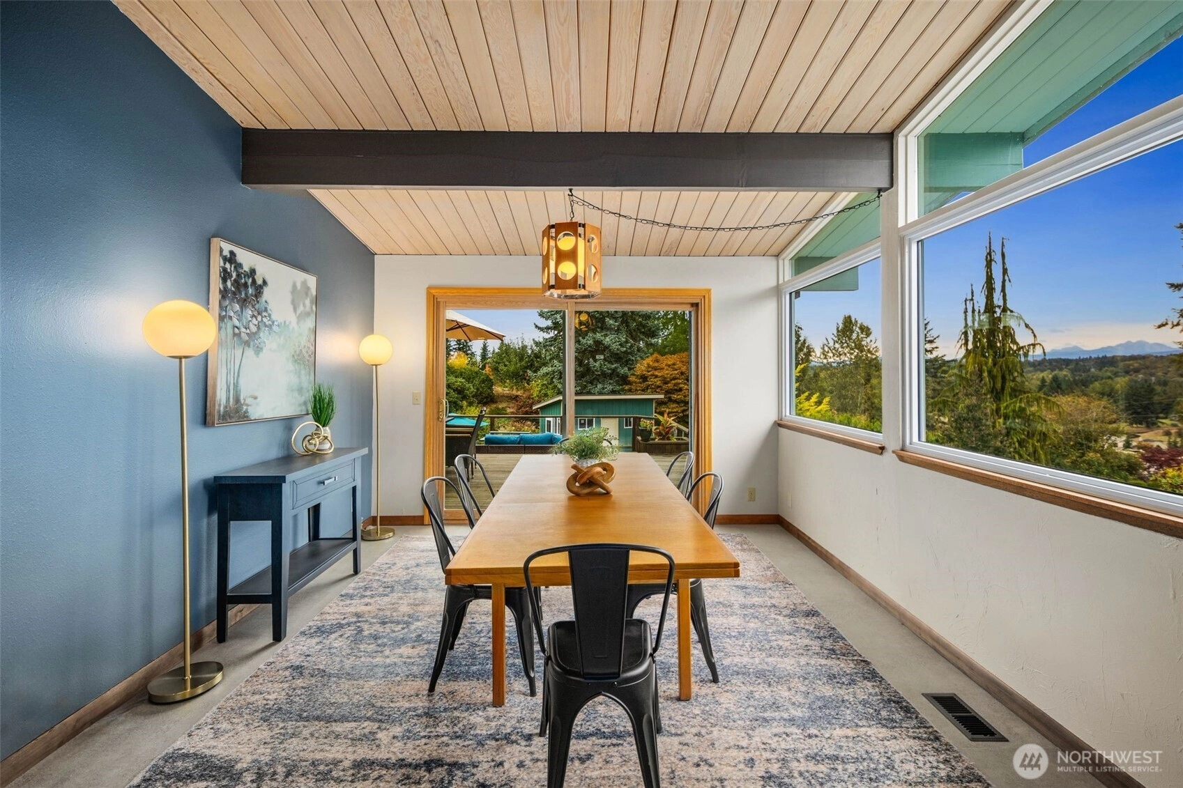 !SELLER OFFERING ONE YEAR HOME WARRANTY AND 10K CREDITS! Modern comfort meets timeless views in this mid-century home in Vista La Grande. Updated in 2023 with new roof, gutters, kitchen, primary bath and carpet. Step onto the 800 sq. ft. Brazilian hardwood deck and enjoy sweeping valley views. Backyard features fruit trees and a 2,500-gallon koi pond. The lower level includes a private secondary master suite with cedar-lined closet and en-suite bath—ideal for guests, multi-gen living, or rental potential. Separate entrance adds flexibility. Fifth room flexes as a den, office, or studio (septic rated for four). Just 0.5 miles from Dutch Hill Elementary and minutes to downtown Snohomish, this home blends comfort, versatility, and connection.