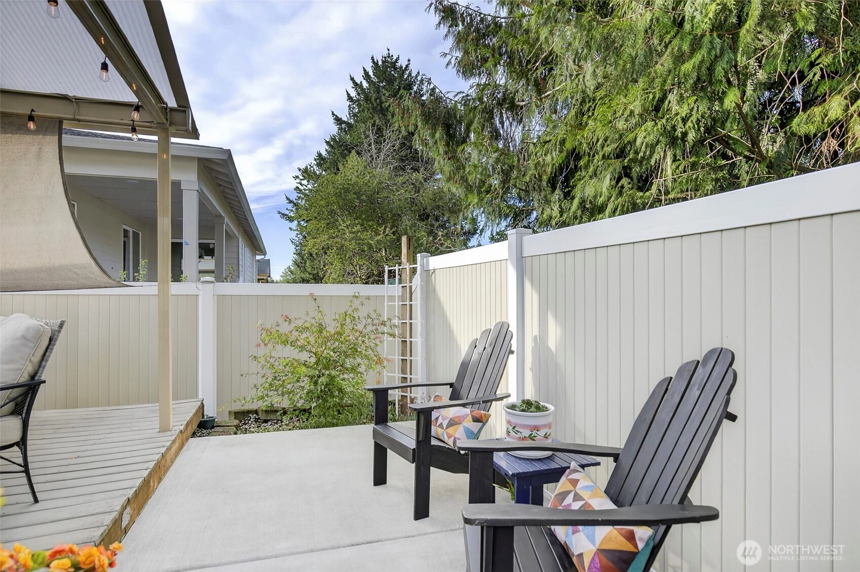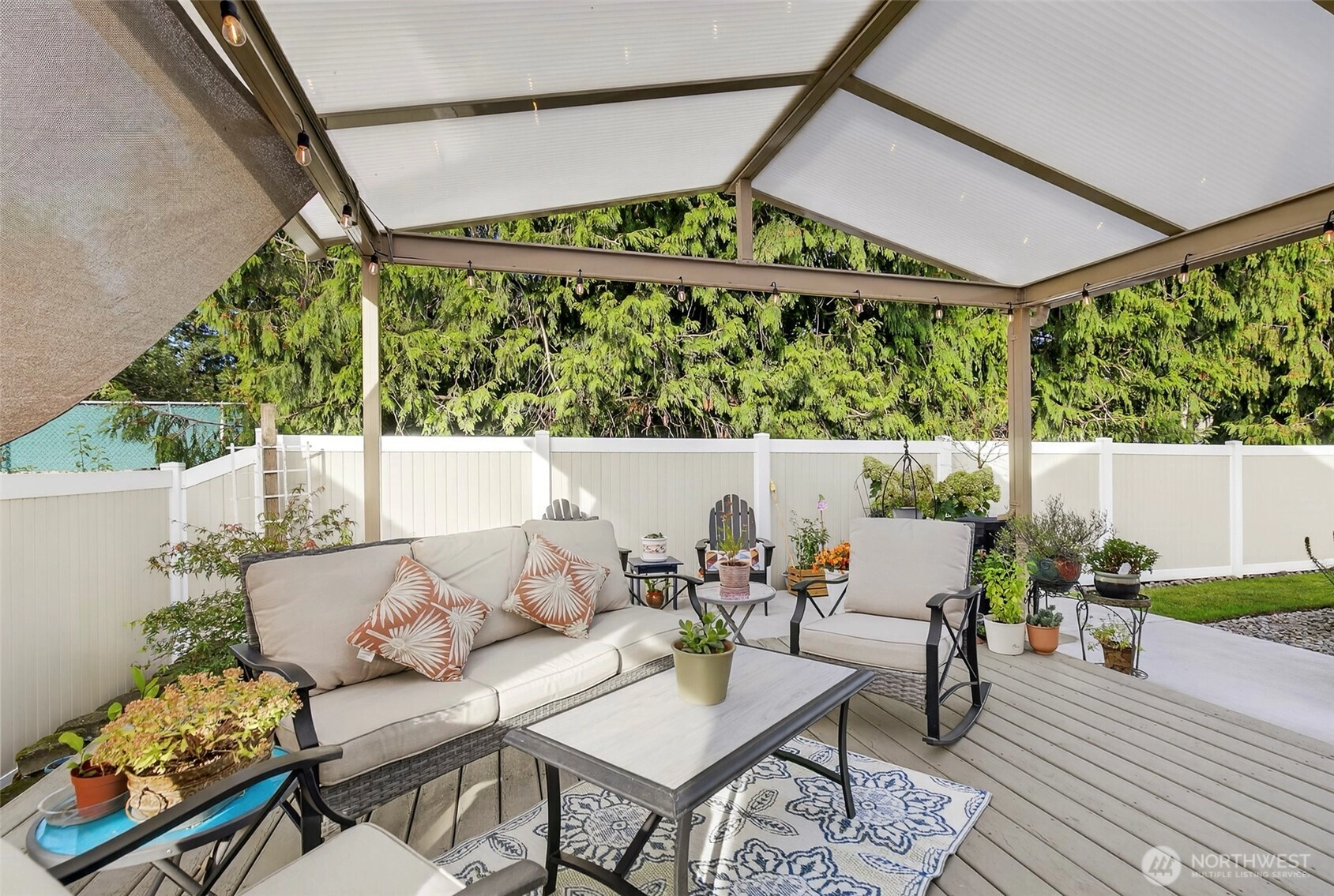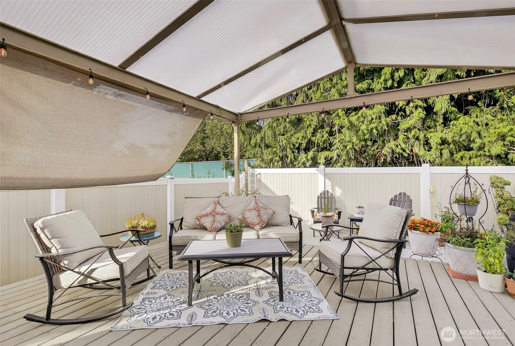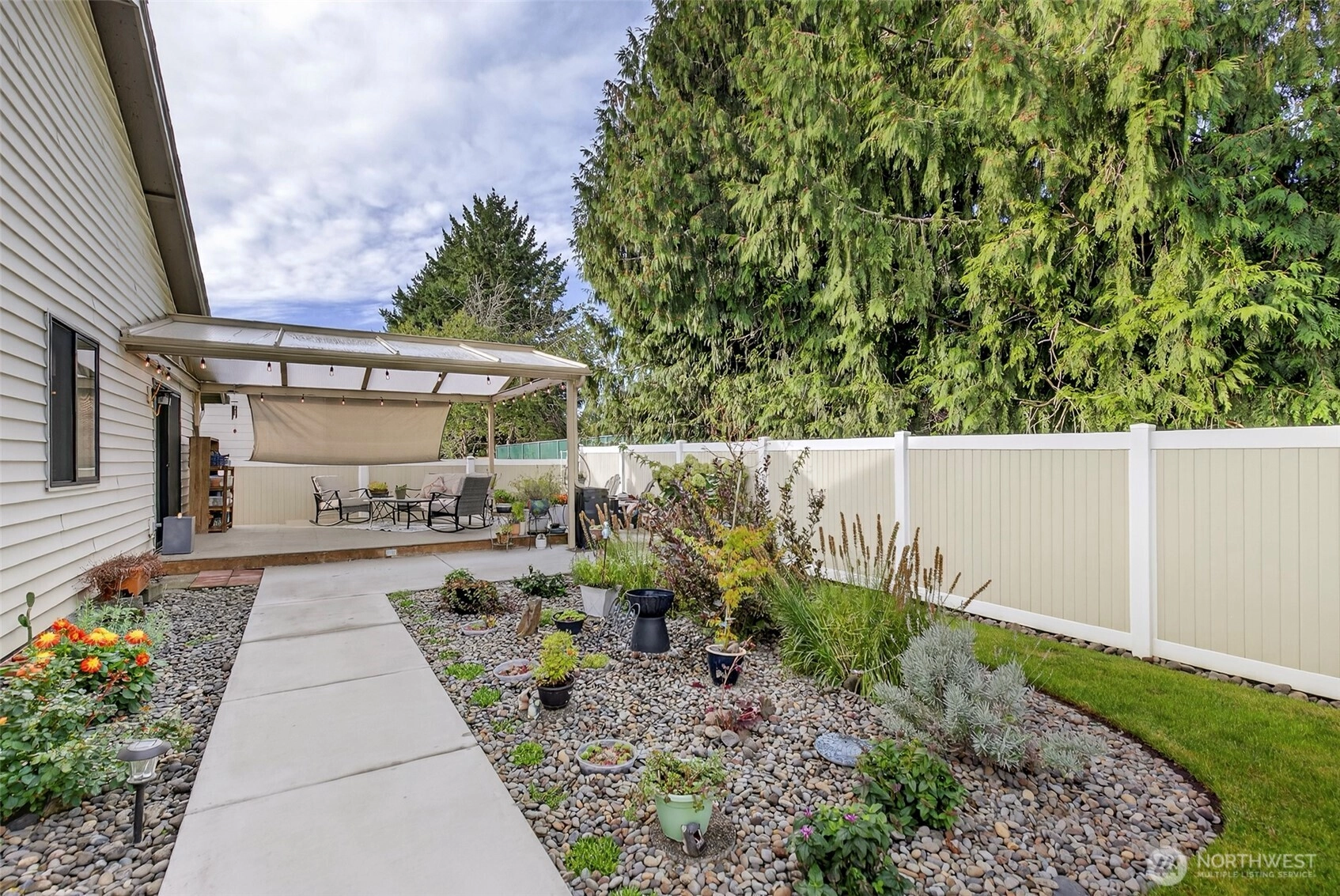 Move-in ready home with thoughtful updates inside and out, including Newer Milgard double pane windows, newer paint! Spacious living room with wall-to-wall newer carpet, and custom blinds. Kitchen features stainless steel appliances, quartz counters, vaulted ceiling, recessed lights, and dining area with slider to backyard. Primary suite offers walk-in closet and remodeled bath with glass shower. Two additional bedrooms plus updated hall bath. Smart thermostat, gas furnace with A/C, and newer gas water heater. Backyard is perfect for entertaining with covered composite deck, acrylite cover, extensive concrete work, and Tuff shed. Roof approx. 10 yrs. Garage includes shelving, opener with keypad.