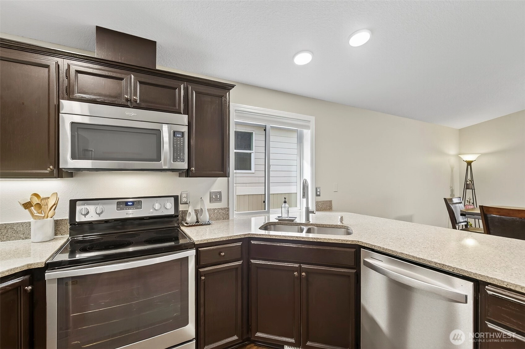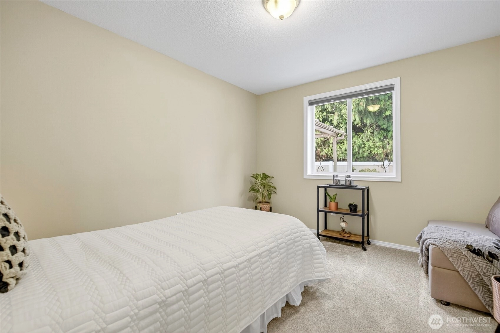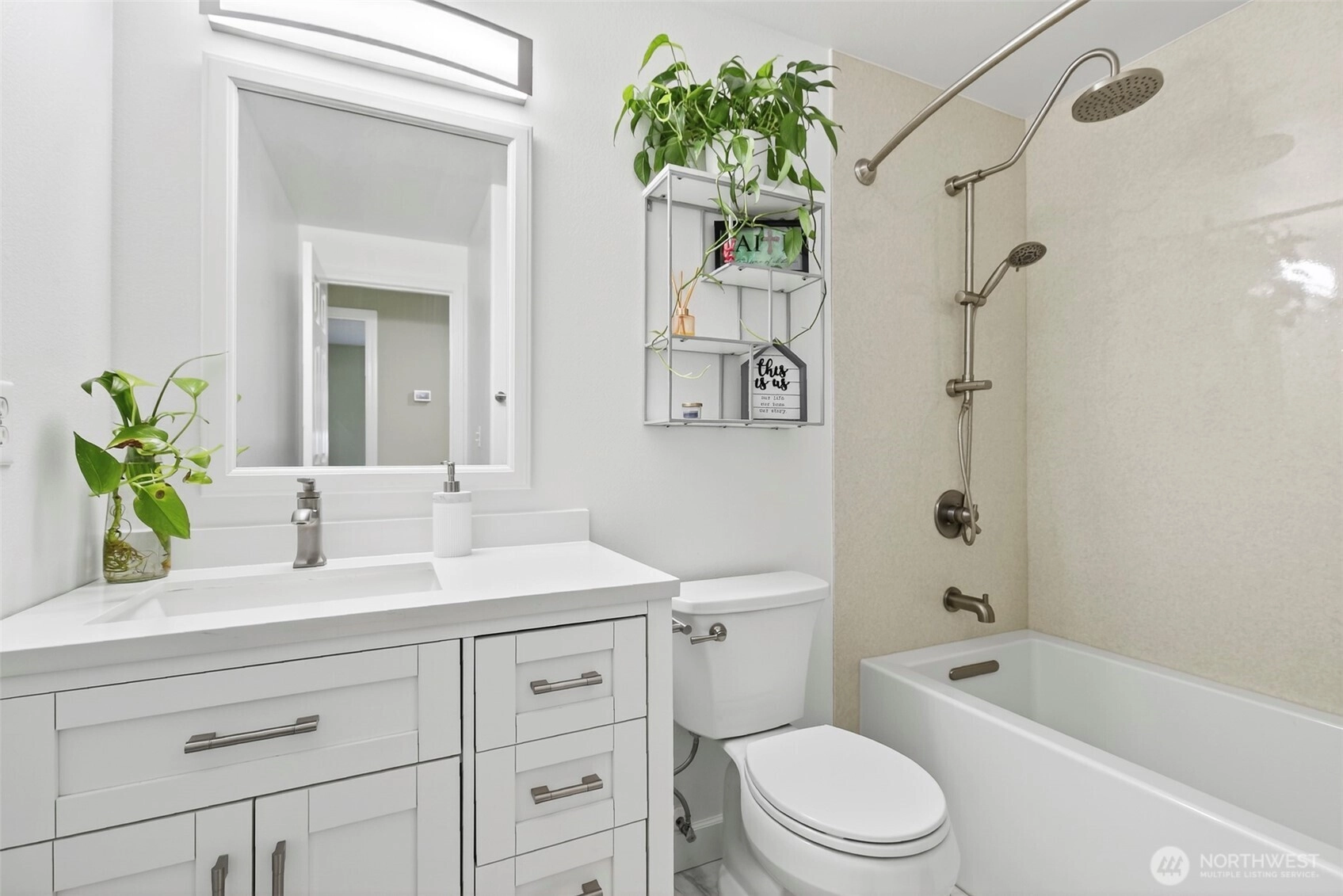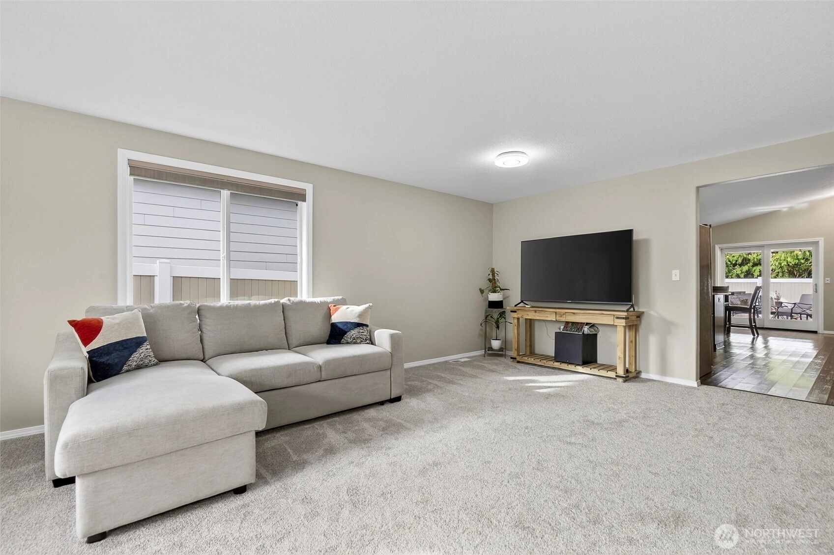 Move-in ready home with thoughtful updates inside and out, including Newer Milgard double pane windows, newer paint! Spacious living room with wall-to-wall newer carpet, and custom blinds. Kitchen features stainless steel appliances, quartz counters, vaulted ceiling, recessed lights, and dining area with slider to backyard. Primary suite offers walk-in closet and remodeled bath with glass shower. Two additional bedrooms plus updated hall bath. Smart thermostat, gas furnace with A/C, and newer gas water heater. Backyard is perfect for entertaining with covered composite deck, acrylite cover, extensive concrete work, and Tuff shed. Roof approx. 10 yrs. Garage includes shelving, opener with keypad.