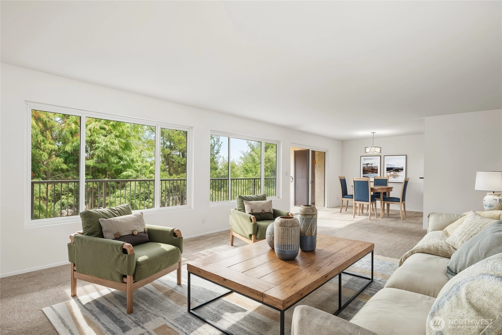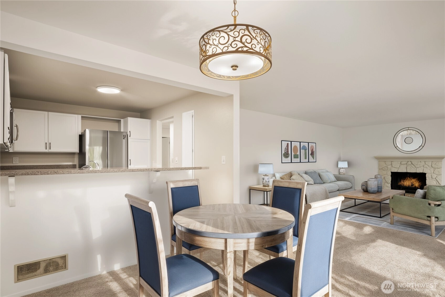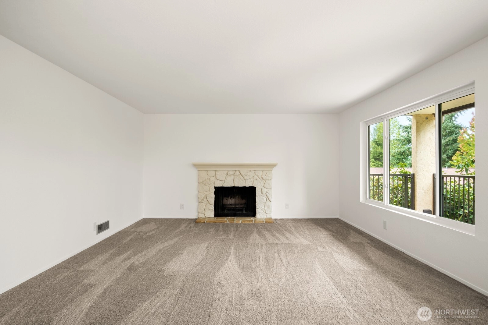This light-filled condo offers it all! The sun-drenched living space boasts a stone, wood-burning fireplace, open floor plan, & sprawling windows, perfect for entertaining. Right off the dining area you’ll find an impressively large, secluded balcony equipped w/ additional storage closet & wooded view. All three bedrooms as well as the rest of the unit are highlighted by fresh paint & LVP floors. The primary suite is your own personal oasis w/ ensuite bathroom, walk-in closet & a second, private balcony. Just steps away from the unit is access to the outdoor pool, common garden space & a renovated club house for large gatherings. This quiet complex is located in a quiet, dead end street conveniently close to I5 and common amenities!