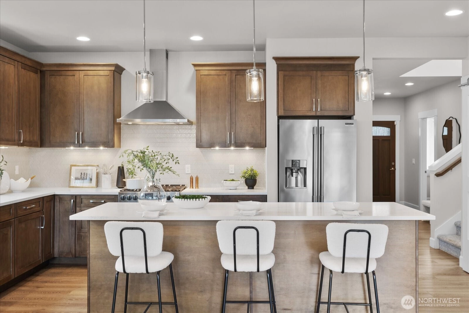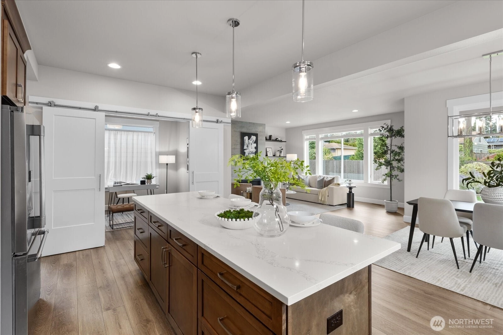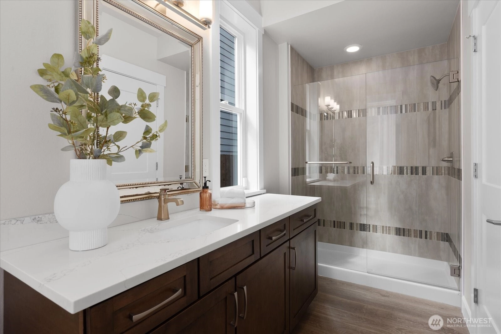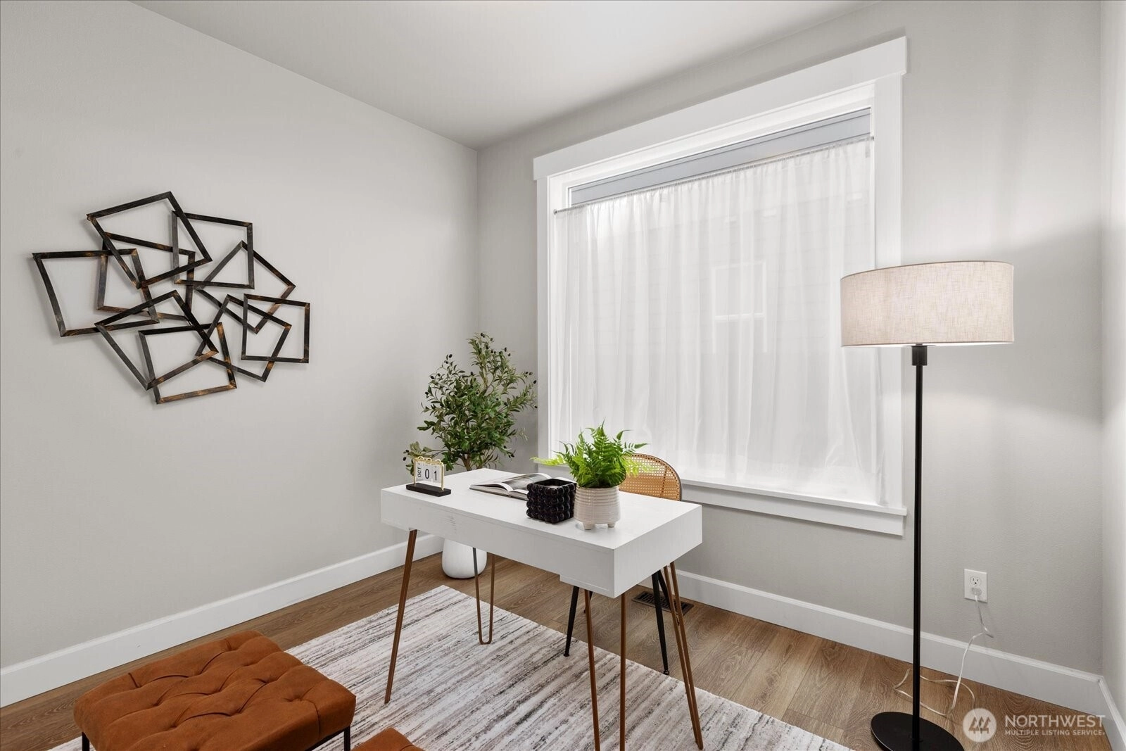 Modern luxury meets thoughtful design in this beautifully detailed home with an open great room layout. Upstairs you’ll find 4 bedrooms plus a versatile bonus room, while the main floor offers a private office/guest room and a spacious ¾ bath. The chef’s kitchen features quartz counters, an oversized island, large pantry, and seamless flow to the dining and living areas. Retreat to the king-sized primary suite with spa-inspired bath, heated floors, and a generous walk-in closet. Additional highlights include tiled baths with quartz finishes, luxury plank vinyl flooring, a covered patio, and a fully fenced, landscaped yard. Conveniently located minutes from the light rail, adjacent to Forest Crest Tennis Club and nearby parks.