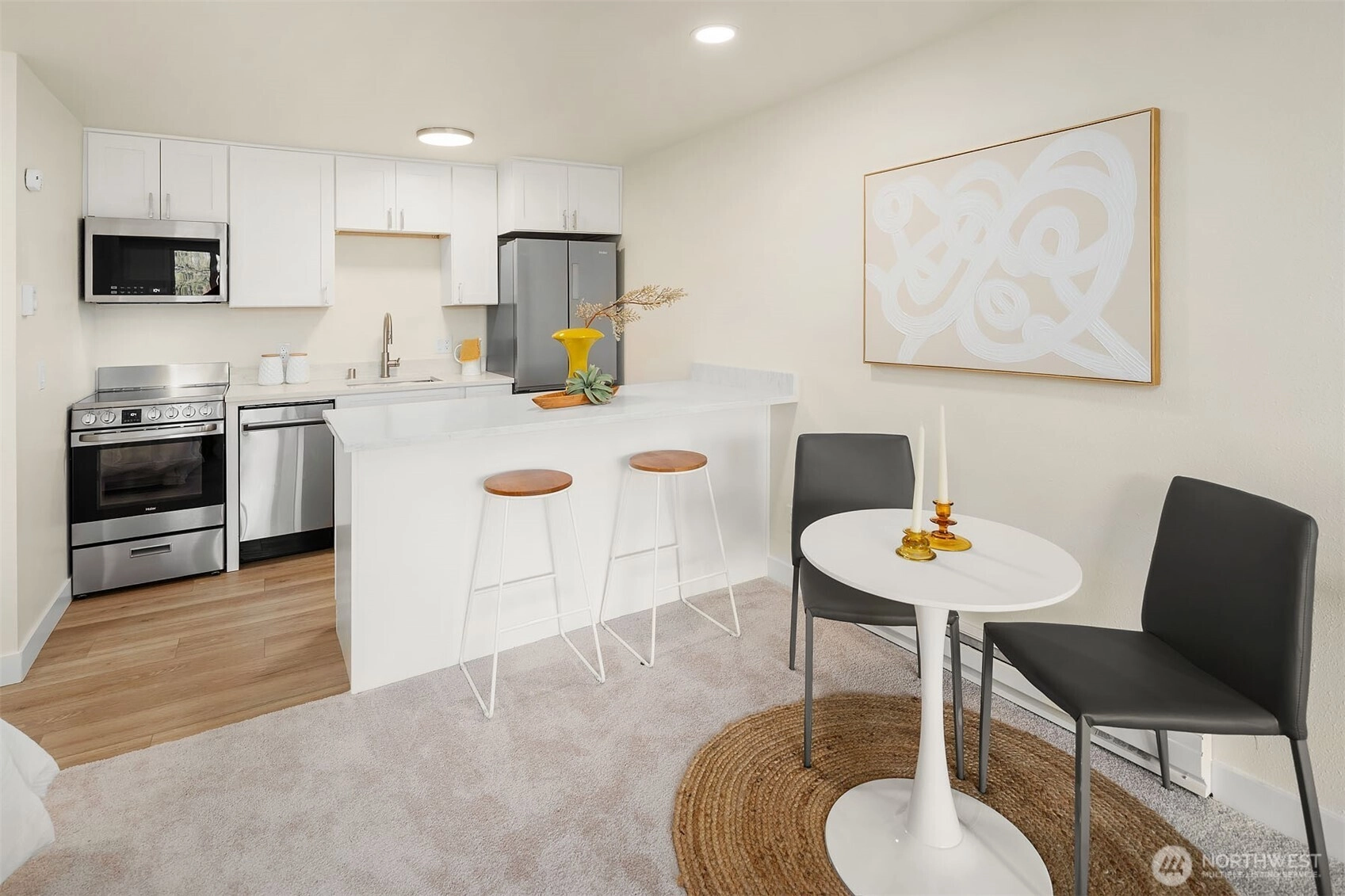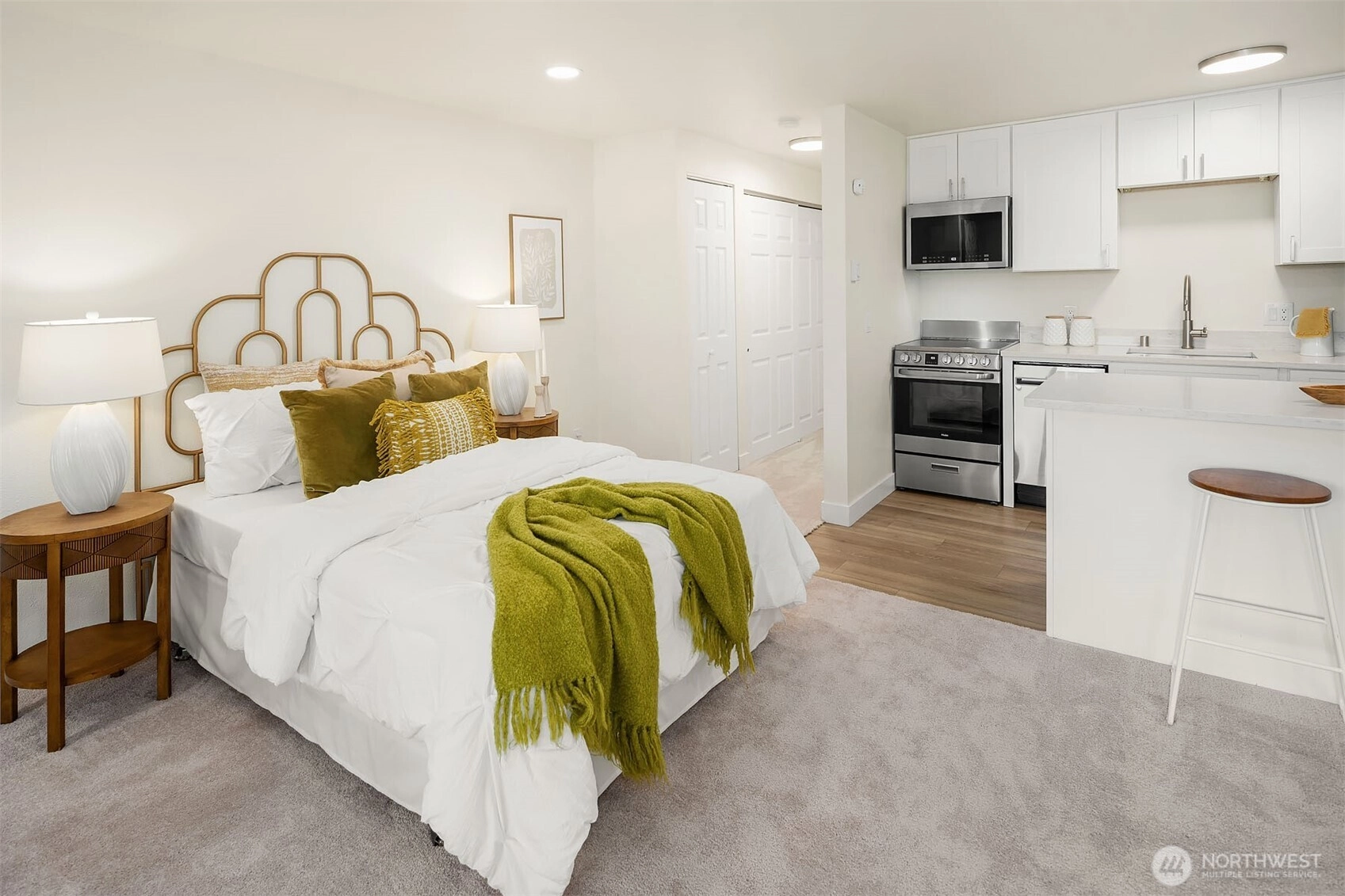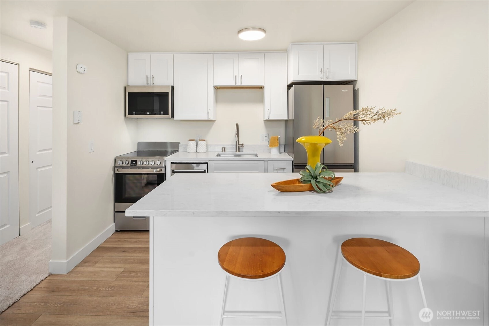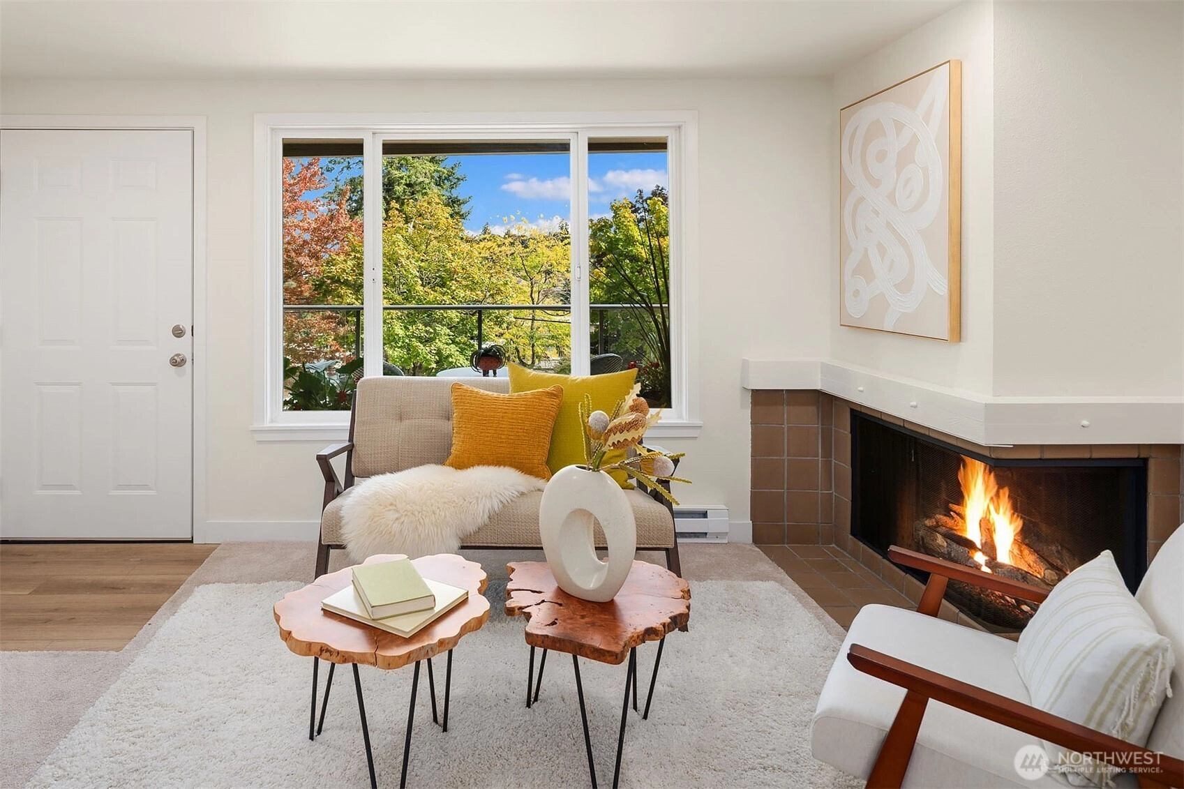 Totally new condo from top to bottom! Live in the Heart of Mercer Island, just steps away from downtown. Two blocks to Metropolitan Market. Shortcut trail to Mercerdale Park, Farmers Market & Macrina Bakery. Fully equipped kitchen has good size stainless steel appliances, new cabinets, bar with quartz countertops & plenty of cooking prep space. The original popcorn ceilings are gone & recessed ceiling lights have been installed for a light & bright living space. Closet lined hallway. Real wood burning fireplace. Territorial view deck. Exterior storage closet. Complex has a gym & clubhouse and neat & clean on-site laundry. Assigned parking next to unit. Quick highway access. Enjoy efficient, comfortable living. Nothing else needed!
