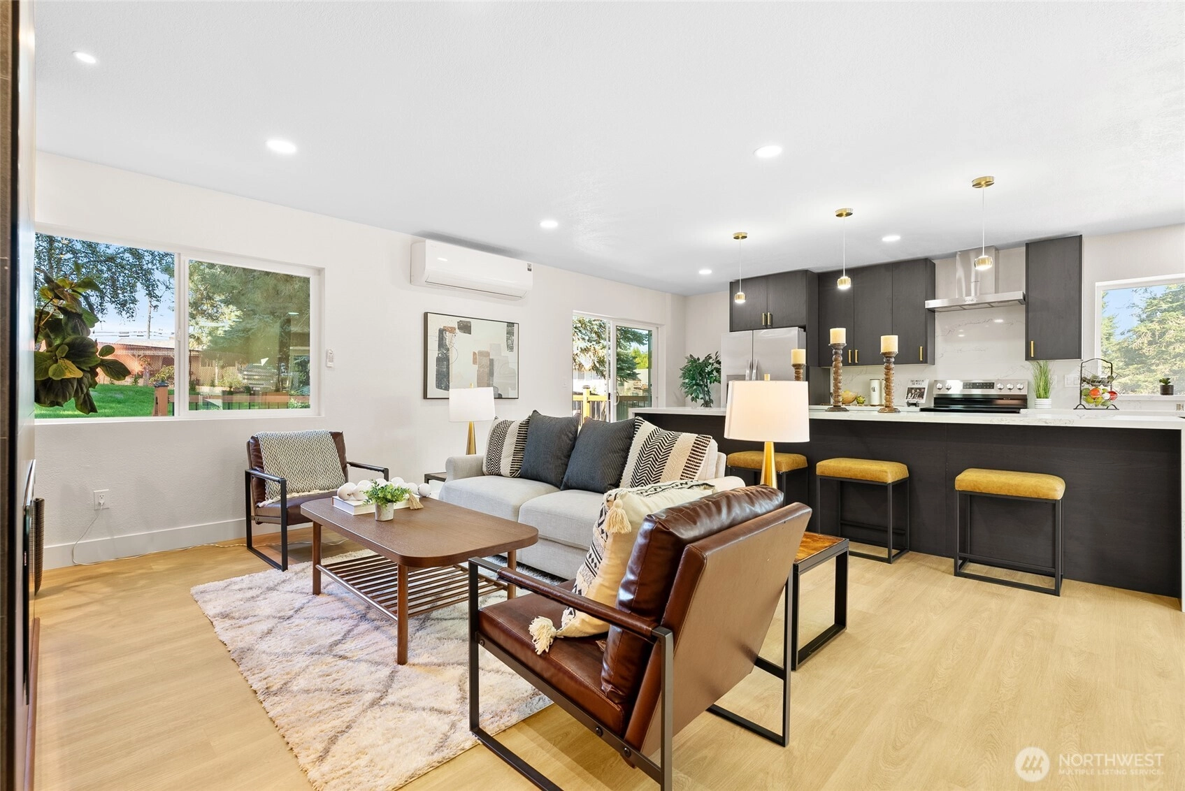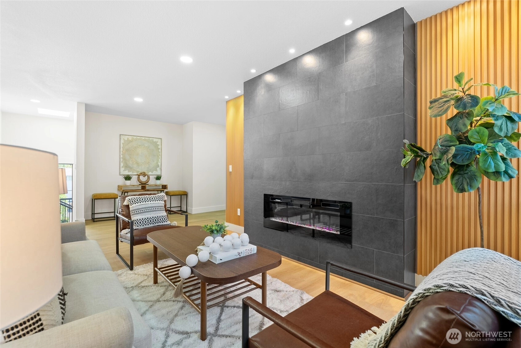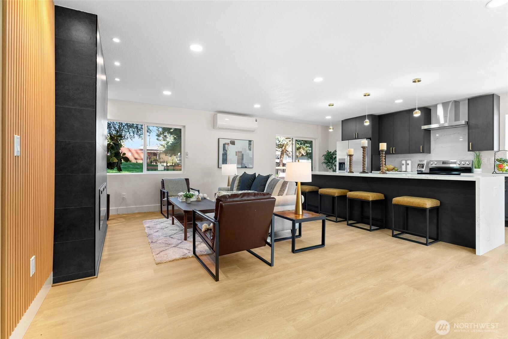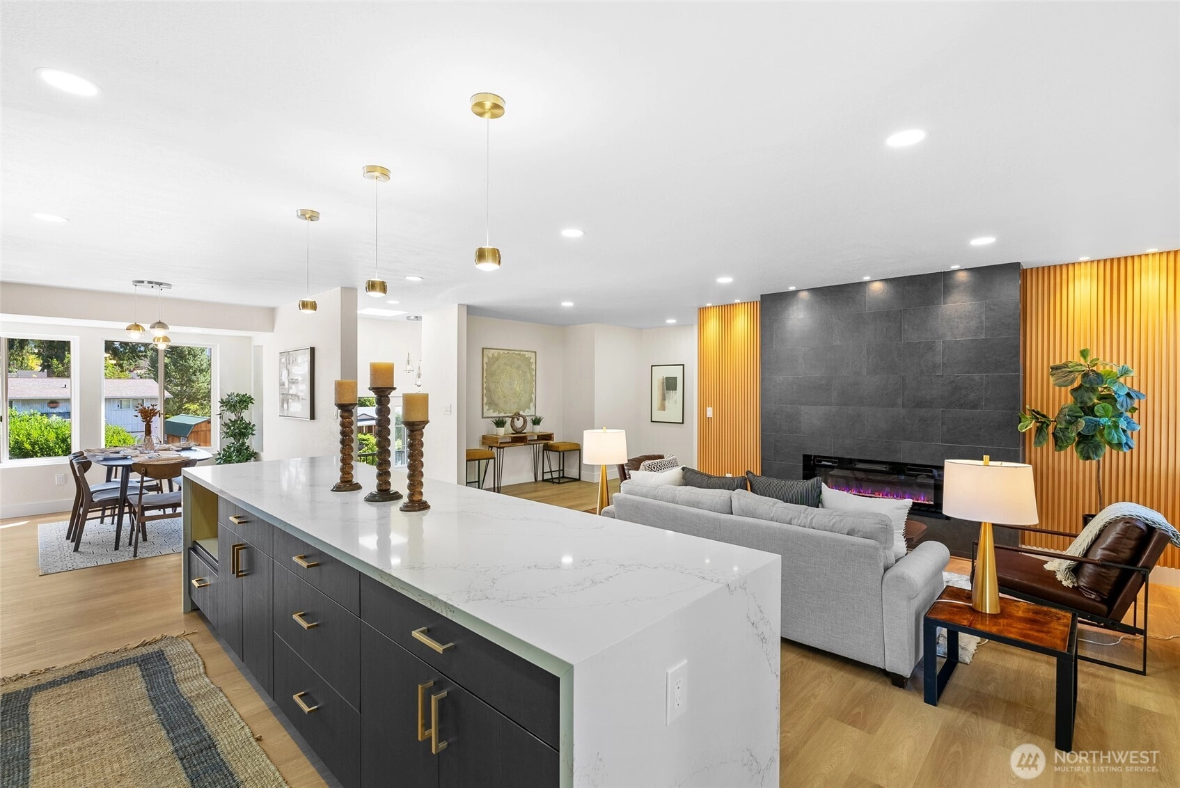 FULLY REMODELED Bothell retreat in the award-winning Northshore School District. This 3-bedroom, 2.75-bath split-level on a third of an acre offers modern comfort and flexible living. The main level features a remodeled kitchen with quartz counters, stainless appliances, sleek cabinetry, and an open living area with custom entertainment center, office/den and electric fireplace. The bay-windowed primary suite includes a walk-in tile shower and stylish finishes. The lower level provides a second living area with fireplace, bedroom, and laundry. Updates include remodeled baths, luxury vinyl flooring, fresh paint, new trim, upgraded heating, new A/C, and brand-new septic with warranty. Pre-inspected, move-in ready, includes a home warranty.