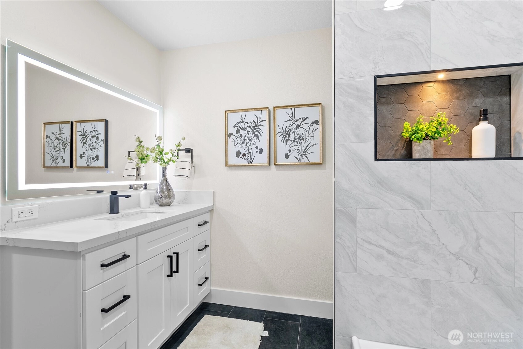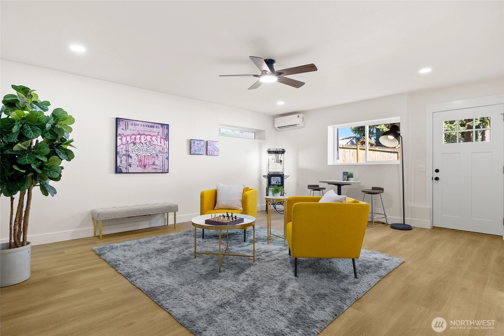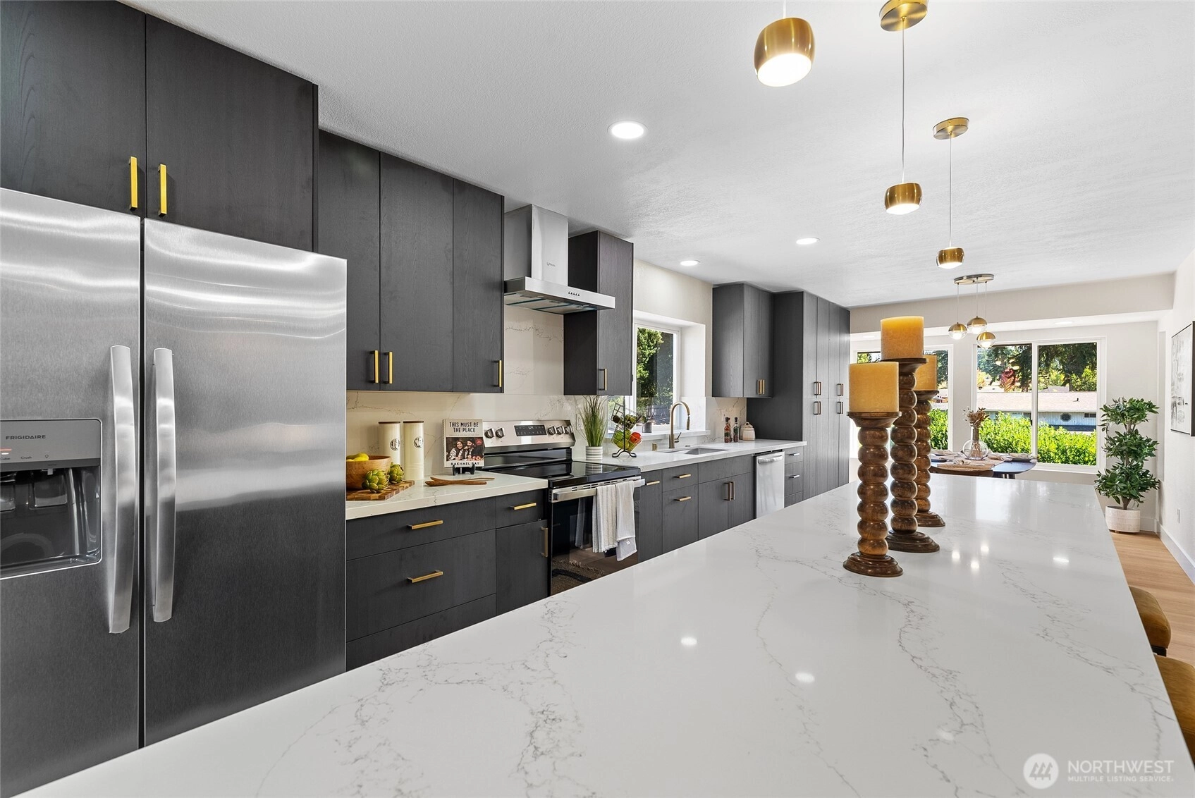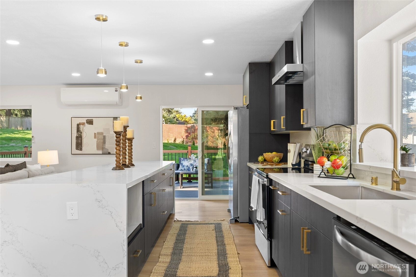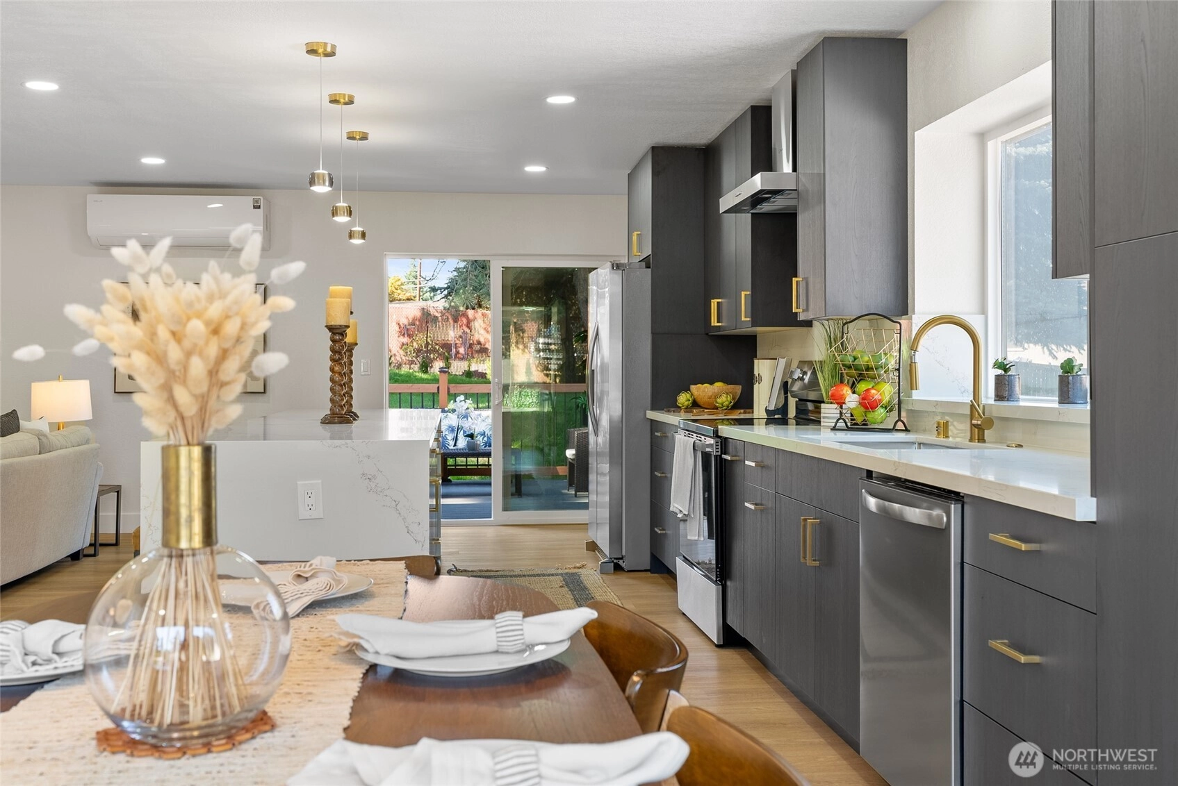 FULLY REMODELED Bothell retreat in the award-winning Northshore School District. This 3-bedroom, 2.75-bath split-level on a third of an acre offers modern comfort and flexible living. The main level features a remodeled kitchen with quartz counters, stainless appliances, sleek cabinetry, and an open living area with custom entertainment center, office/den and electric fireplace. The bay-windowed primary suite includes a walk-in tile shower and stylish finishes. The lower level provides a second living area with fireplace, bedroom, and laundry. Updates include remodeled baths, luxury vinyl flooring, fresh paint, new trim, upgraded heating, new A/C, and brand-new septic with warranty. Pre-inspected, move-in ready, includes a home warranty.