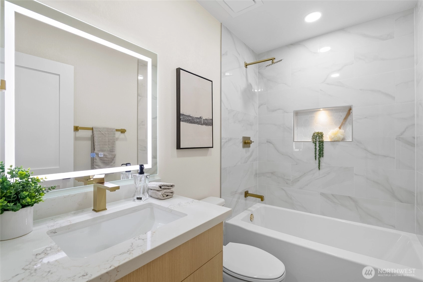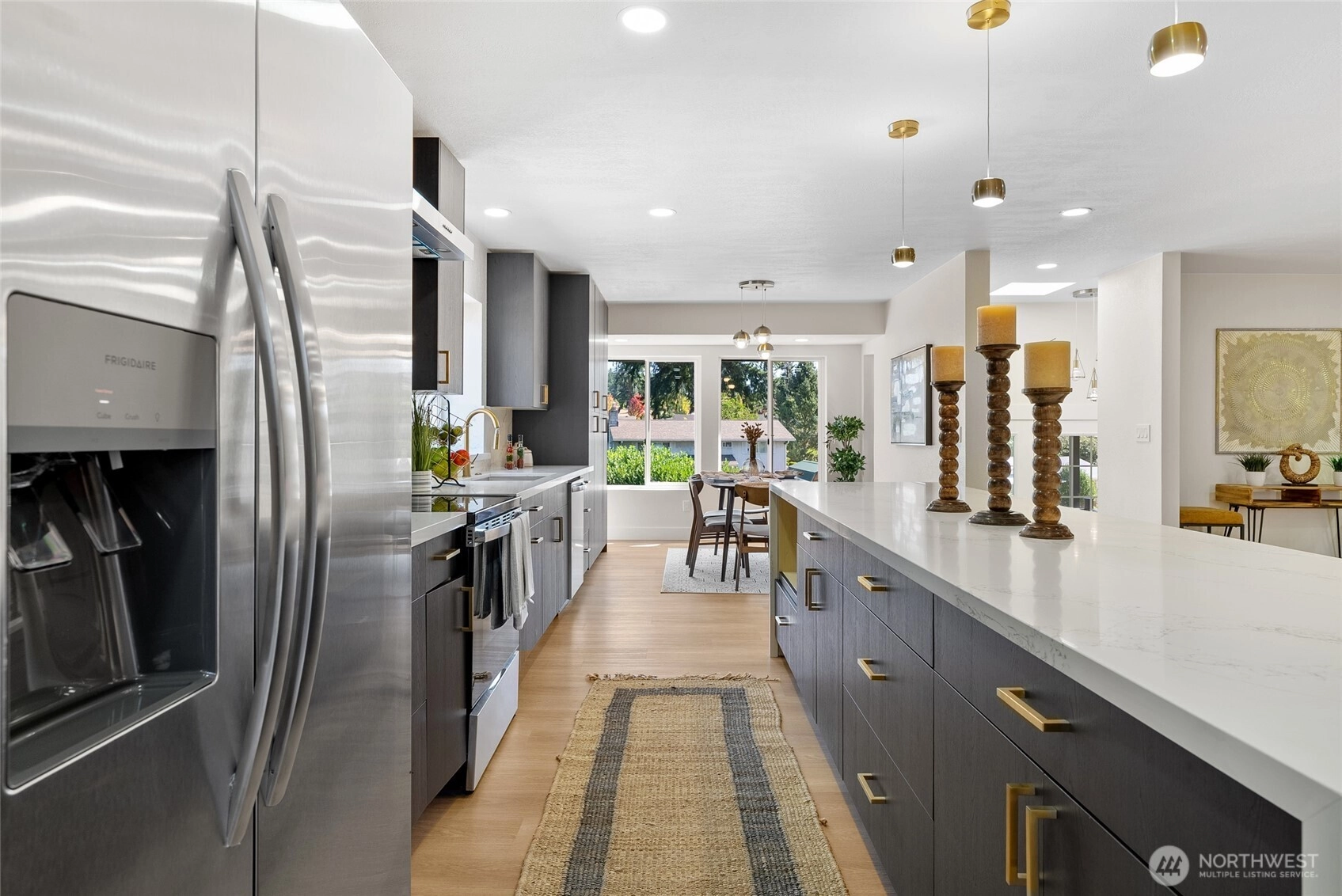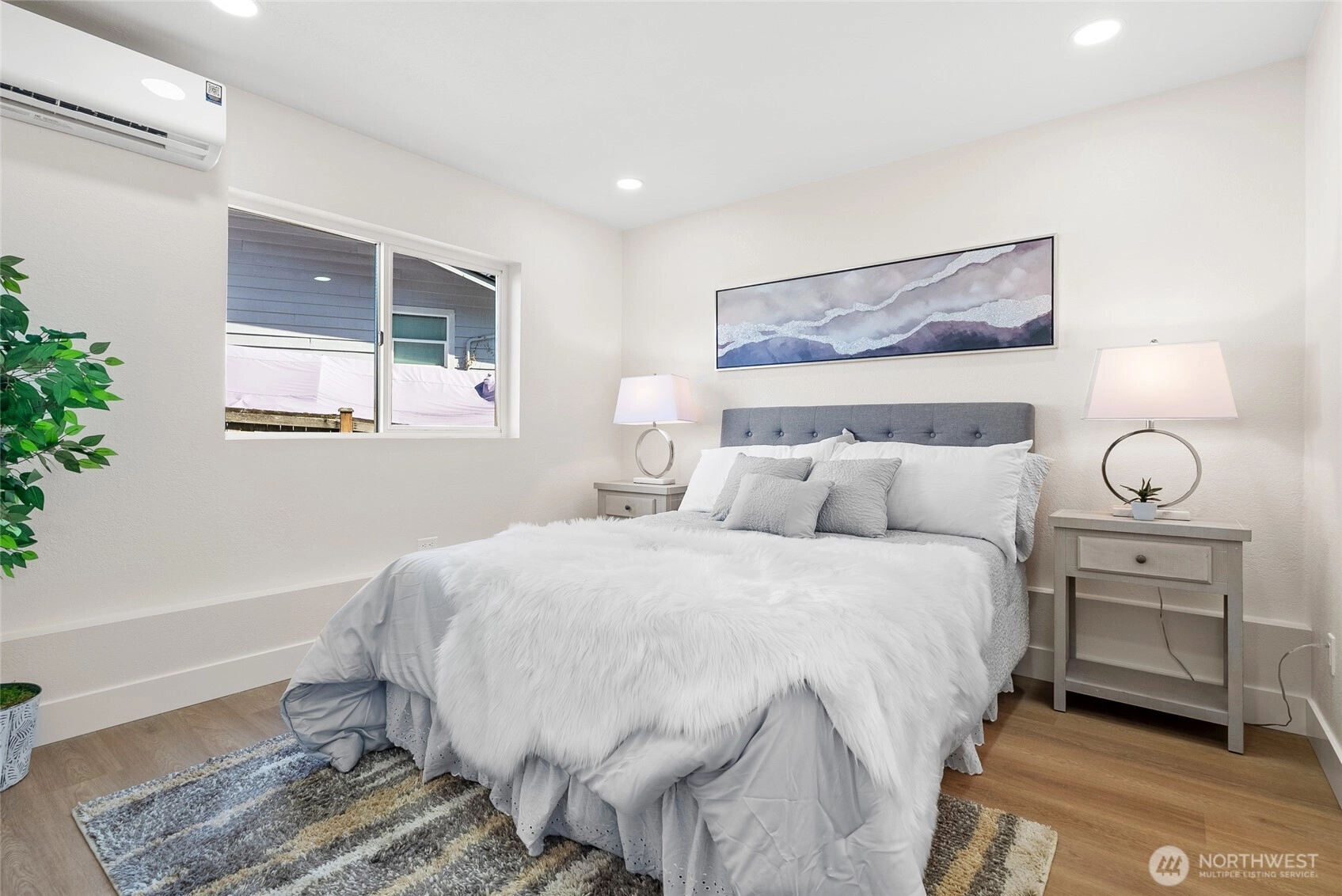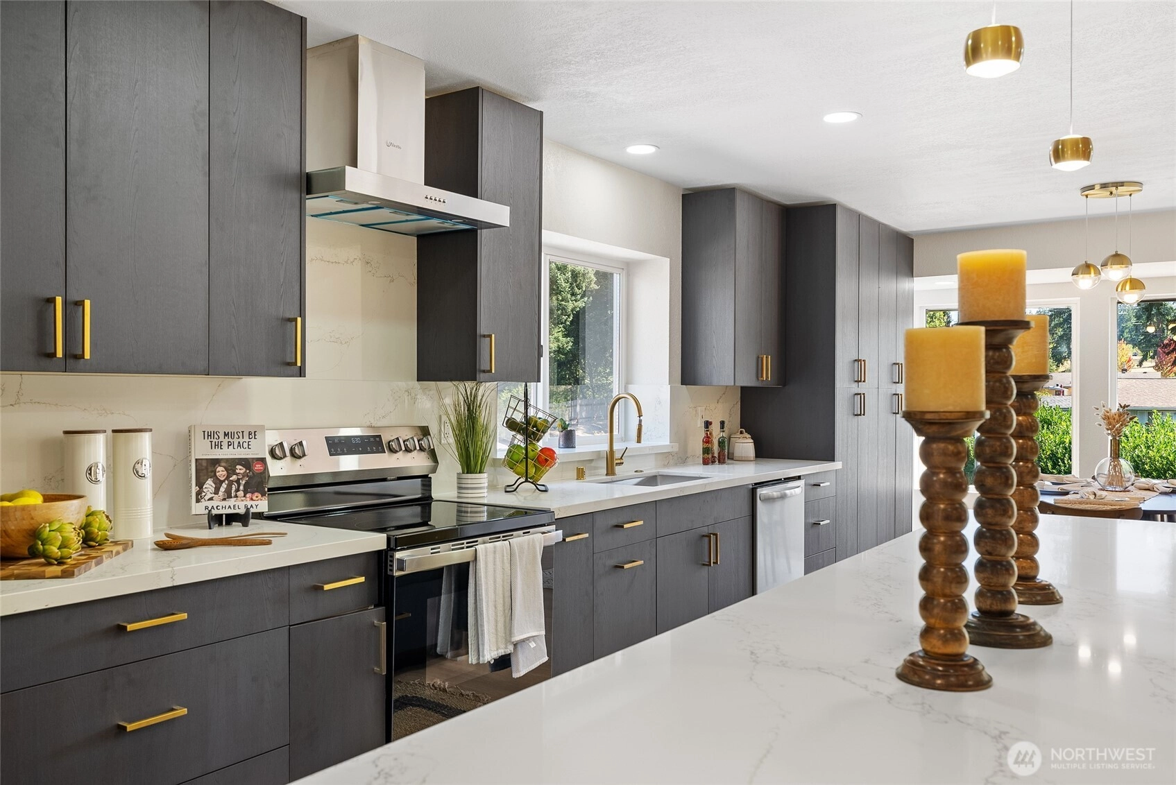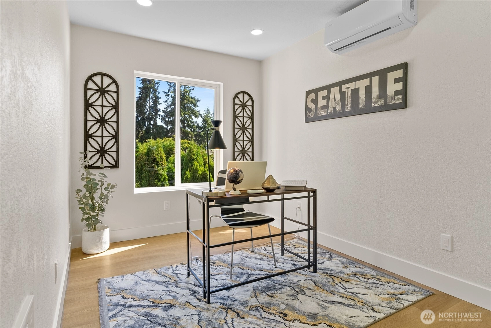 FULLY REMODELED Bothell retreat in the award-winning Northshore School District. This 3-bedroom, 2.75-bath split-level on a third of an acre offers modern comfort and flexible living. The main level features a remodeled kitchen with quartz counters, stainless appliances, sleek cabinetry, and an open living area with custom entertainment center, office/den and electric fireplace. The bay-windowed primary suite includes a walk-in tile shower and stylish finishes. The lower level provides a second living area with fireplace, bedroom, and laundry. Updates include remodeled baths, luxury vinyl flooring, fresh paint, new trim, upgraded heating, new A/C, and brand-new septic with warranty. Pre-inspected, move-in ready, includes a home warranty.