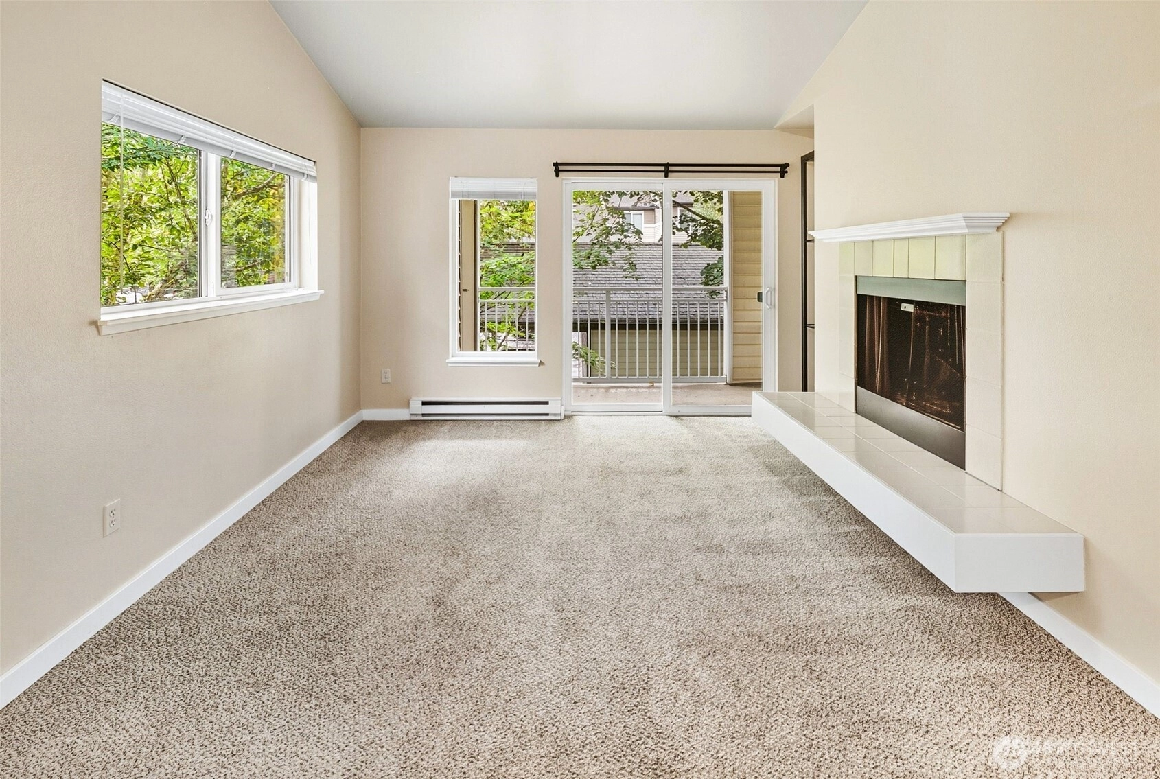 Welcome to your top-floor condo in the highly coveted Front 9 condos! This one bedroom, one bathroom open floor plan unit with its own covered parking spot right next to the unit! Bright, open living space with vaulted ceilings and a real wood-burning fireplace, seamlessly connected to the kitchen with a separate dining area. Large one bedroom with ample closet space and full primary bathroom with full sized washer and dryer! Well maintained and move-in ready! Ample amenities such as an indoor and outdoor pool, game room, gym, basketball court, clubhouse and community areas. The reserved parking spot is conveniently steps from the unit. Minutes away from the ferry, Boeing and freeways.