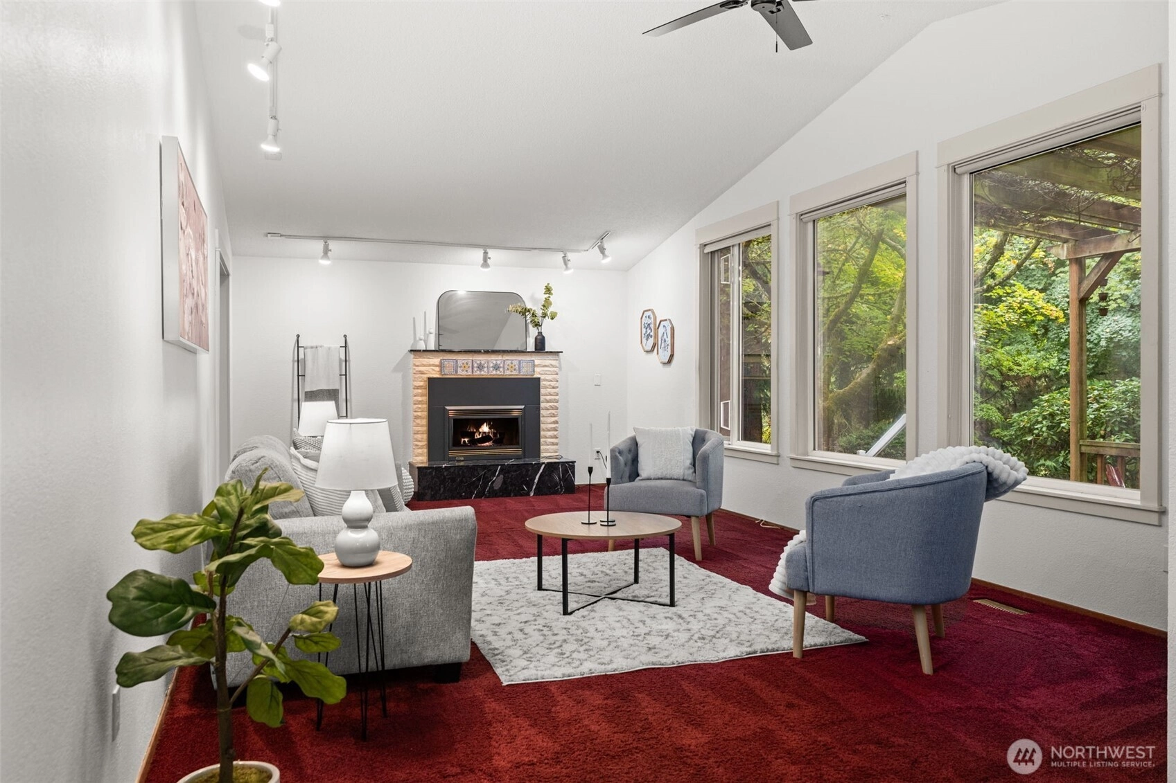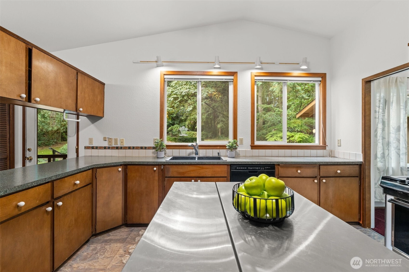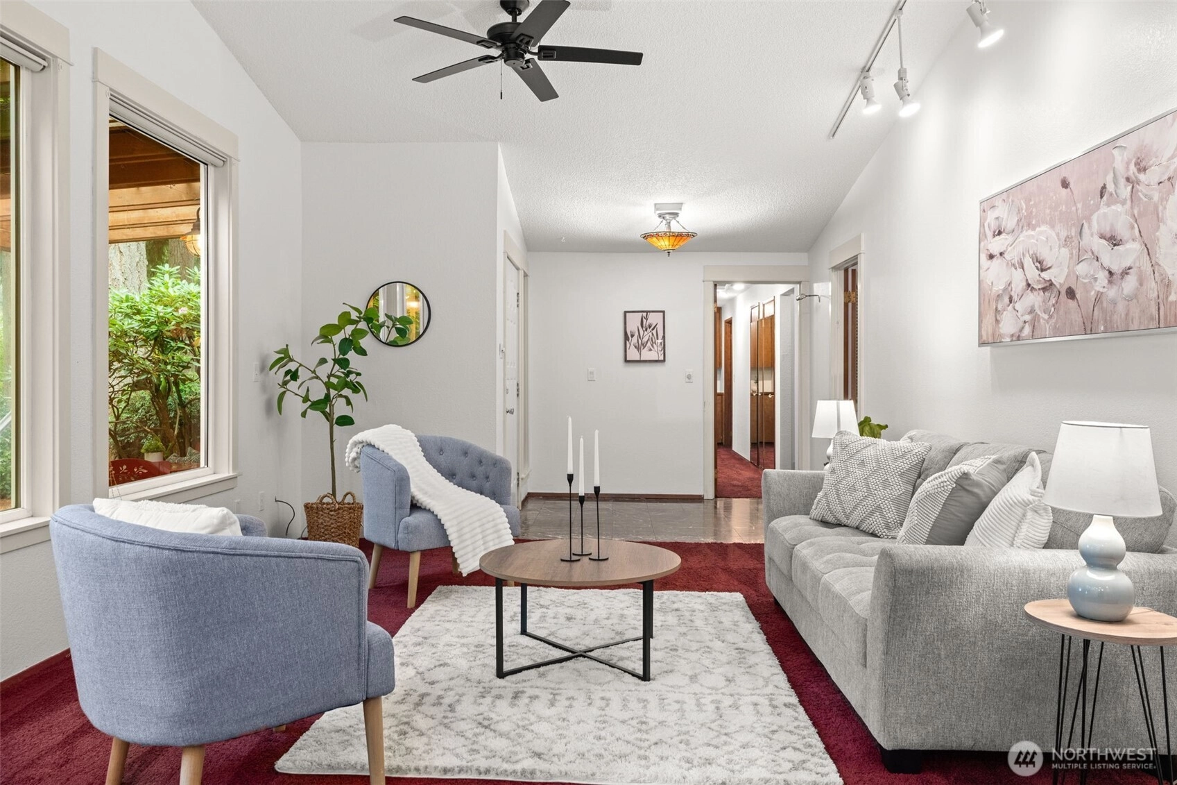 Set on 1.25 acres, this classic rambler has been lovingly cared for and is ready for your vision. Just minutes from downtown Gig Harbor, it features vaulted ceilings, a gas fireplace with marble hearth, and a wall of windows with partial Sound views. The spacious kitchen offers abundant storage and counter space, and the single-level layout makes everyday living easy. Outside, enjoy beautifully maintained grounds with a brick patio, flowering shrubs, and a vibrant garden. A three-car garage plus a carport for a small boat, along with a bonus room off the garage, add flexibility. The gated community beach club offers private waterfront access with a boat launch and playground—perfect for summer fun.