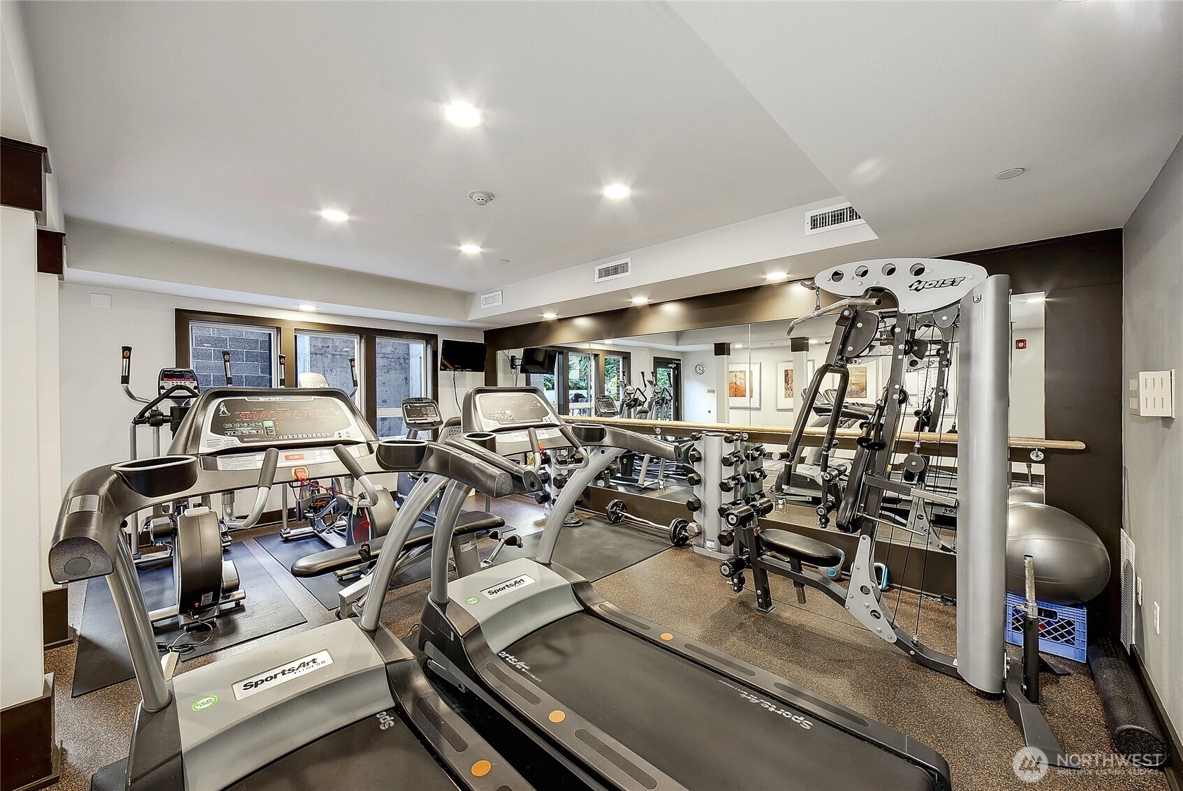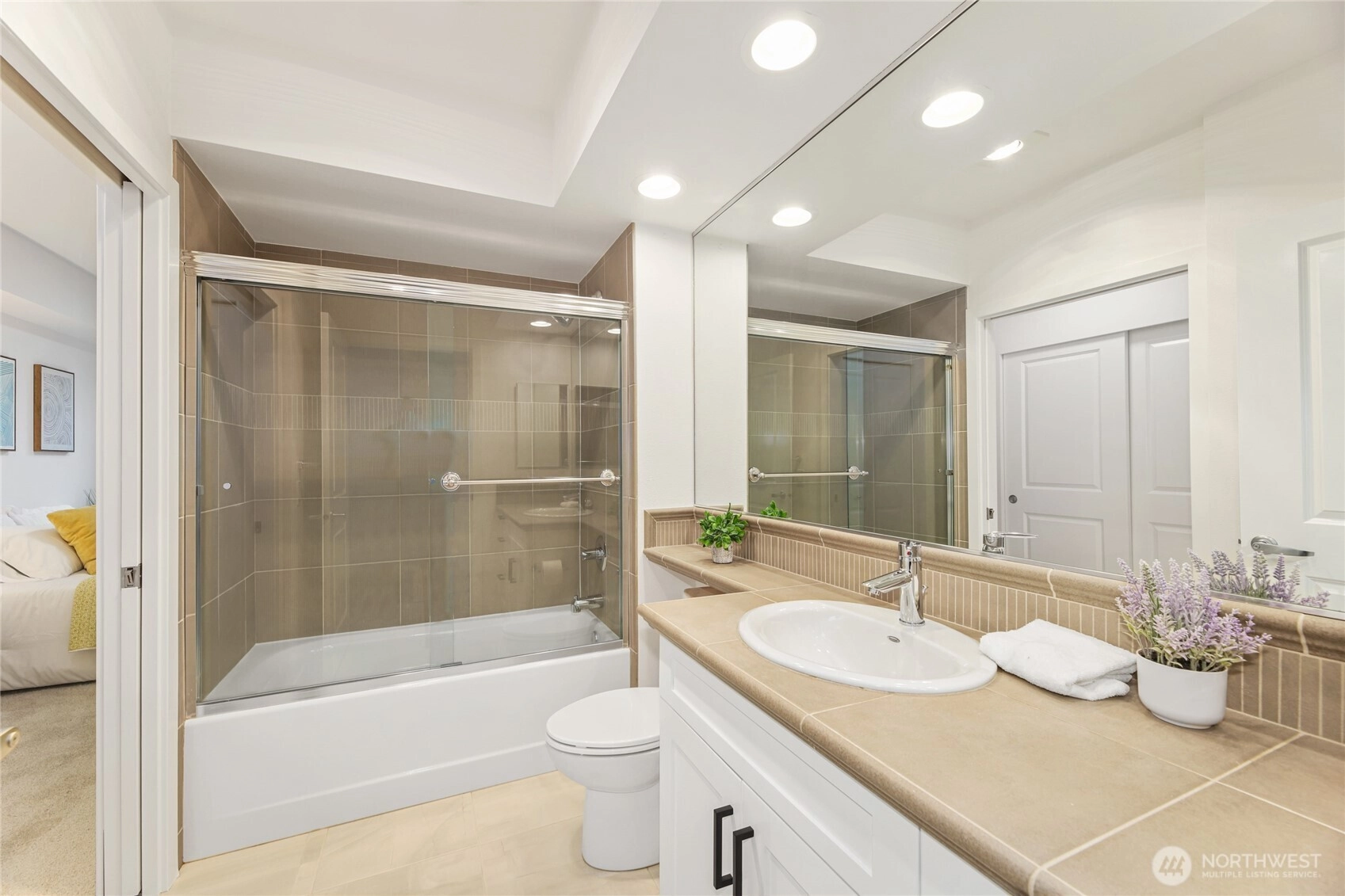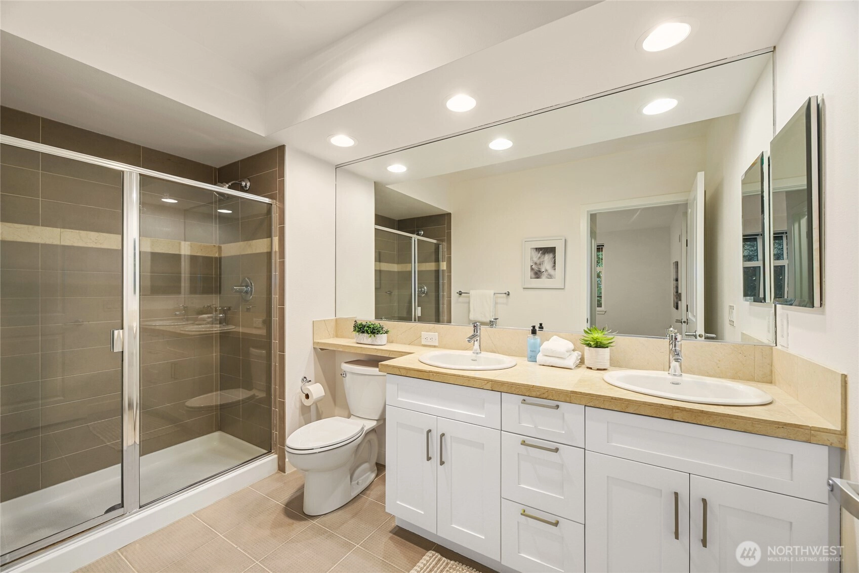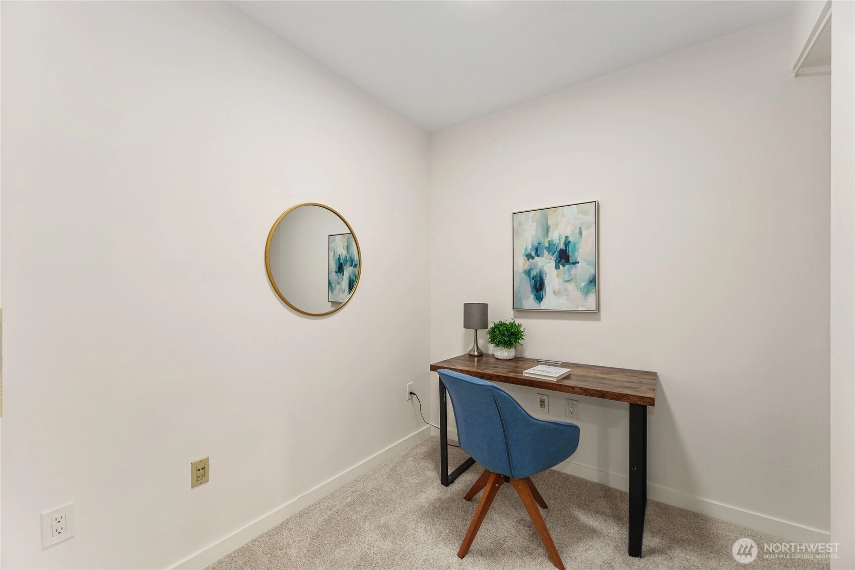 This is not your standard two bedroom condo! Completely newly renovated, this South facing condo enjoys plenty of natural sunlight and includes an additional 3rd room, ideal for your home office. Featuring a primary suite with spacious walk-in closet & 3/4 bathroom, a 2nd bedroom that has an attached full bathroom, electric fireplace, A/C unit stays to keep you cool in the summer, private South facing deck, two secure parking spaces in the common garage, a storage unit & in-unit washer & dryer. Canal Station is conveniently located in the heart of Downtown Ballard & includes resort style amenities such as concierge, fitness center, clubroom, hot tub, sauna, business center & private dog area.