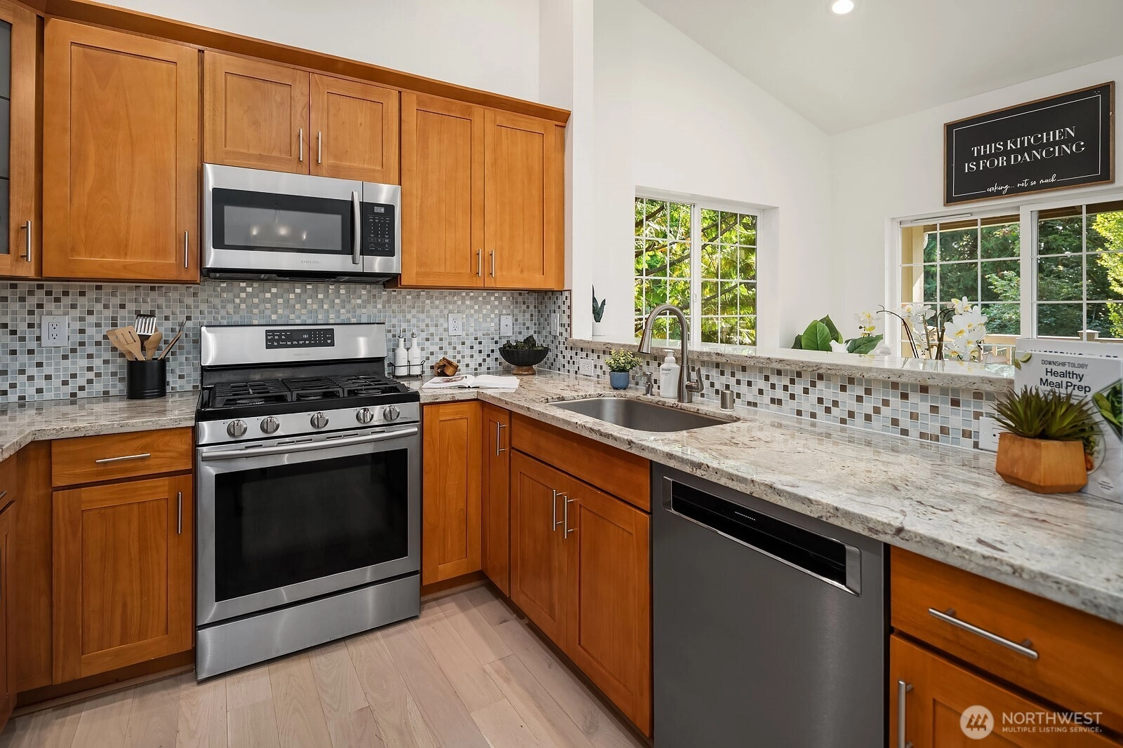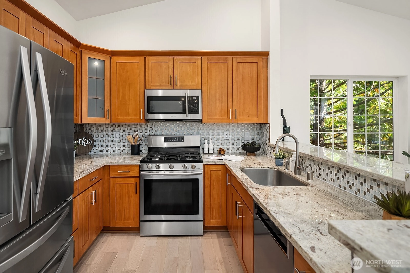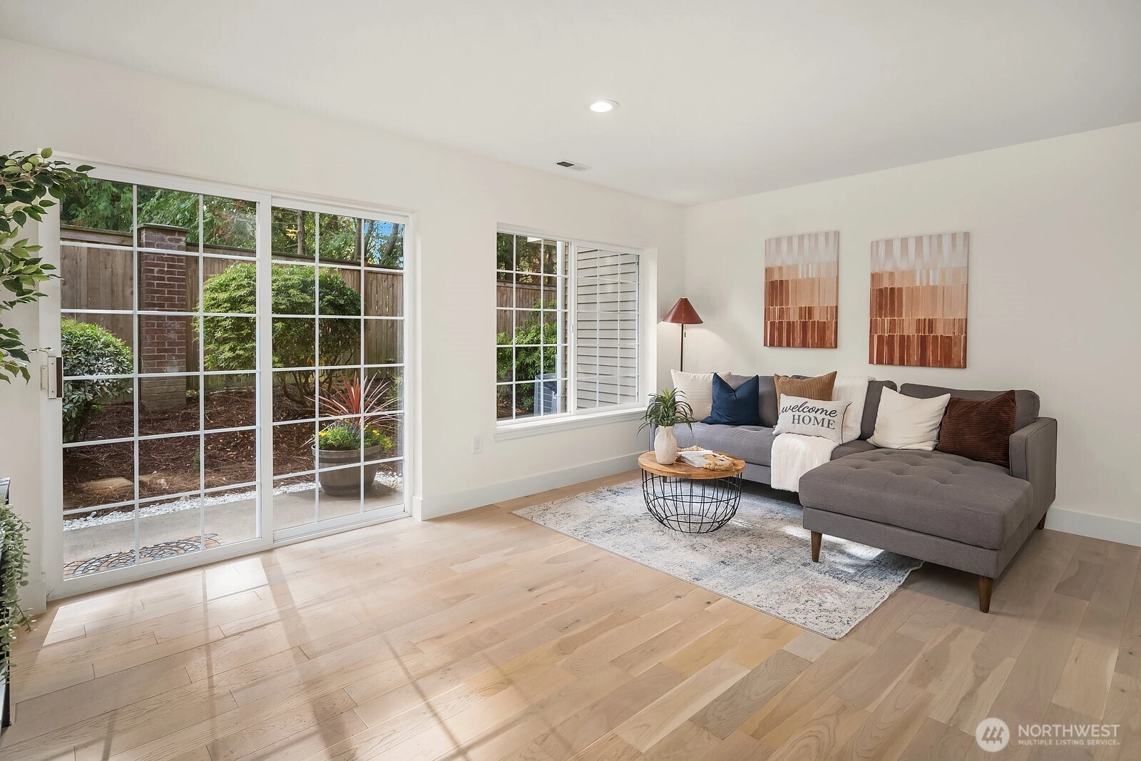Immaculate and turn-key ready, this 3-bed, 2.5-bath end-unit townhome in coveted English Cove offers 1,743 sq ft of comfort and style. The main floor is filled with natural light, featuring vaulted ceilings and a primary suite with dual walk-in closets and private balcony. The kitchen opens to dining and living areas for seamless entertaining. The lower level hosts two bedrooms, a full bath, and a spacious living area that extends to a private patio. Recent updates include fresh paint, flooring, lighting, water heater, and newer furnace. A 2-car epoxy-finished garage adds ease. Enjoy LWSD schools, community amenities, and a prime location near 520, Marymoor Park, trails, dining, and future Light Rail.