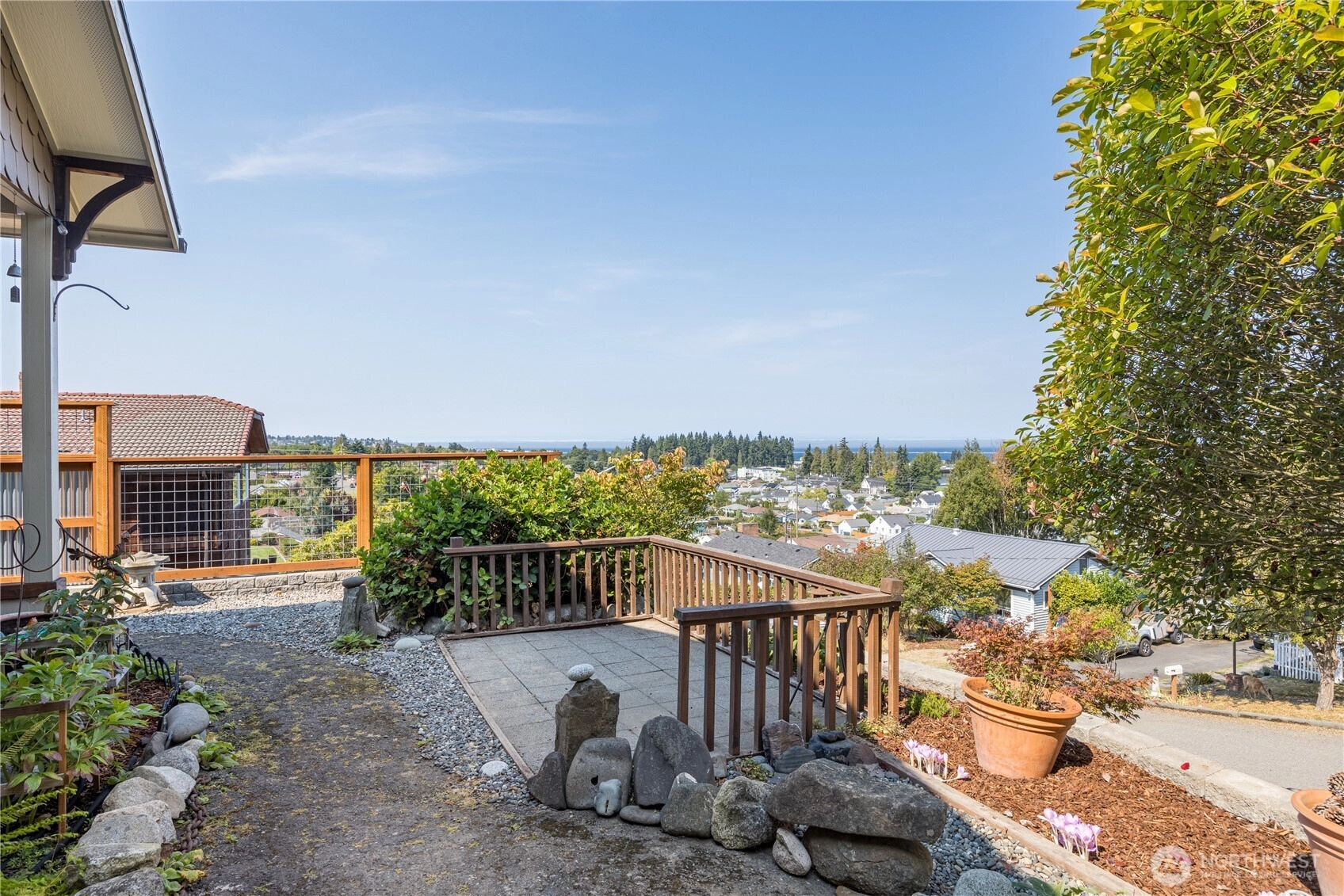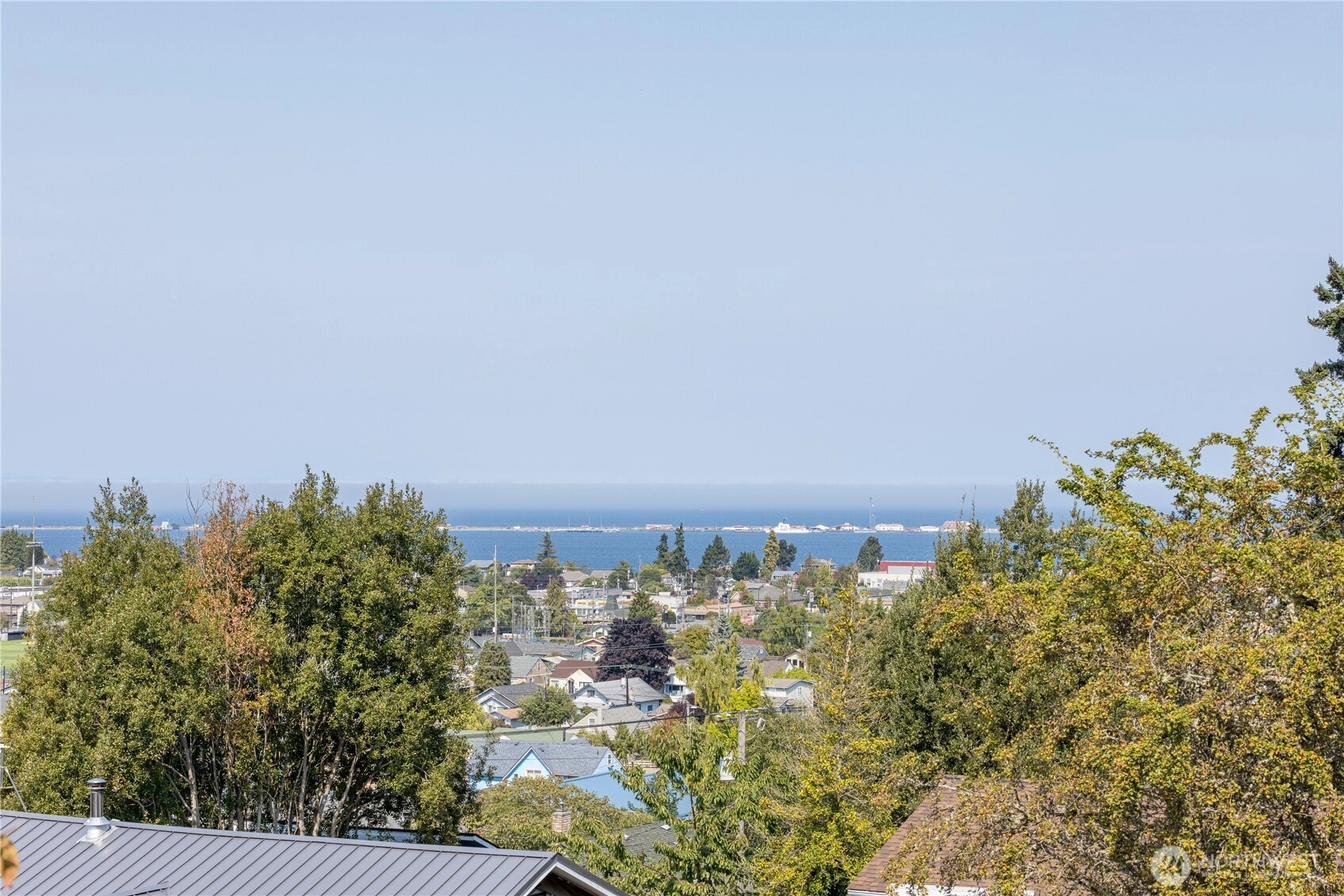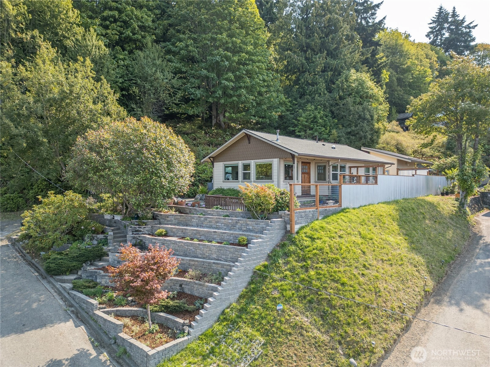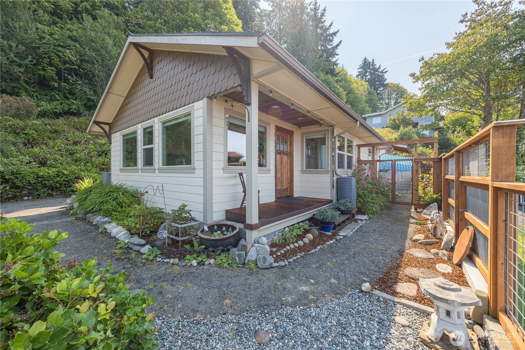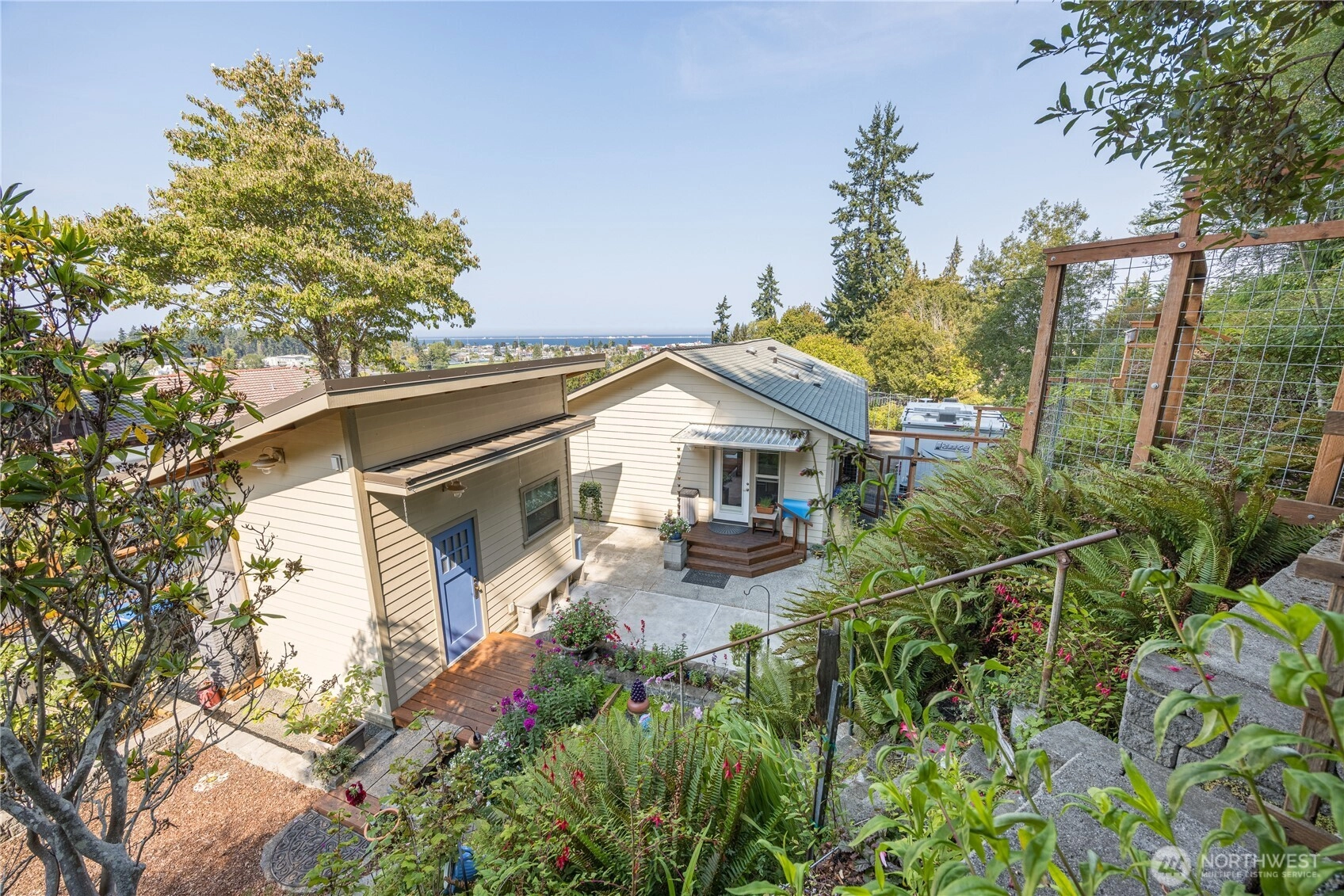 Nestled on a quiet dead-end street, this beautifully renovated home boasts unobstructed harbor and Strait views, a private south patio, and direct adjacency to Webster Woods Art Park. Fully landscaped with deer-proof fencing and hanging gardens, it features hardy board siding, dual-pane windows with alder sills, vaulted ceilings, hardwood floors, wool-carpeted bedroom, and abundant natural light from skylights and sun tunnels. Upgraded plumbing and wiring support modern comforts including a ductless mini split, pellet stove, and on-demand hot water. The remodeled kitchen offers custom maple cabinets, quartz countertops, composite sinks, under-cabinet lighting, and premium KitchenAid and Bosch appliances. Turn key!!