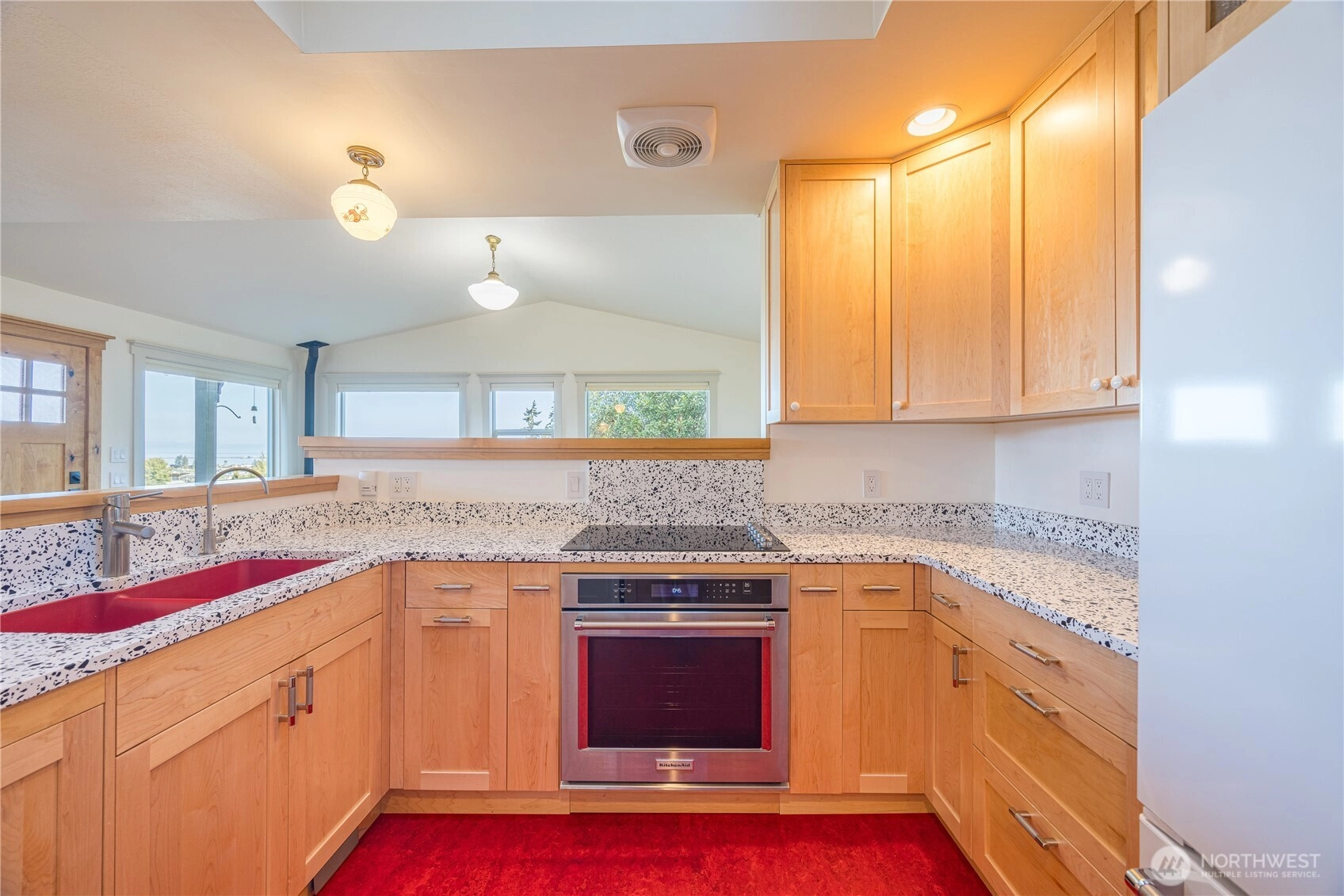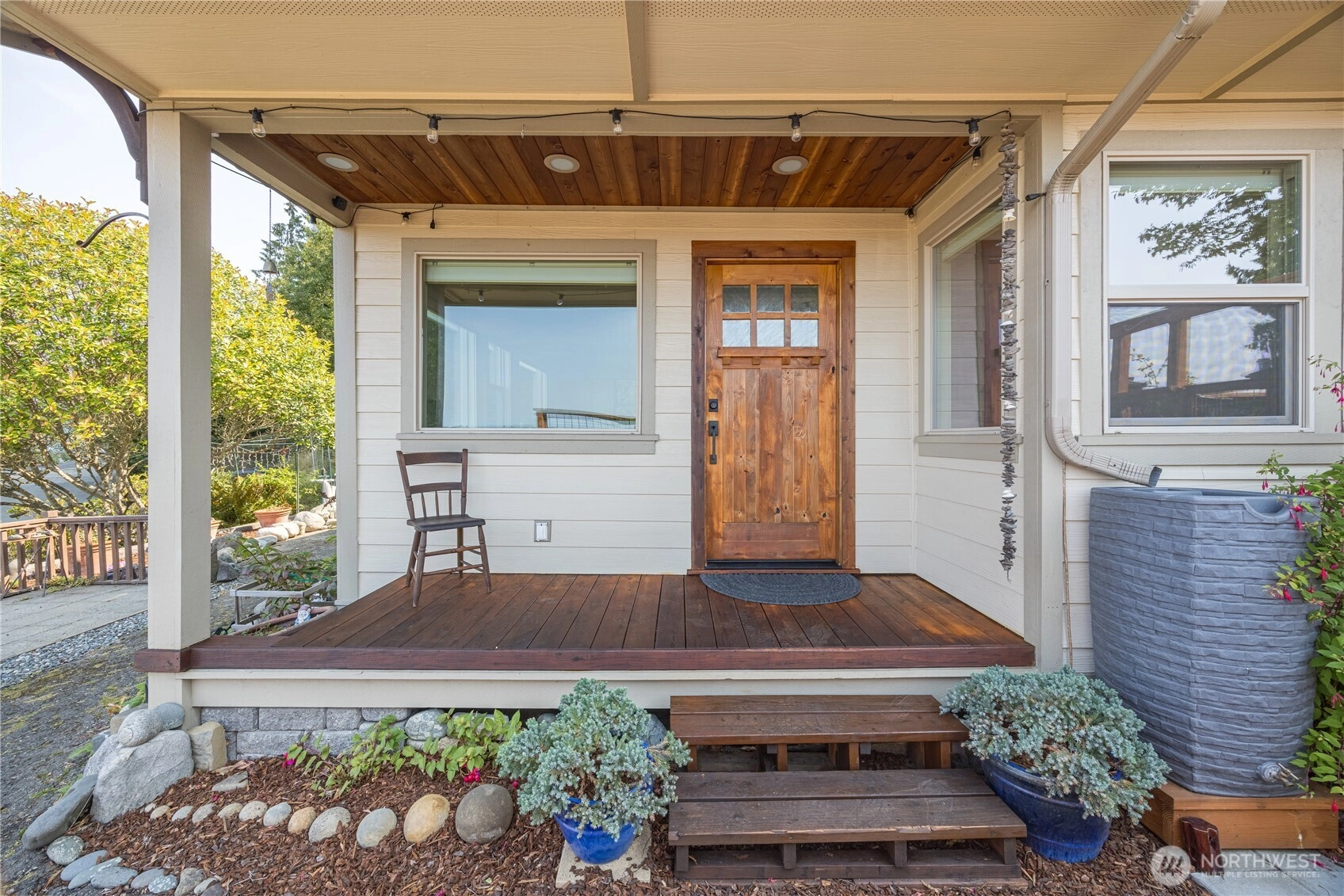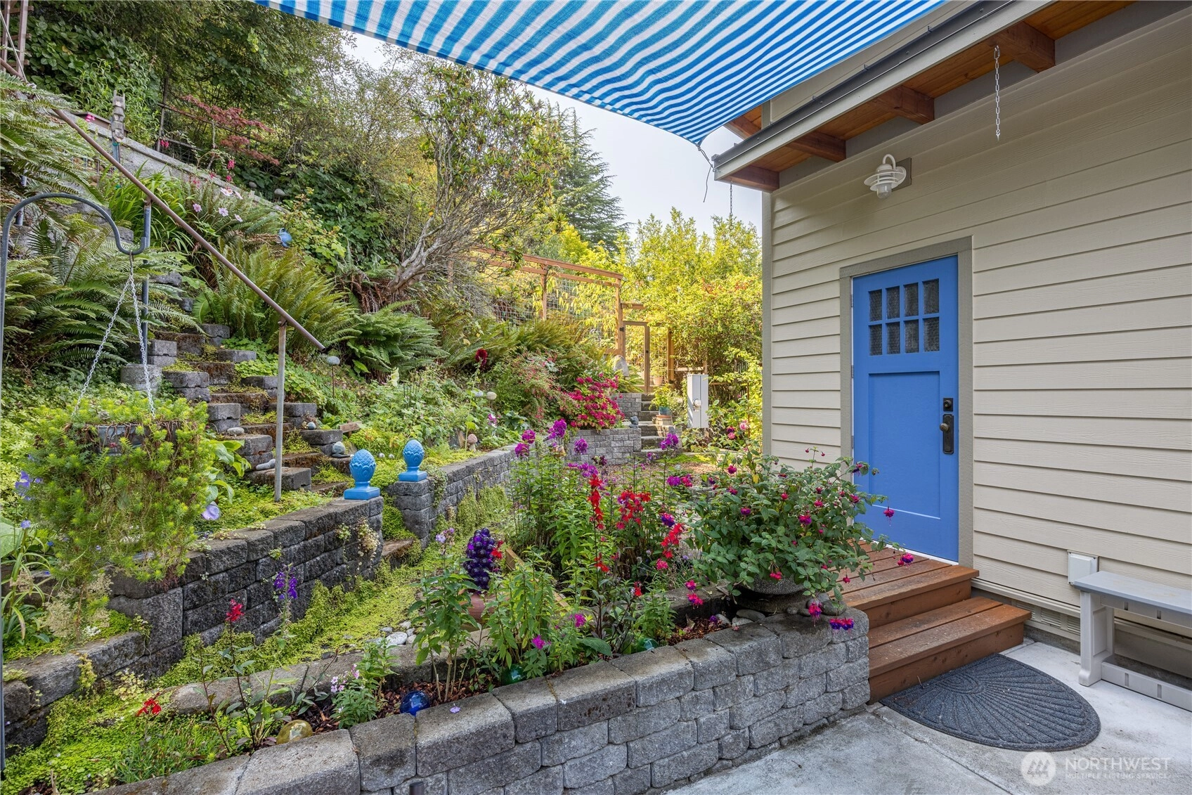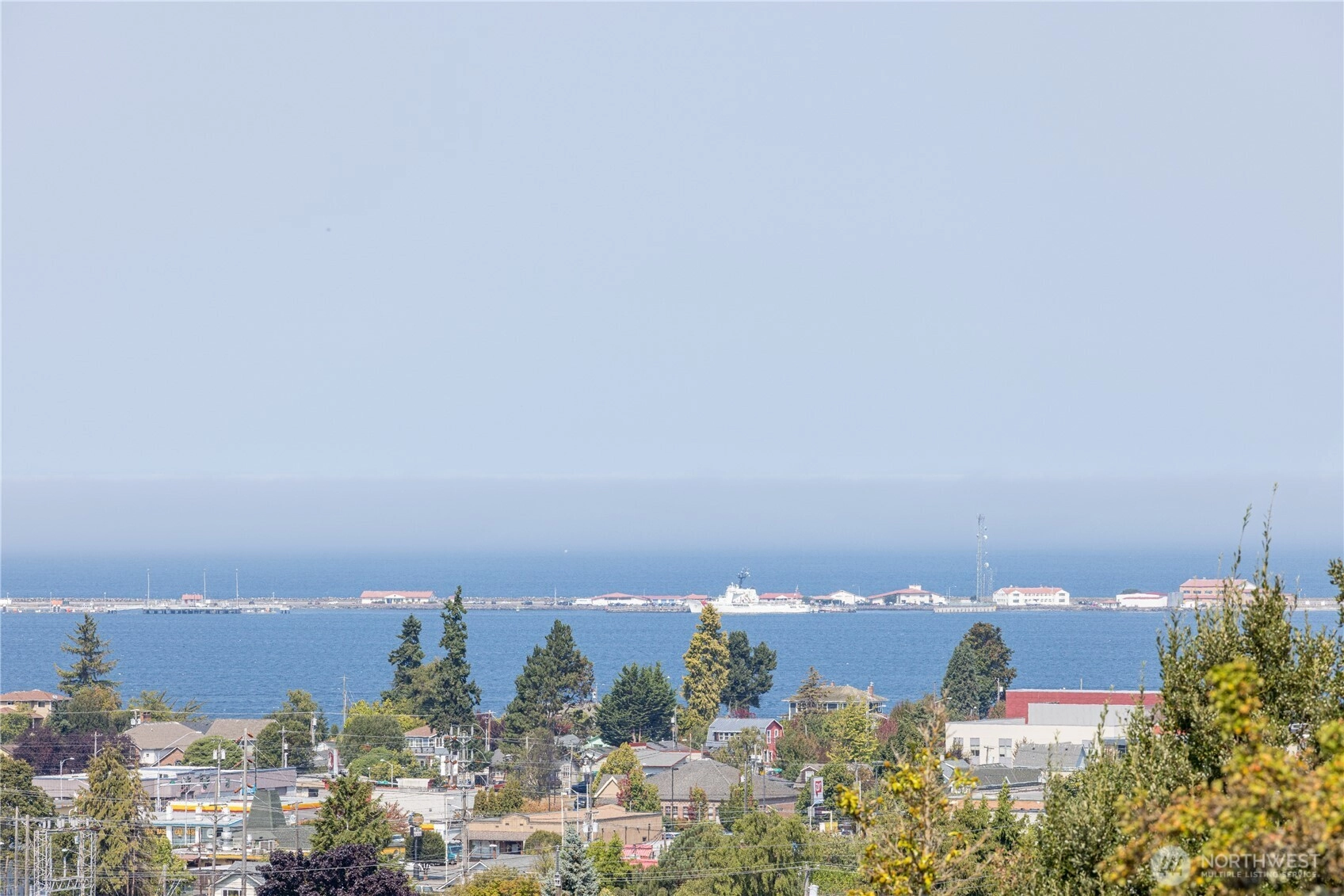 Nestled on a quiet dead-end street, this beautifully renovated home boasts unobstructed harbor and Strait views, a private south patio, and direct adjacency to Webster Woods Art Park. Fully landscaped with deer-proof fencing and hanging gardens, it features hardy board siding, dual-pane windows with alder sills, vaulted ceilings, hardwood floors, wool-carpeted bedroom, and abundant natural light from skylights and sun tunnels. Upgraded plumbing and wiring support modern comforts including a ductless mini split, pellet stove, and on-demand hot water. The remodeled kitchen offers custom maple cabinets, quartz countertops, composite sinks, under-cabinet lighting, and premium KitchenAid and Bosch appliances. Turn key!!