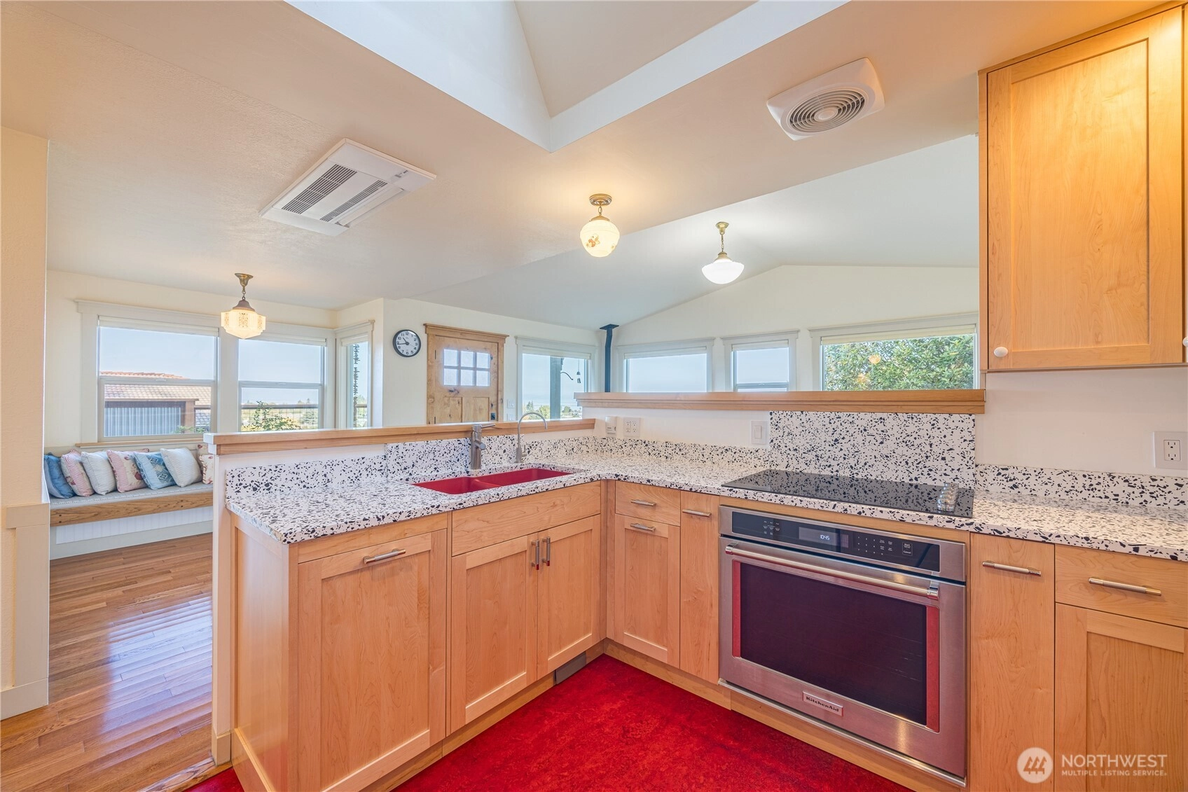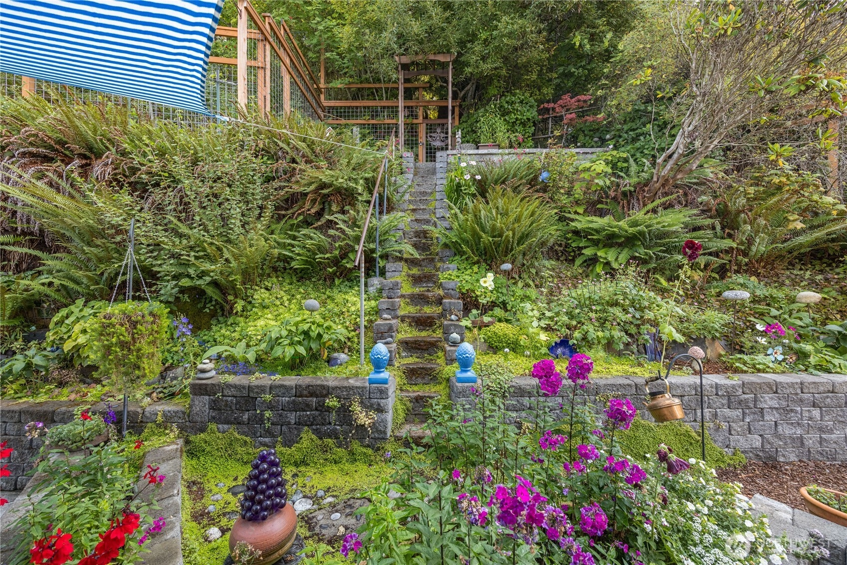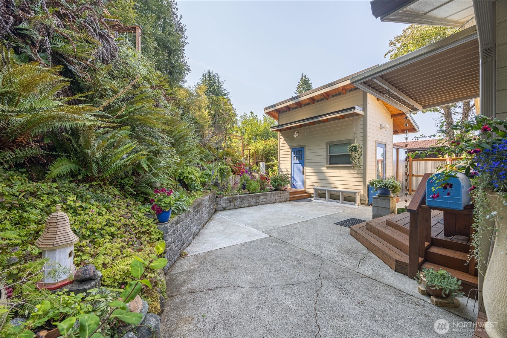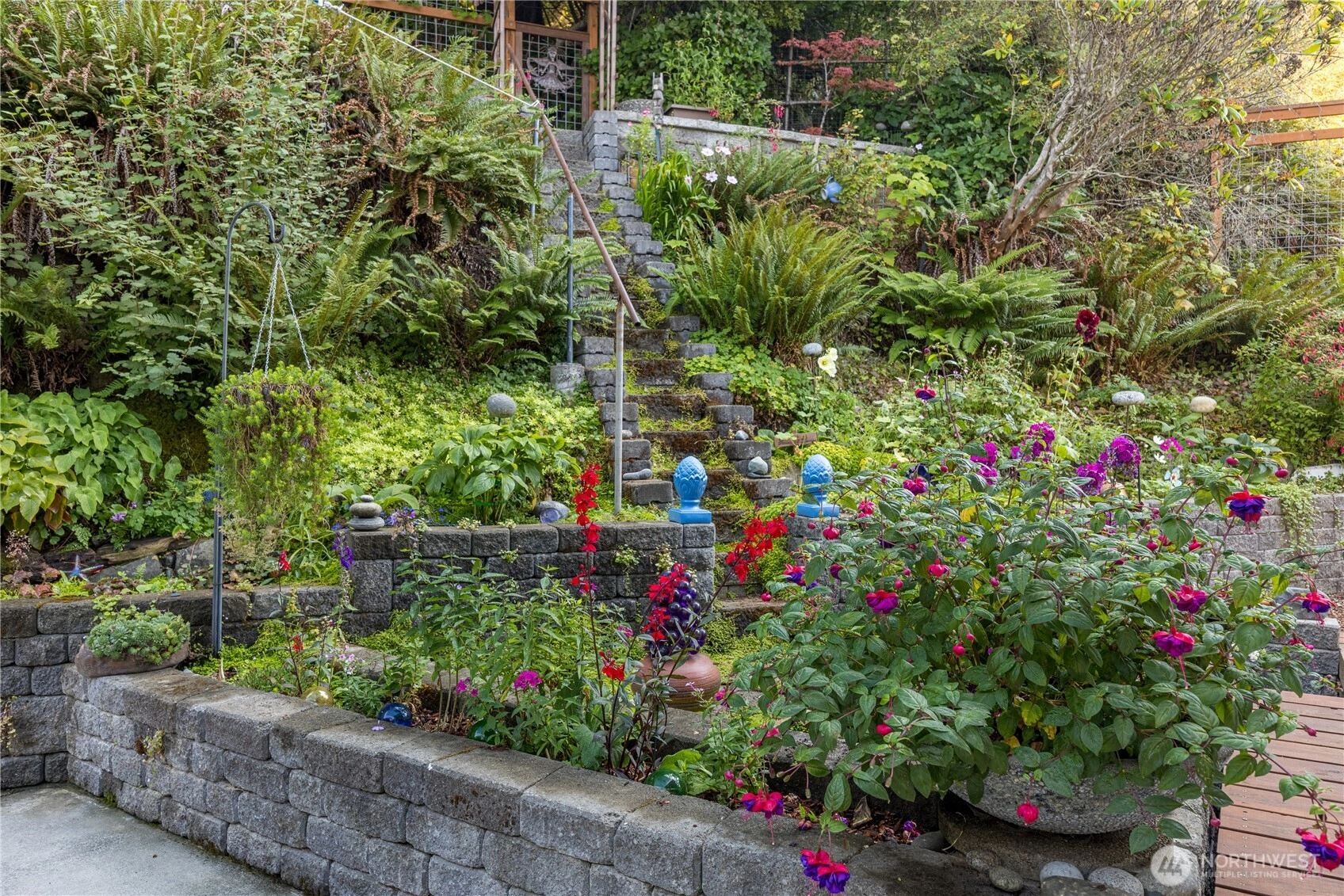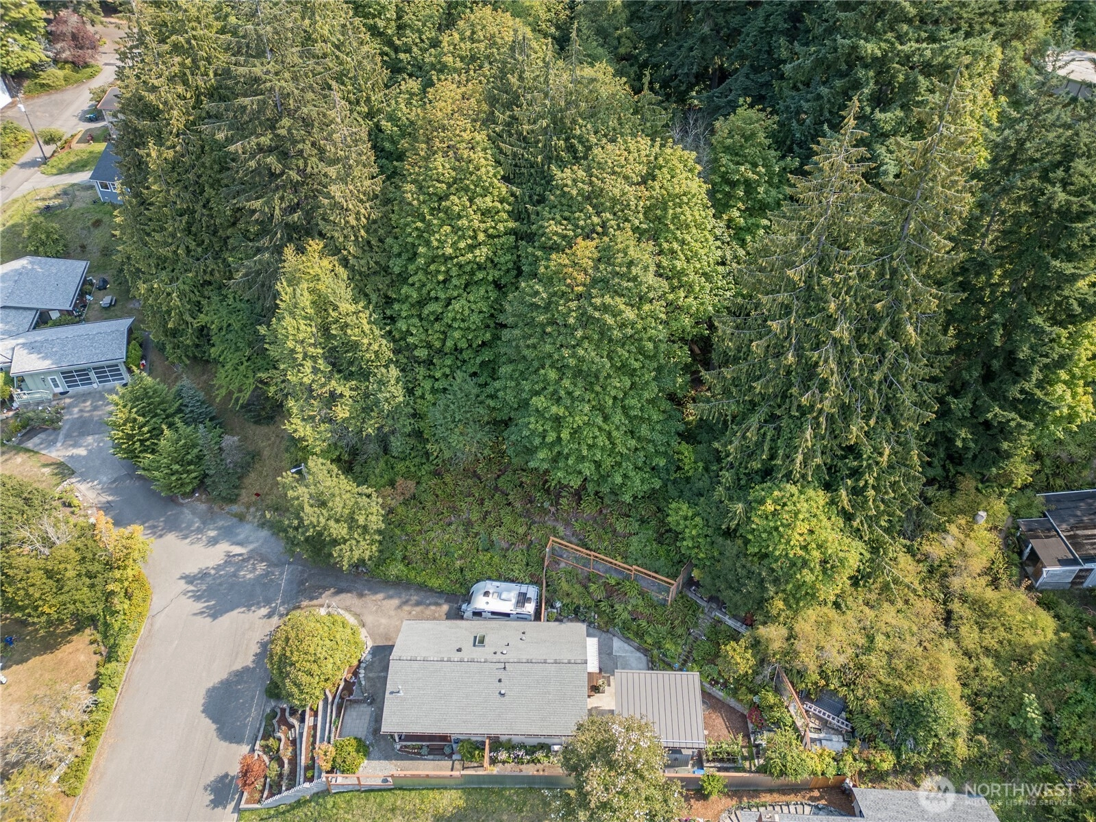 Nestled on a quiet dead-end street, this beautifully renovated home boasts unobstructed harbor and Strait views, a private south patio, and direct adjacency to Webster Woods Art Park. Fully landscaped with deer-proof fencing and hanging gardens, it features hardy board siding, dual-pane windows with alder sills, vaulted ceilings, hardwood floors, wool-carpeted bedroom, and abundant natural light from skylights and sun tunnels. Upgraded plumbing and wiring support modern comforts including a ductless mini split, pellet stove, and on-demand hot water. The remodeled kitchen offers custom maple cabinets, quartz countertops, composite sinks, under-cabinet lighting, and premium KitchenAid and Bosch appliances. Turn key!!