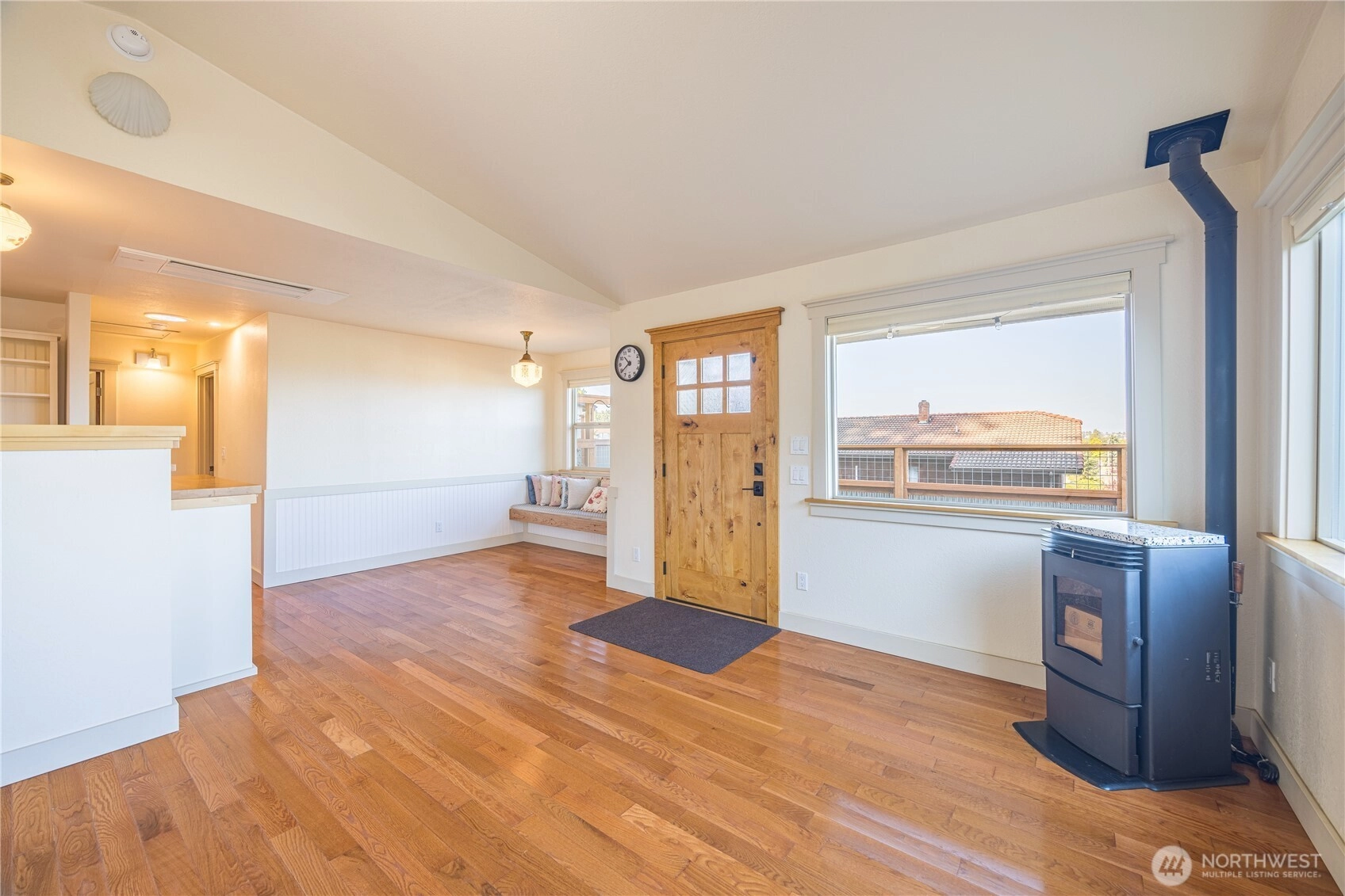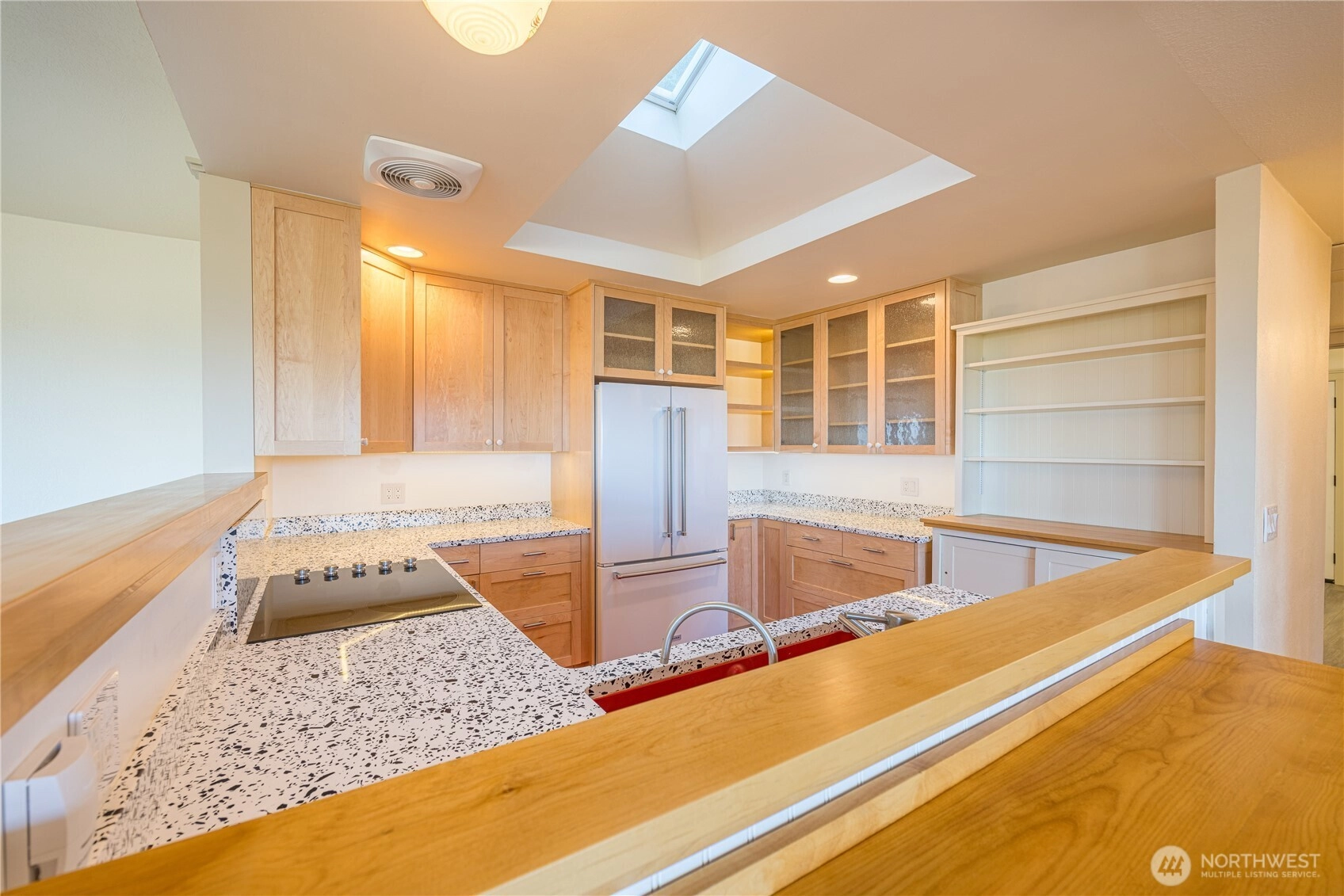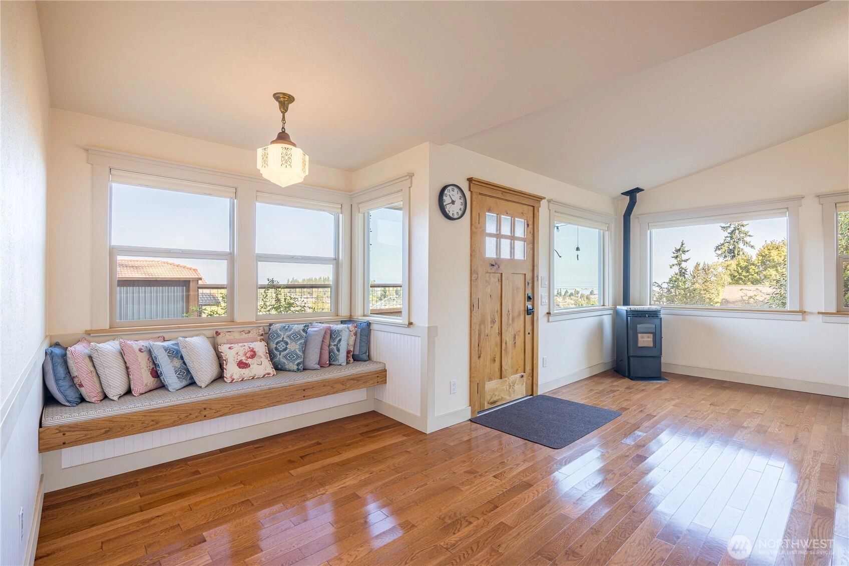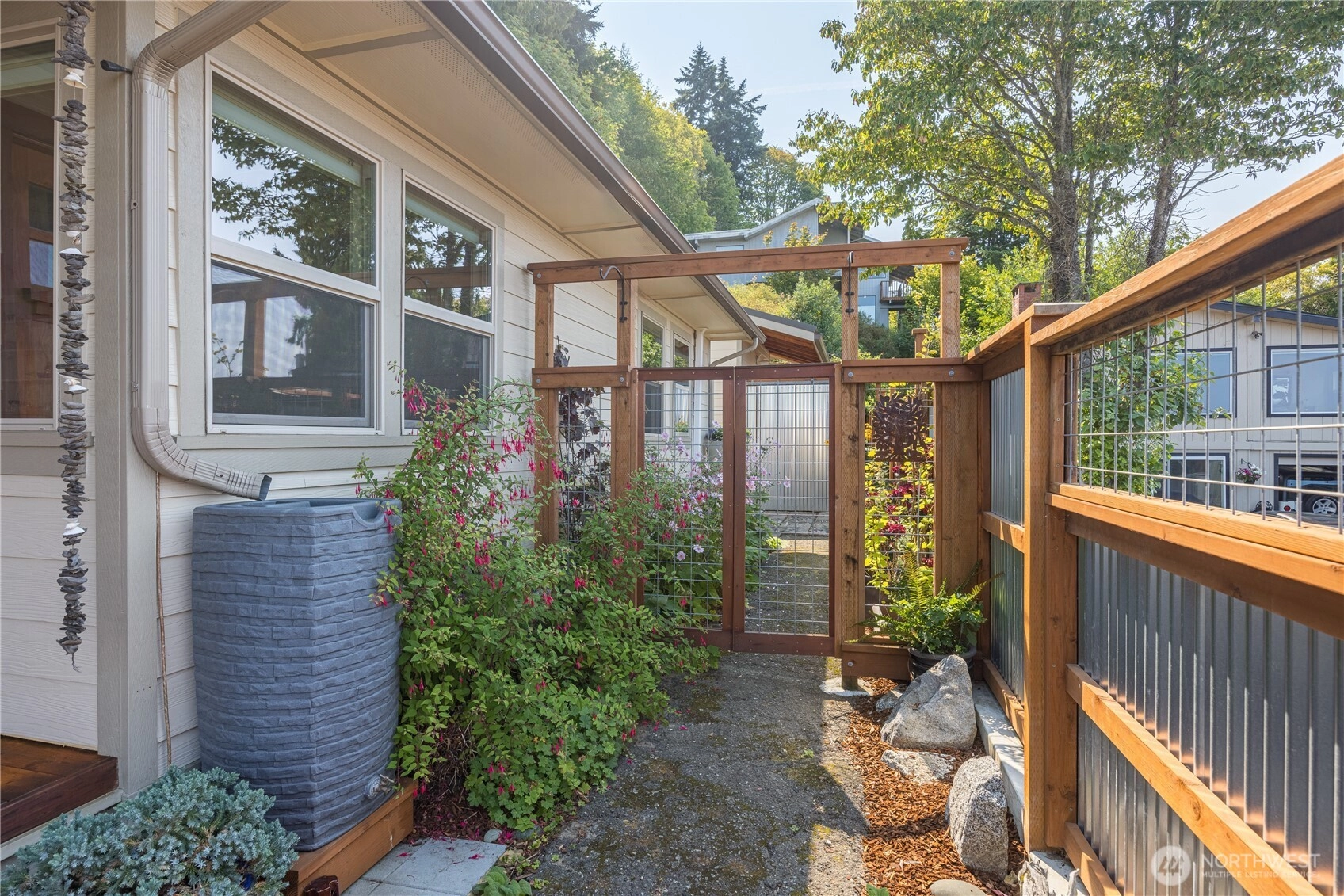 Nestled on a quiet dead-end street, this beautifully renovated home boasts unobstructed harbor and Strait views, a private south patio, and direct adjacency to Webster Woods Art Park. Fully landscaped with deer-proof fencing and hanging gardens, it features hardy board siding, dual-pane windows with alder sills, vaulted ceilings, hardwood floors, wool-carpeted bedroom, and abundant natural light from skylights and sun tunnels. Upgraded plumbing and wiring support modern comforts including a ductless mini split, pellet stove, and on-demand hot water. The remodeled kitchen offers custom maple cabinets, quartz countertops, composite sinks, under-cabinet lighting, and premium KitchenAid and Bosch appliances. Turn key!!