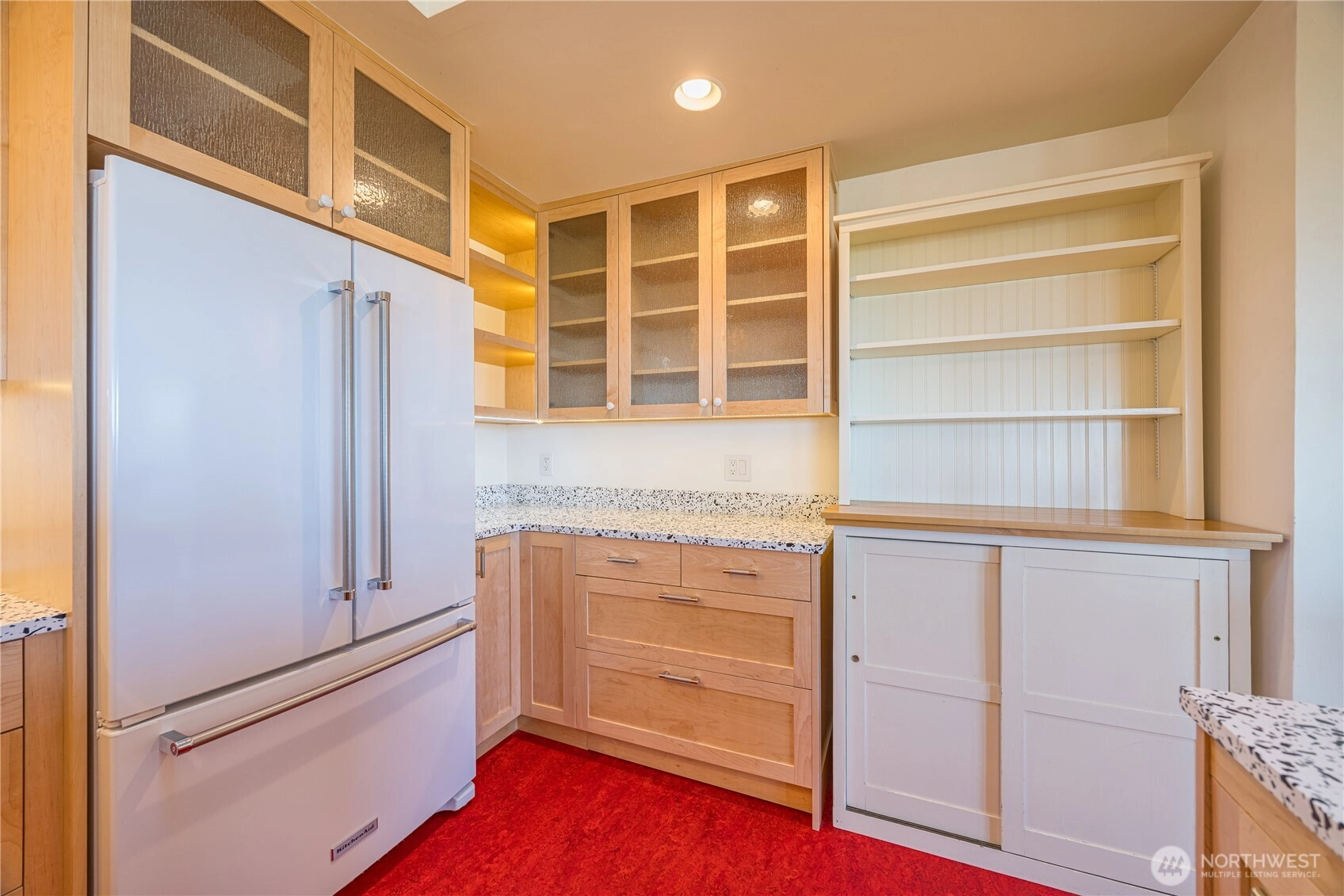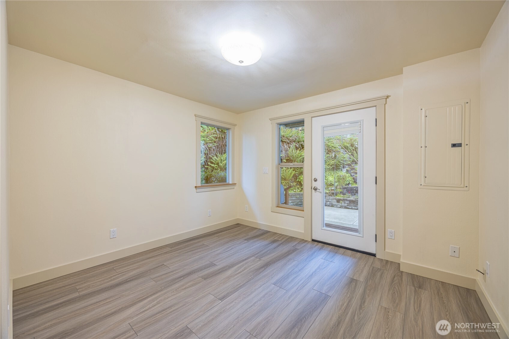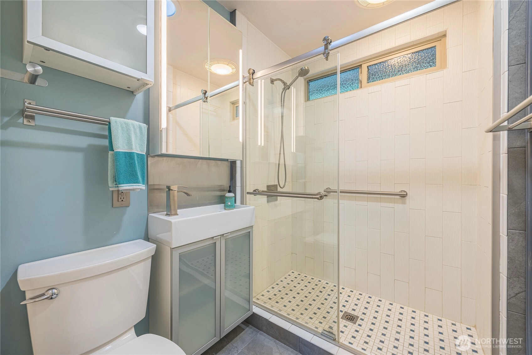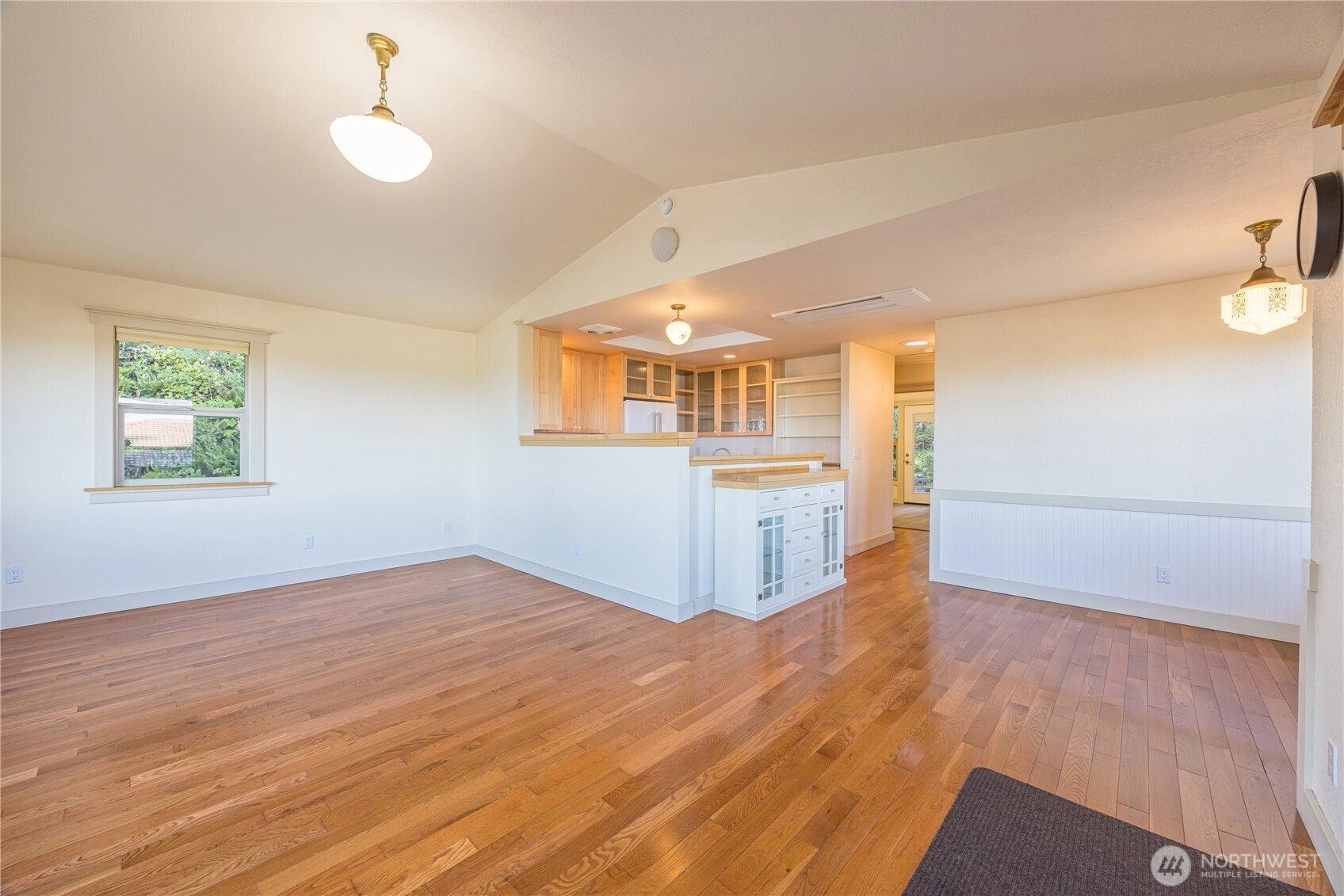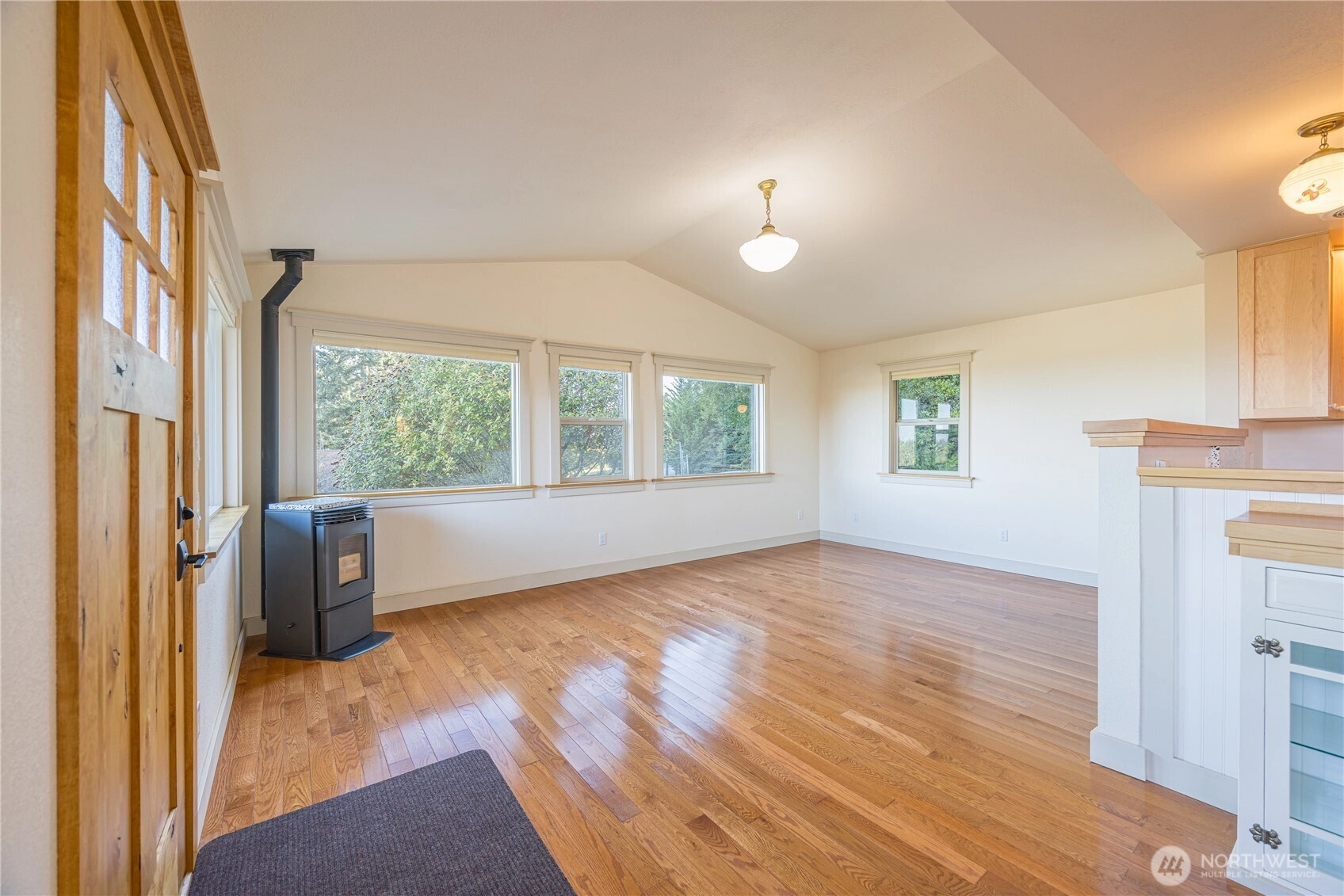 Nestled on a quiet dead-end street, this beautifully renovated home boasts unobstructed harbor and Strait views, a private south patio, and direct adjacency to Webster Woods Art Park. Fully landscaped with deer-proof fencing and hanging gardens, it features hardy board siding, dual-pane windows with alder sills, vaulted ceilings, hardwood floors, wool-carpeted bedroom, and abundant natural light from skylights and sun tunnels. Upgraded plumbing and wiring support modern comforts including a ductless mini split, pellet stove, and on-demand hot water. The remodeled kitchen offers custom maple cabinets, quartz countertops, composite sinks, under-cabinet lighting, and premium KitchenAid and Bosch appliances. Turn key!!